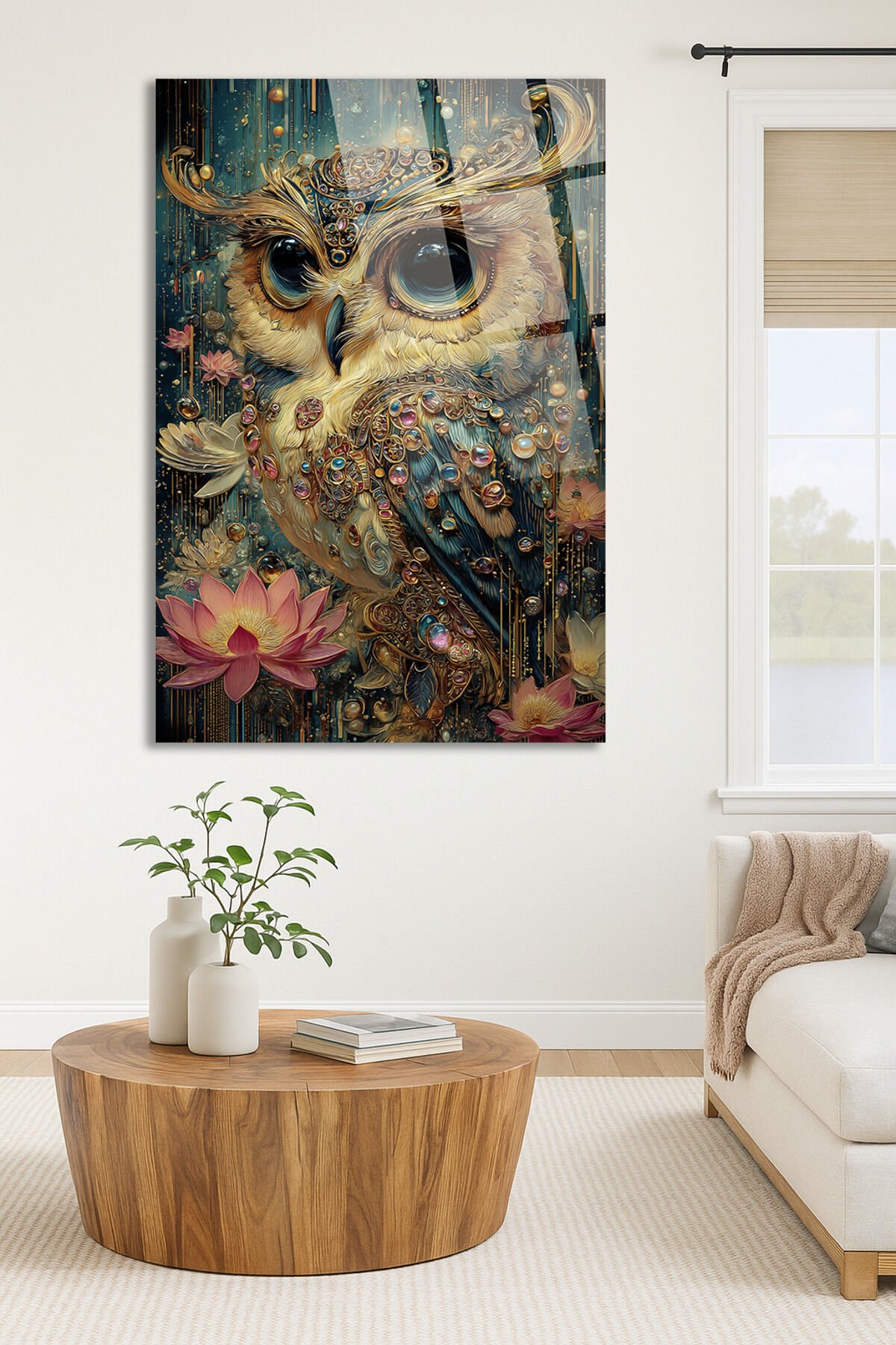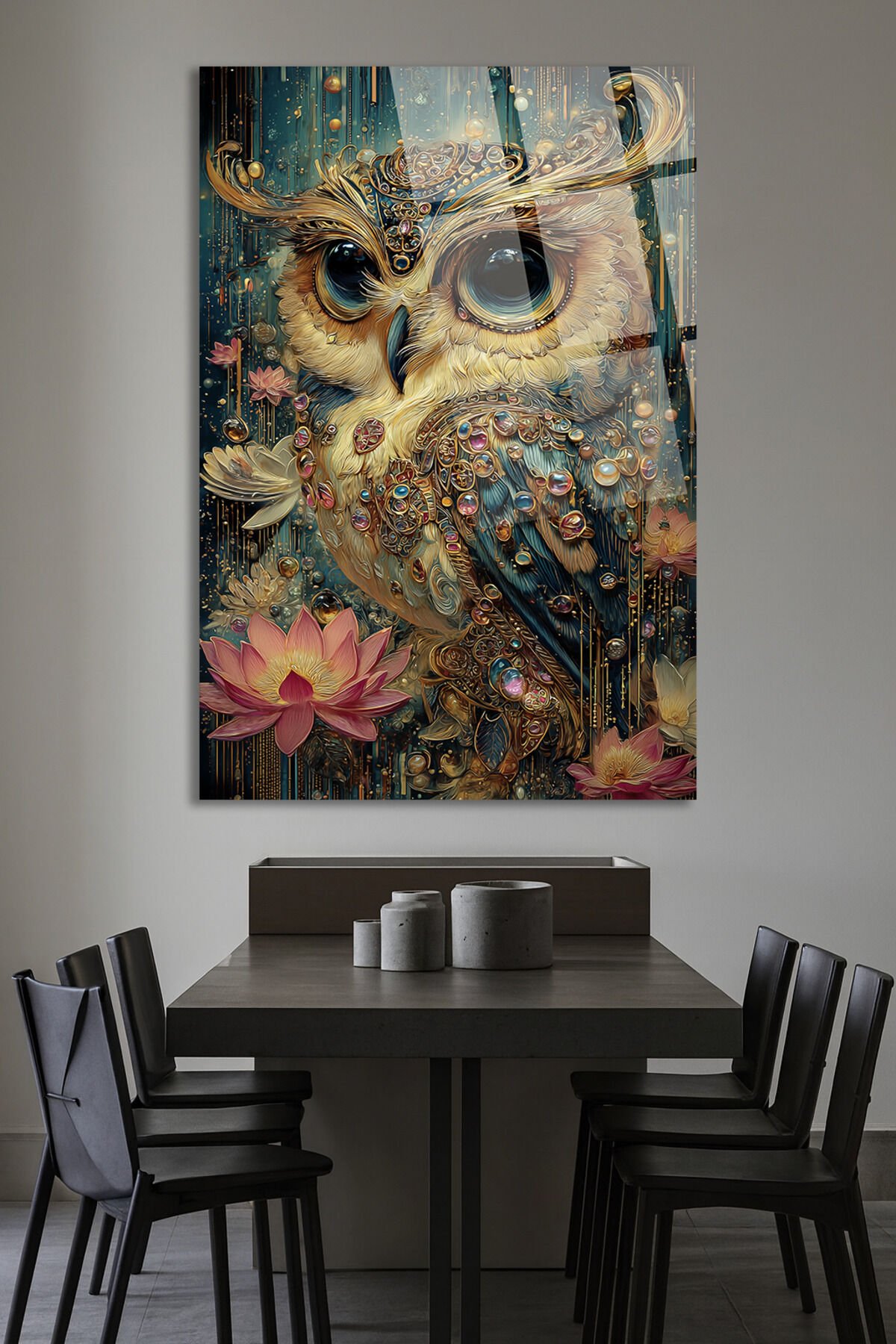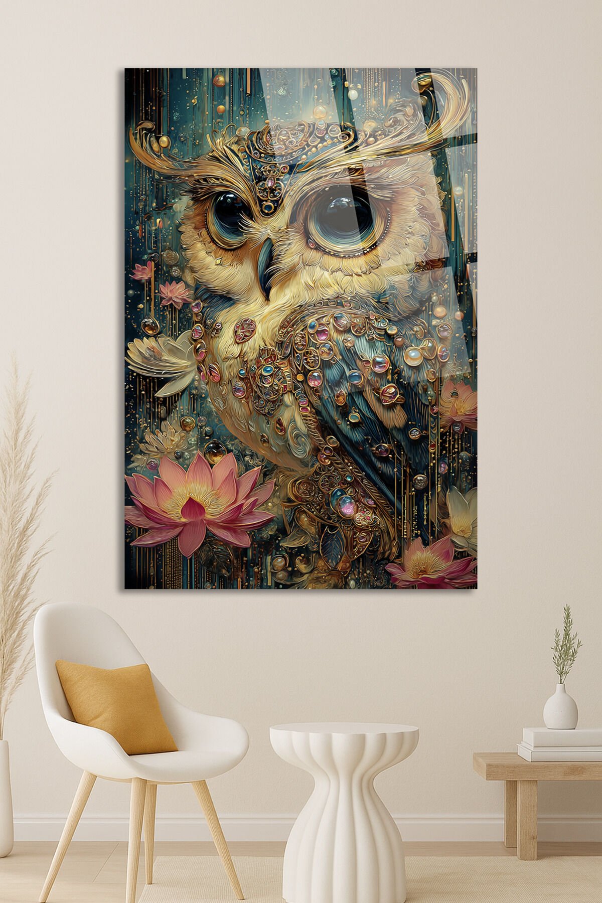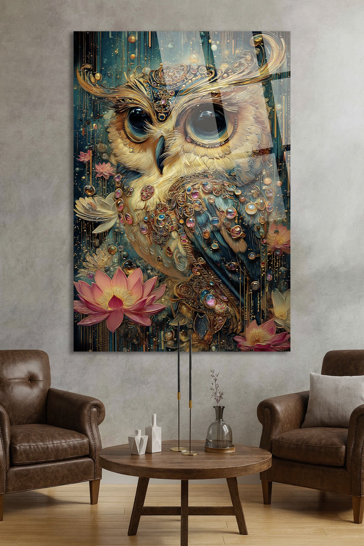 MÜCEVHER DETAYLI BAYKUŞ VE LOTUS ÇİÇEĞİ SANATSAL EV HEDİYESİ TABLO Turkuaz