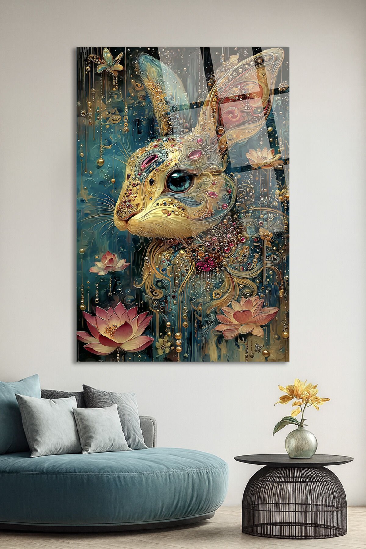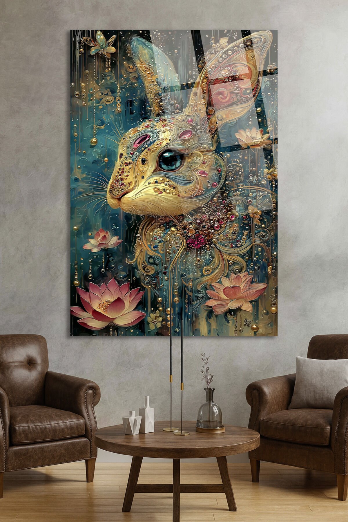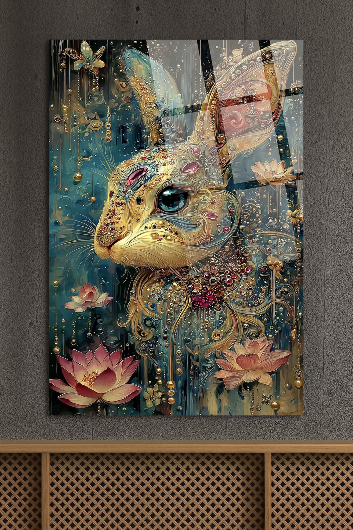 Mücevher İşlemeli Lotus Çiçekli Tavşan Sanat Tasarımı Kırılmaz Lüks Cam Tablo Turkuaz