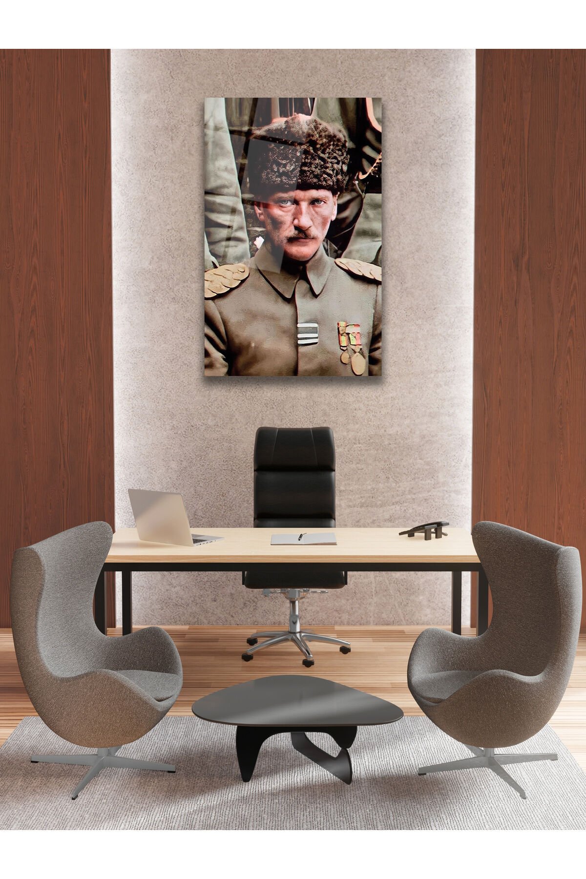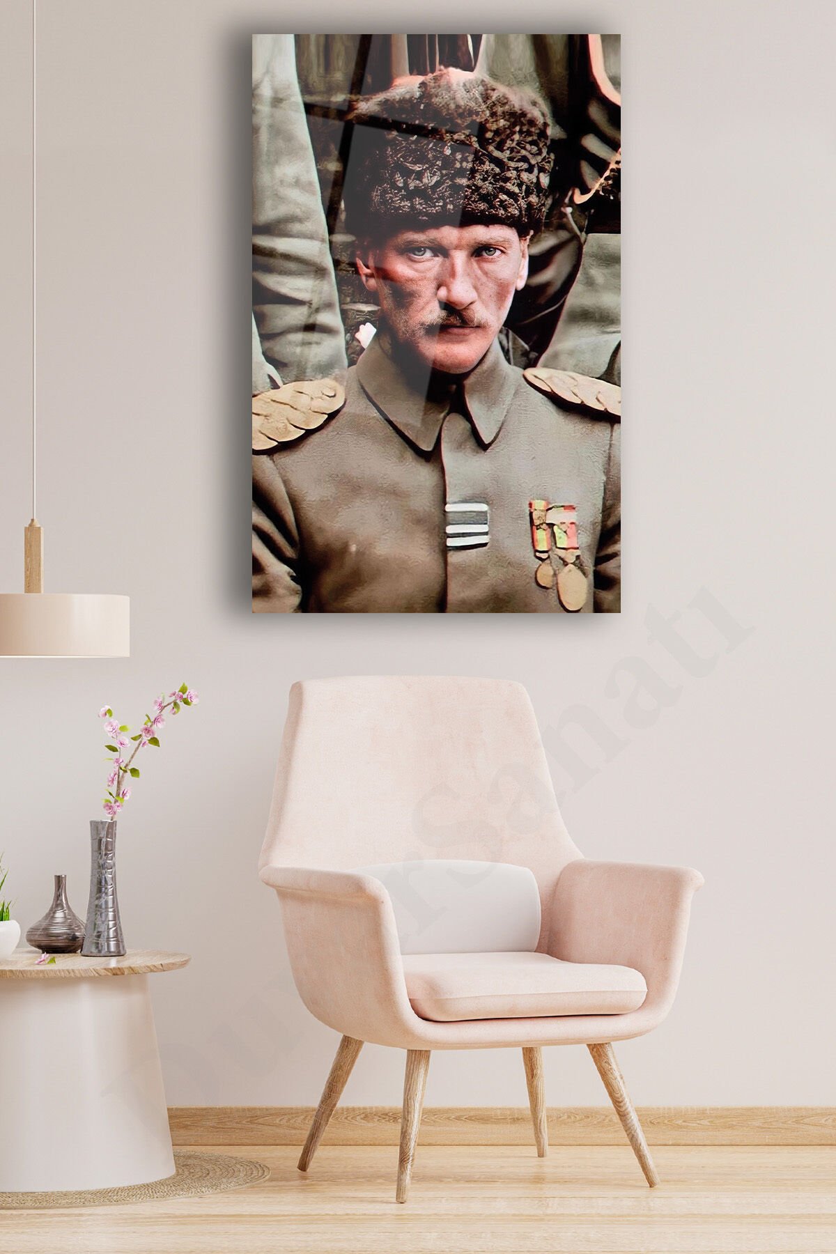 Mustafa Kemal Atatürk Üniformalı Dikey Cam Tablo, Modern Ev Ofis Salon Duvar Dekoru, Hediyelik Tablo