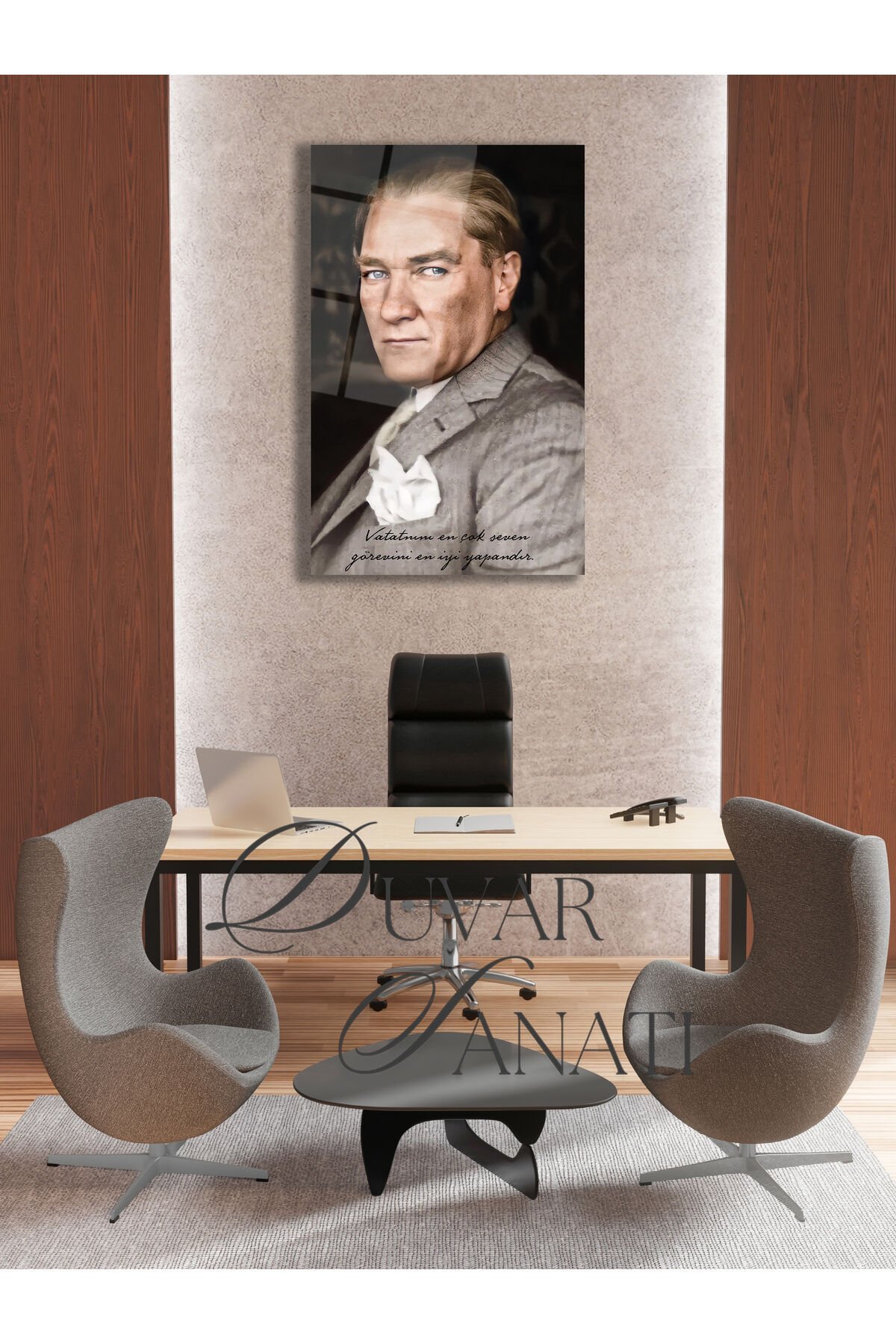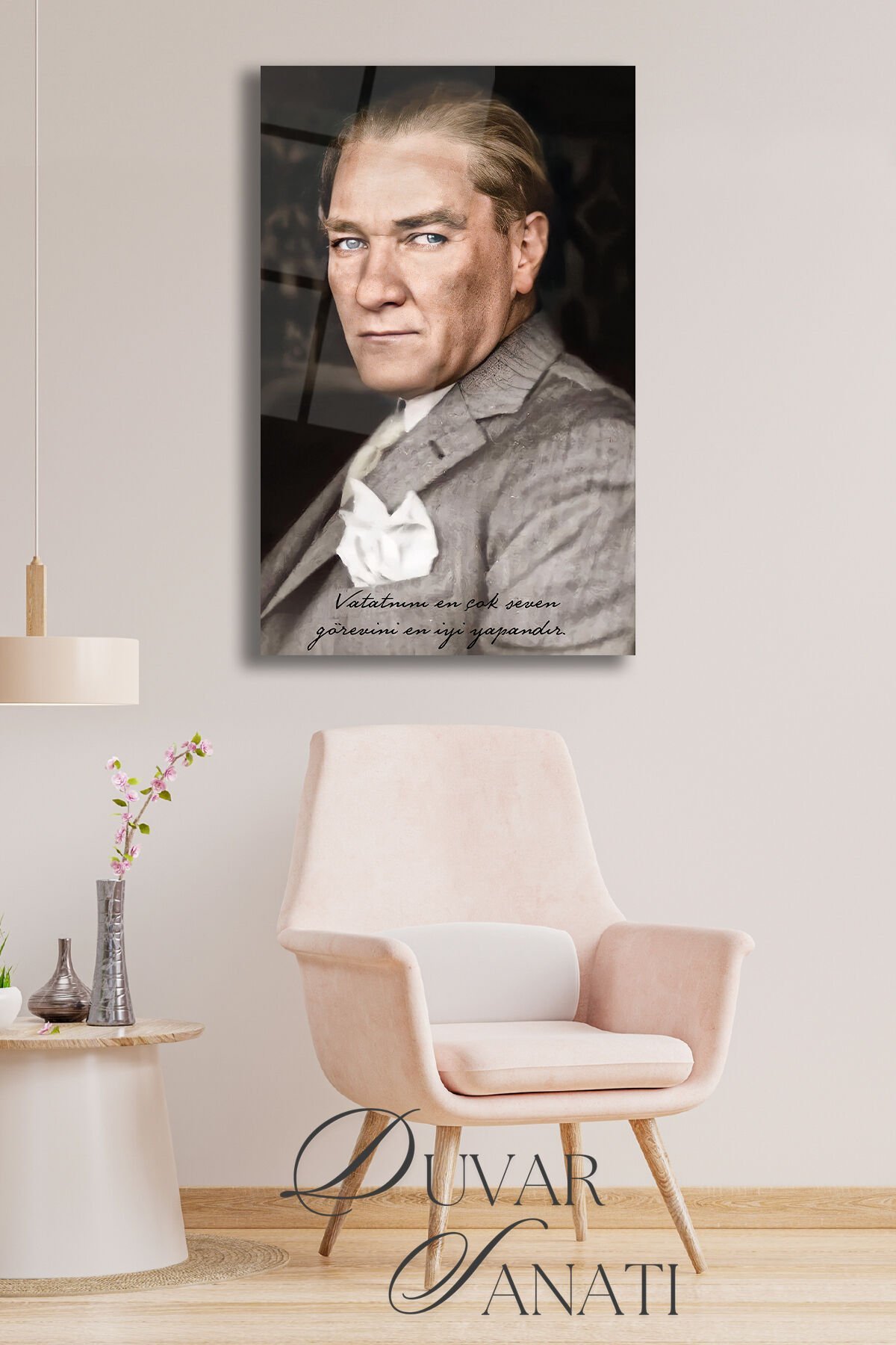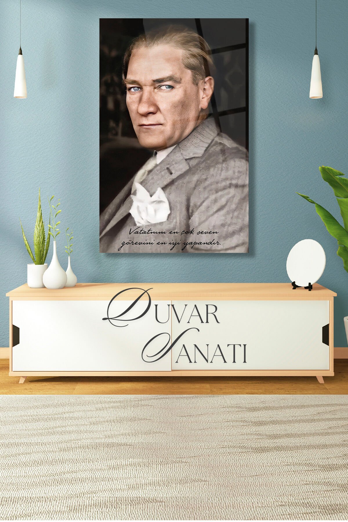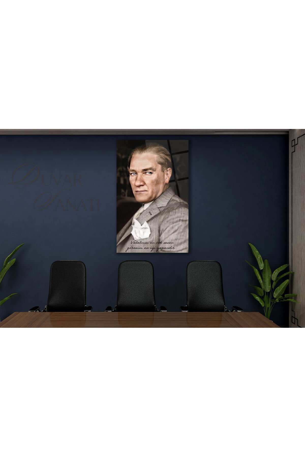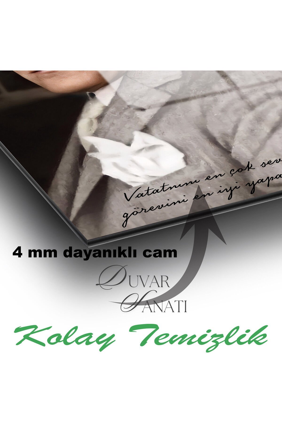 Duvar Sanatı " Mustafa Kemal Atatürk ve Sözleri , Vatanını en çok seven görevini en iyi yapandır " cam tablolar 4 mm kalınlığında temper işlemi (ısıl işlem) görmüştür. Kenarları rodajlanmış (kesiciliği giderilmiş) yüksek kaliteli düz camlardan oluşmaktadır. -Normal camlara göre kırılmaya 10 kat daha dayanıklıdır. Gönderilirken özel korumalı ambalaj, tabloya yapıştırılmış olarak çelik aparat ve duvara asmak için vida-dübel ile gönderilmektedir.; Duvar Sanatı tarafından hazırlanan özel tasarımlar doğrudan cam yüzeyine uv baskı tekniğiyle yüksek çözünürlüklü makinalarımız tarafından uygulanır. Bu nedenle yüksek kaliteli, mükemmel bir görüntü derinliği sağlar. ; -Görsellerimiz camın arka yüzeyine doğrudan uv cam boyası kullanılarak basılır ve özel koruma beyaz uv boya ile arka yüzey kapatılır. Baskı cam ile arka koruma boyası arasında kalır. ; -Cam tablolar zamanla solmazlar ve renkler canlılığını hiç kaybetmez. ; -Özellikle ev ve ofis dekorasyonunda büyük tablolar duvarlarda çok şık bir görünüm sağlarlar. ; -Dekoratif ve zarif tablolar ev ve ofis duvarlarınıza estetik bir hava katar. ; -Temizliği son derece kolay olan cam tablolarımızı nemli bez ile gönül rahatlığıyla silebilirsiniz. Özel çelik askı aparatı sayesinde ürünlerimizin duvardan kazara düşme olasılığı çok düşüktür. ; -Ürünle birlikte gönderdiğimiz vida ve dübel ile kolayca duvara monte edebilirsiniz. Ürün asıldığında duvardan 2 cm önde durmaktadır. ; -Kargo esnasında yaşanacak kırılma durumunda ücretsiz yeni ürün gönderimi yapmaktayız. ;