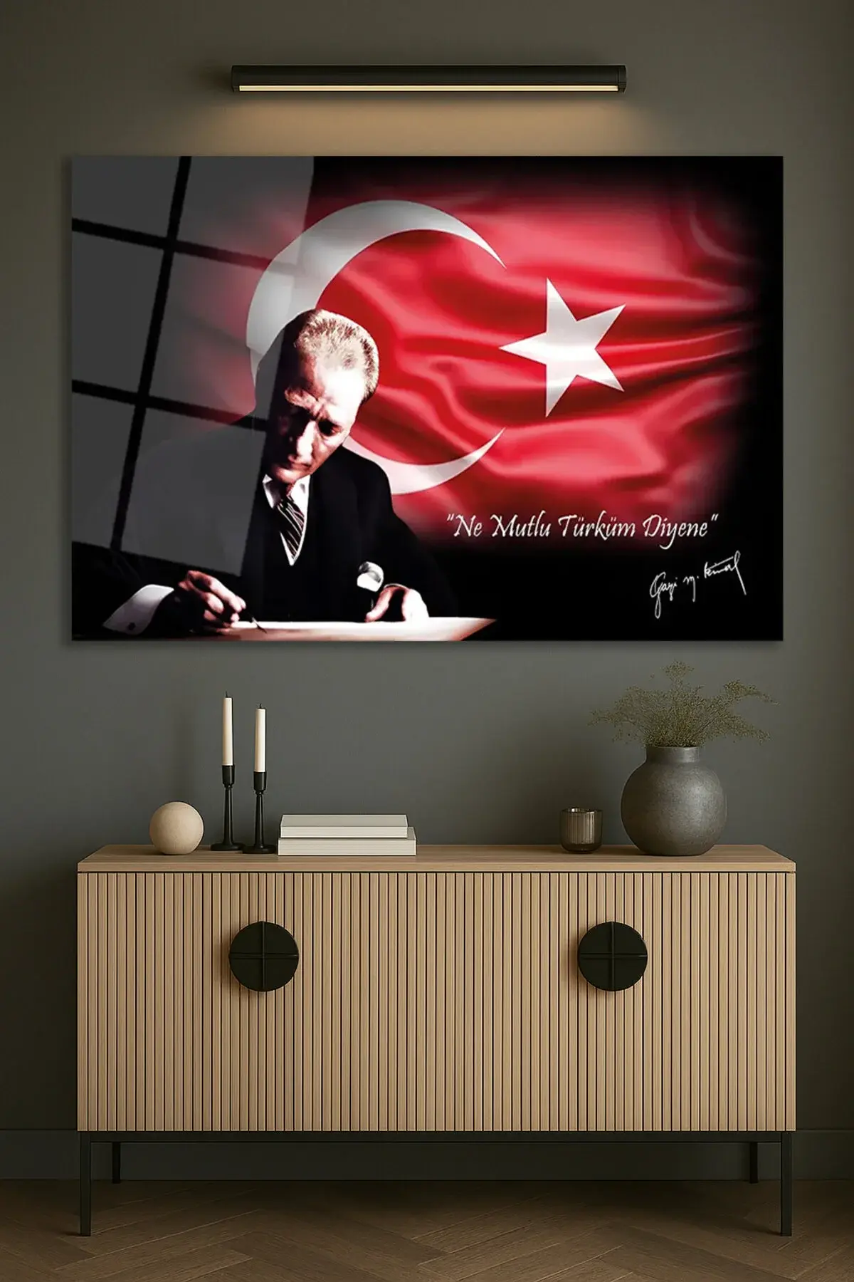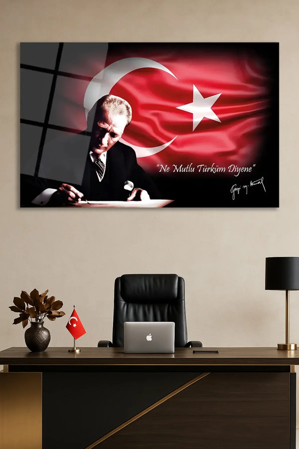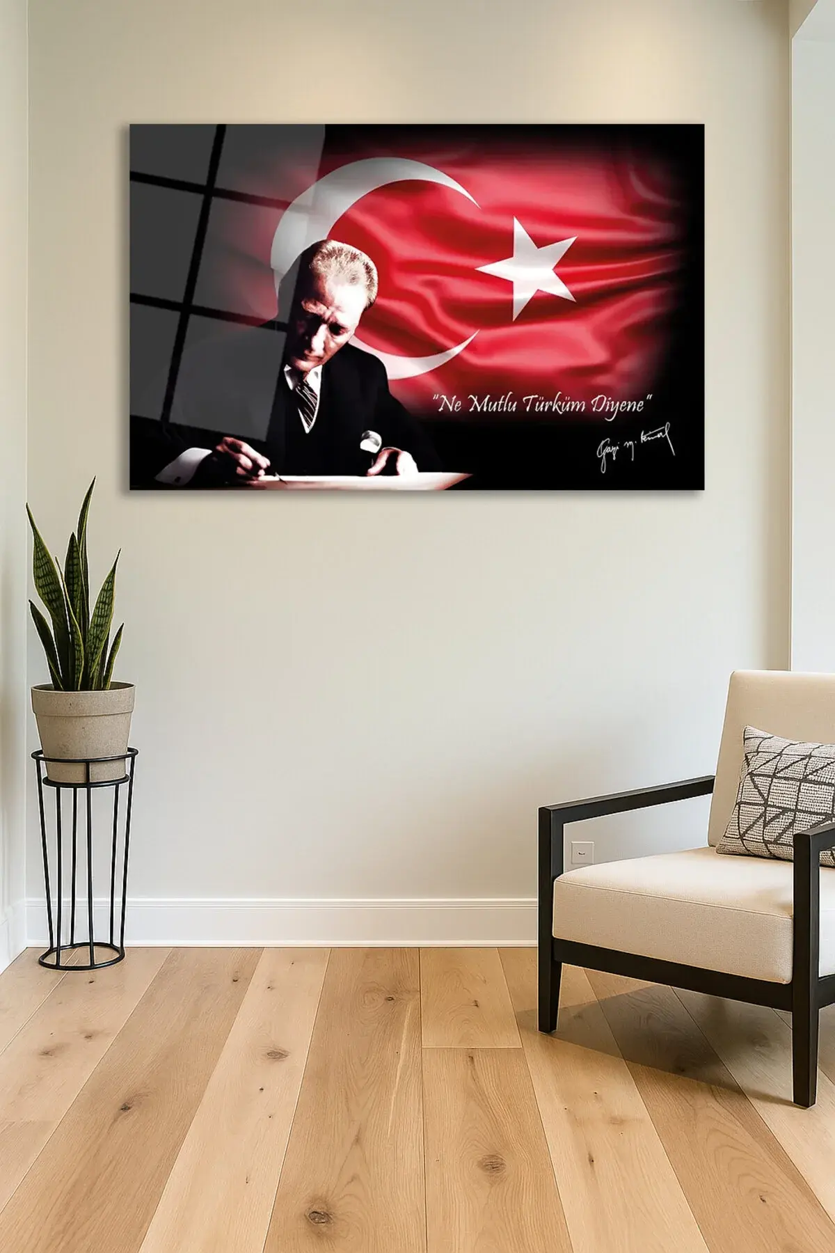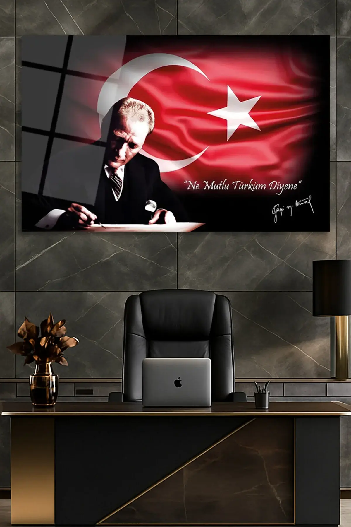 ''NE MUTLU TÜRKÜM DİYENE'' ATATÜRK TABLOSU ŞIK VE LÜKS KIRILMAZ MODERN CAM TABLO OFİS HEDİYESİ TABLO Siyah