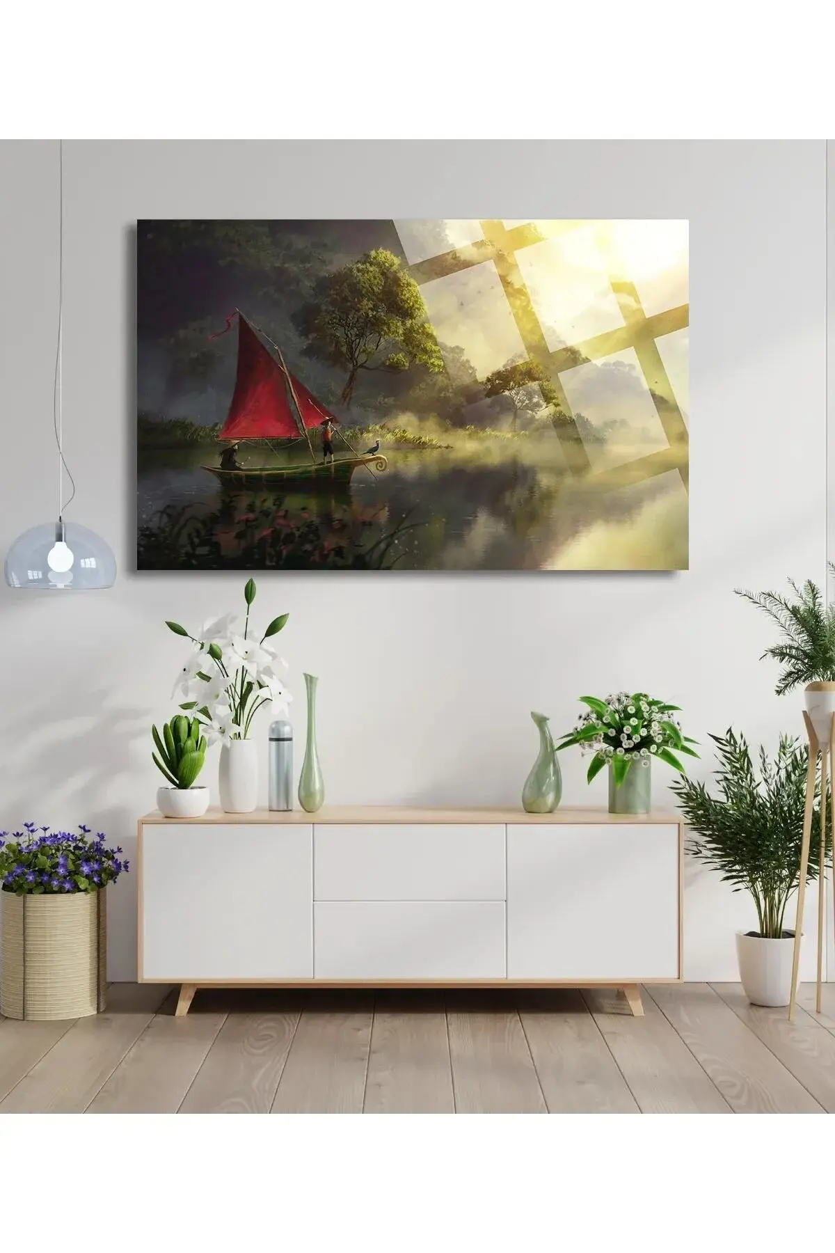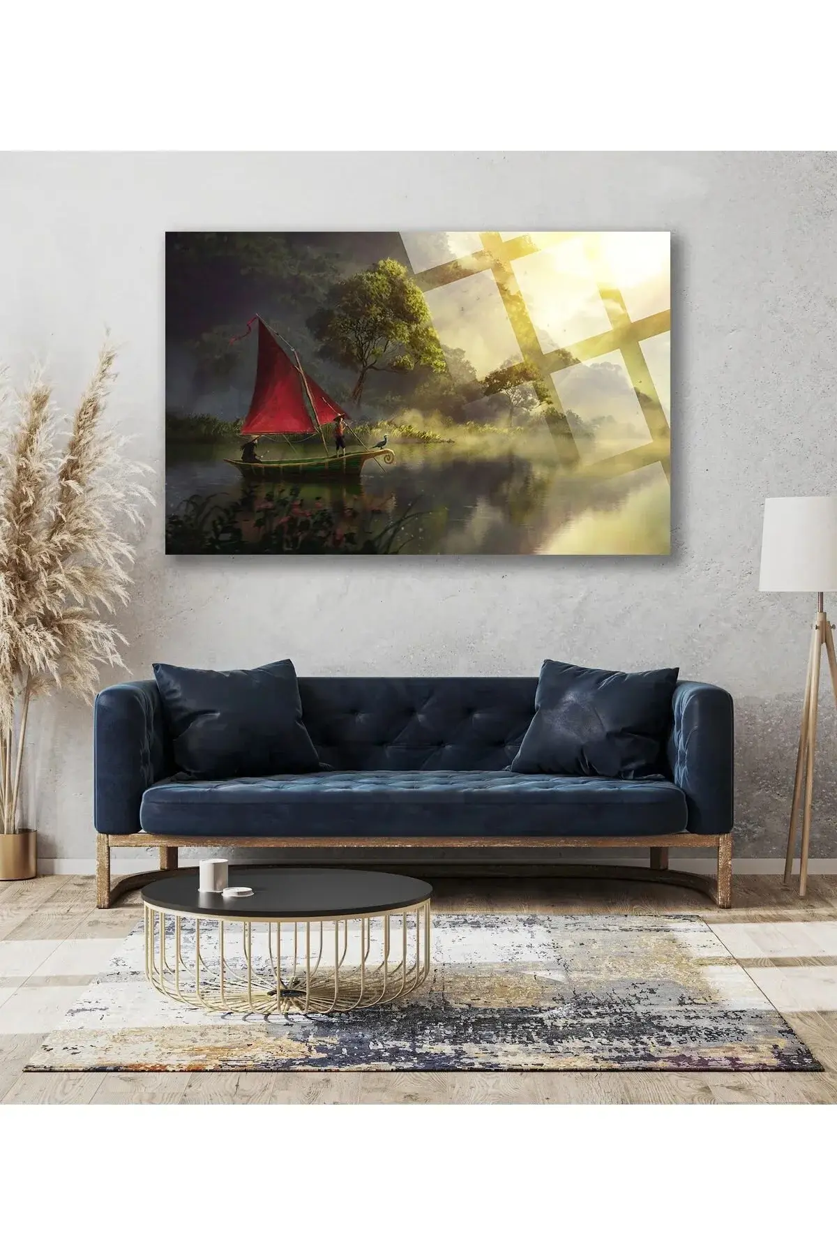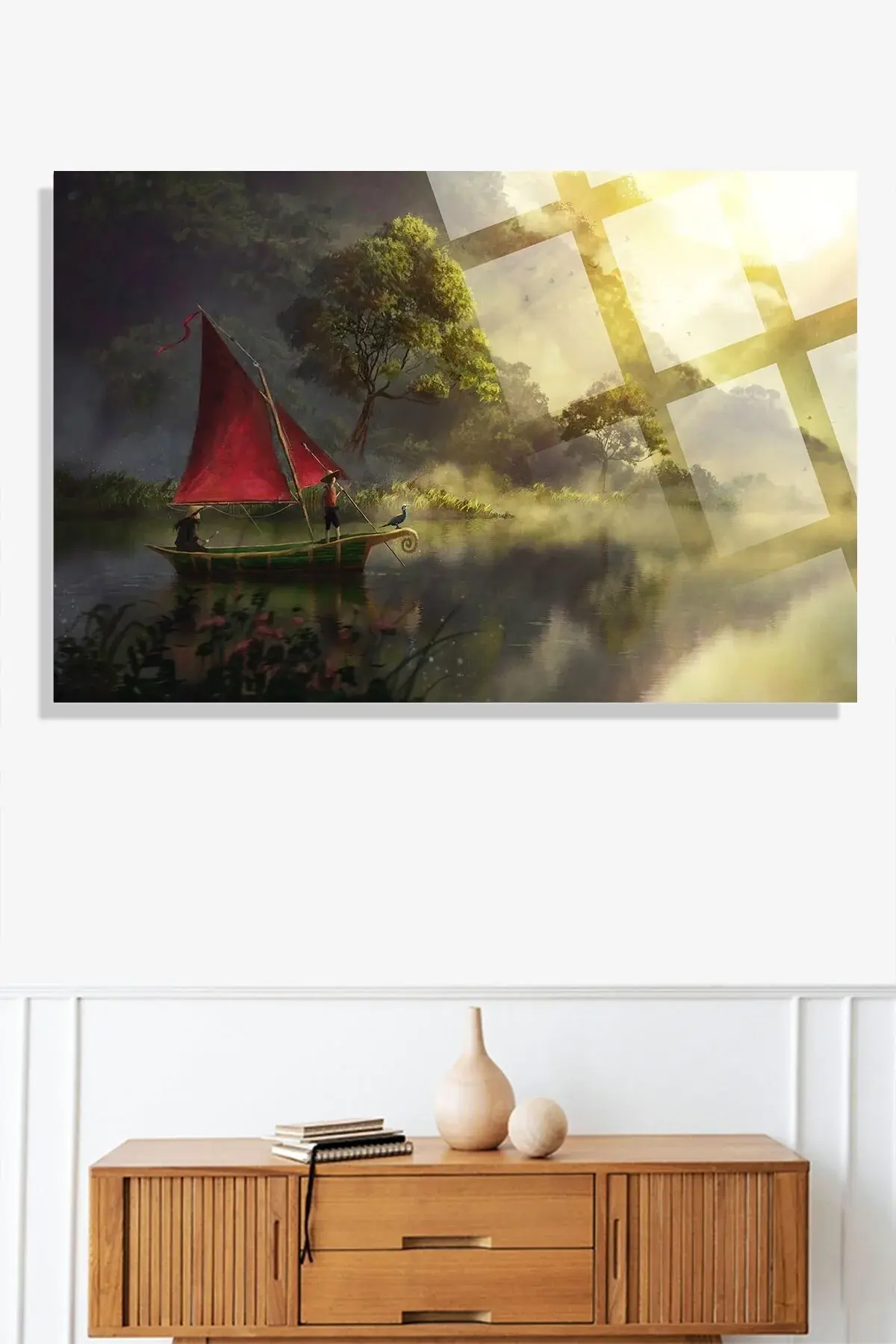 Nehirde Giden Tekne Manzarası 4mm Lüks Kırılmaz Temperli Yüksek Çözünürlüklü Cam Tablo