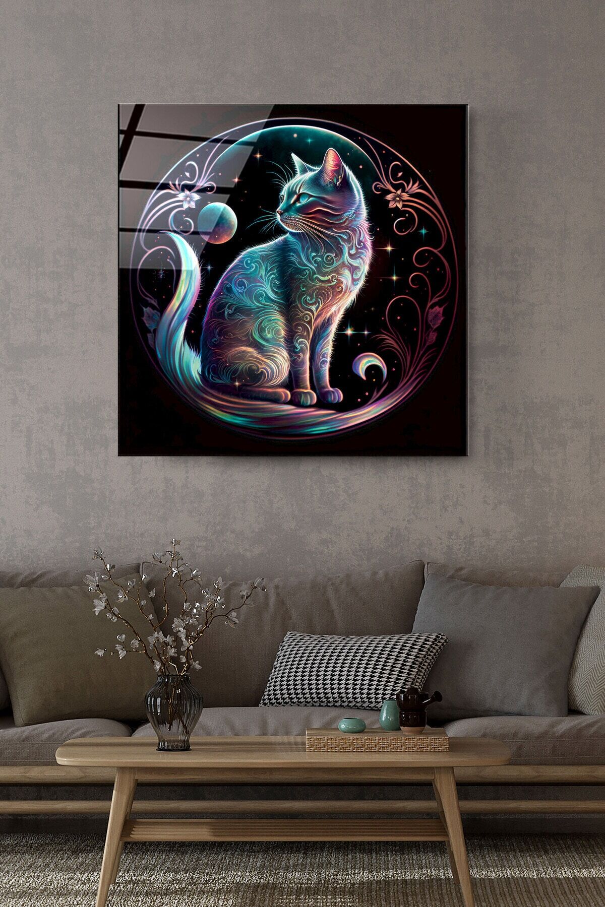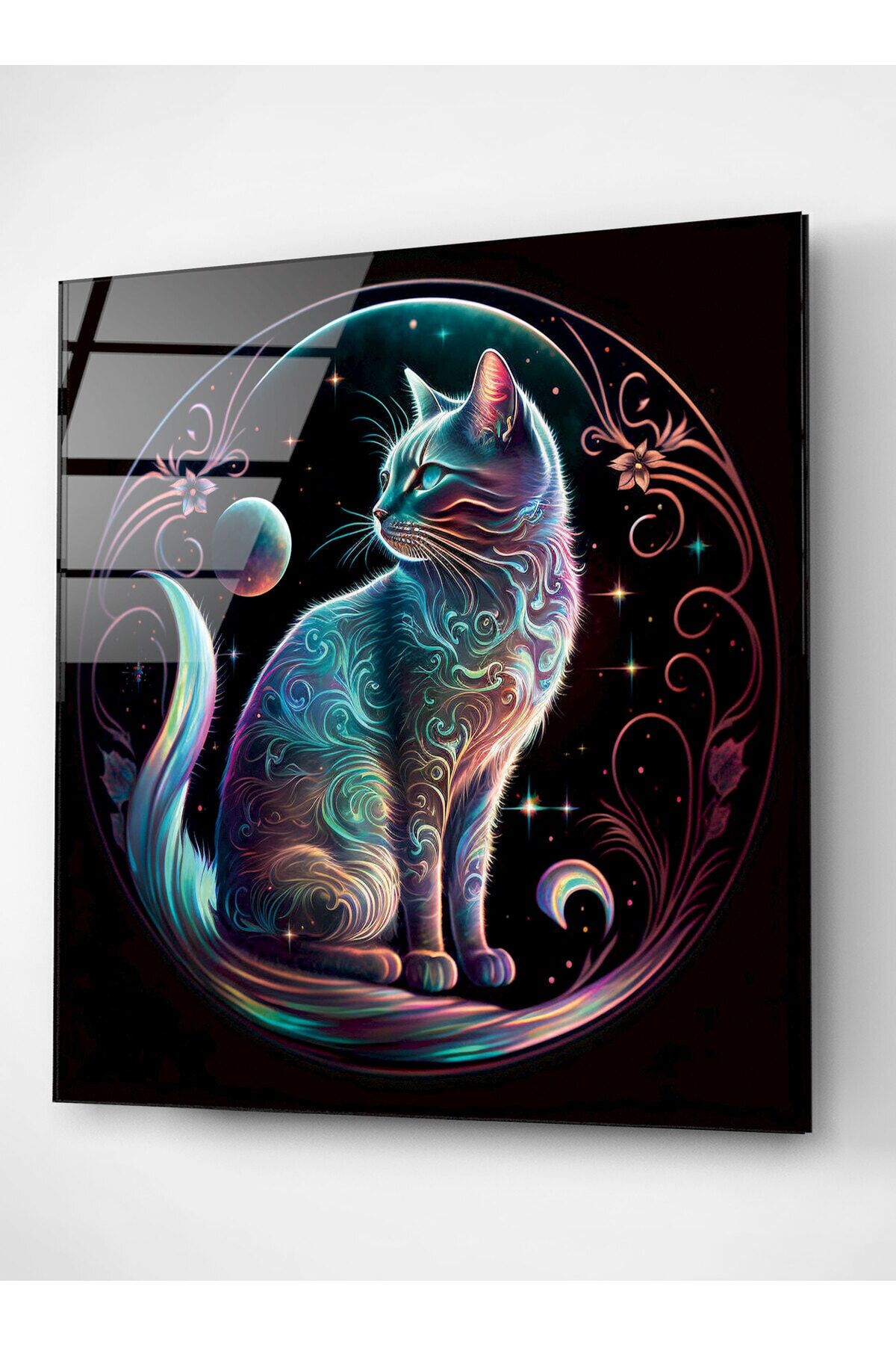 Neon Kedi Cam Tablo, Dekoratif Cam Tablo