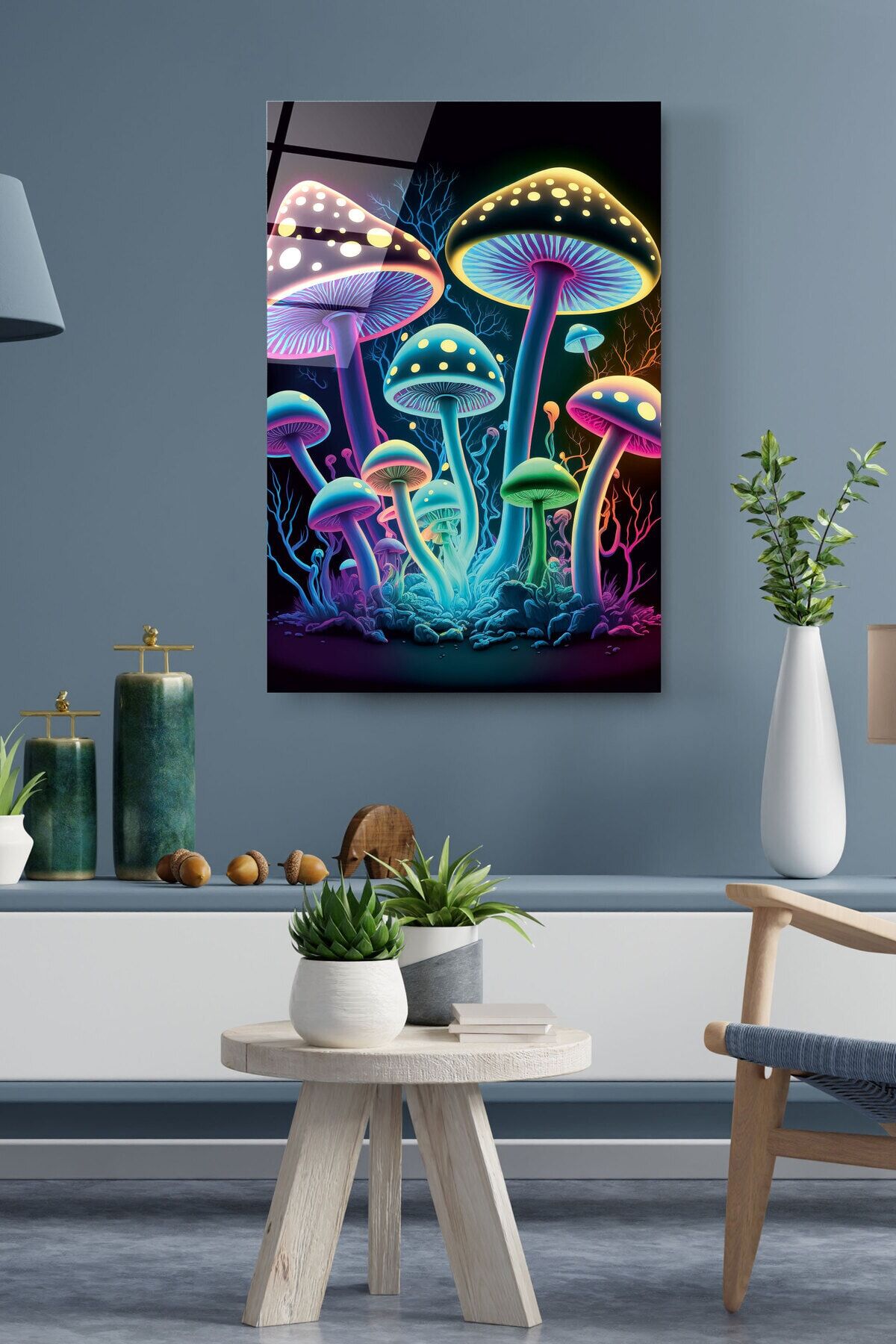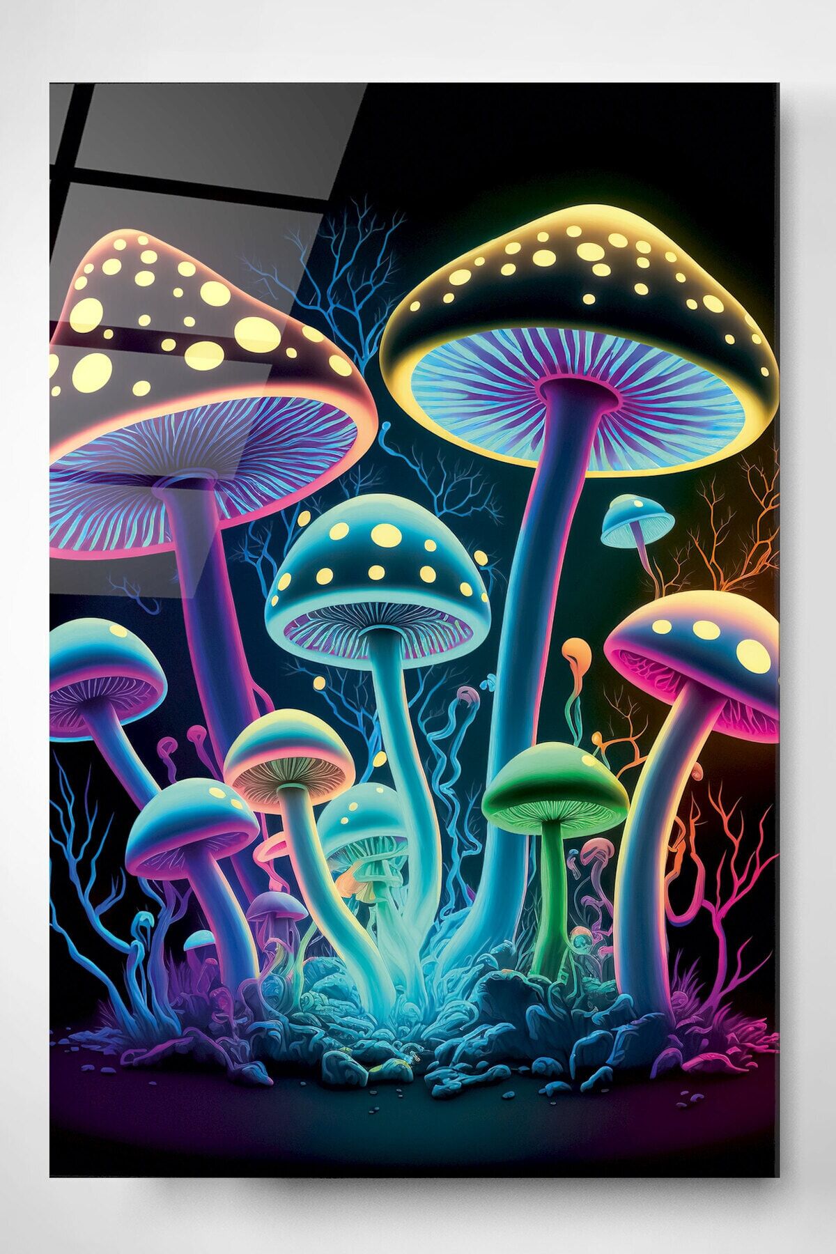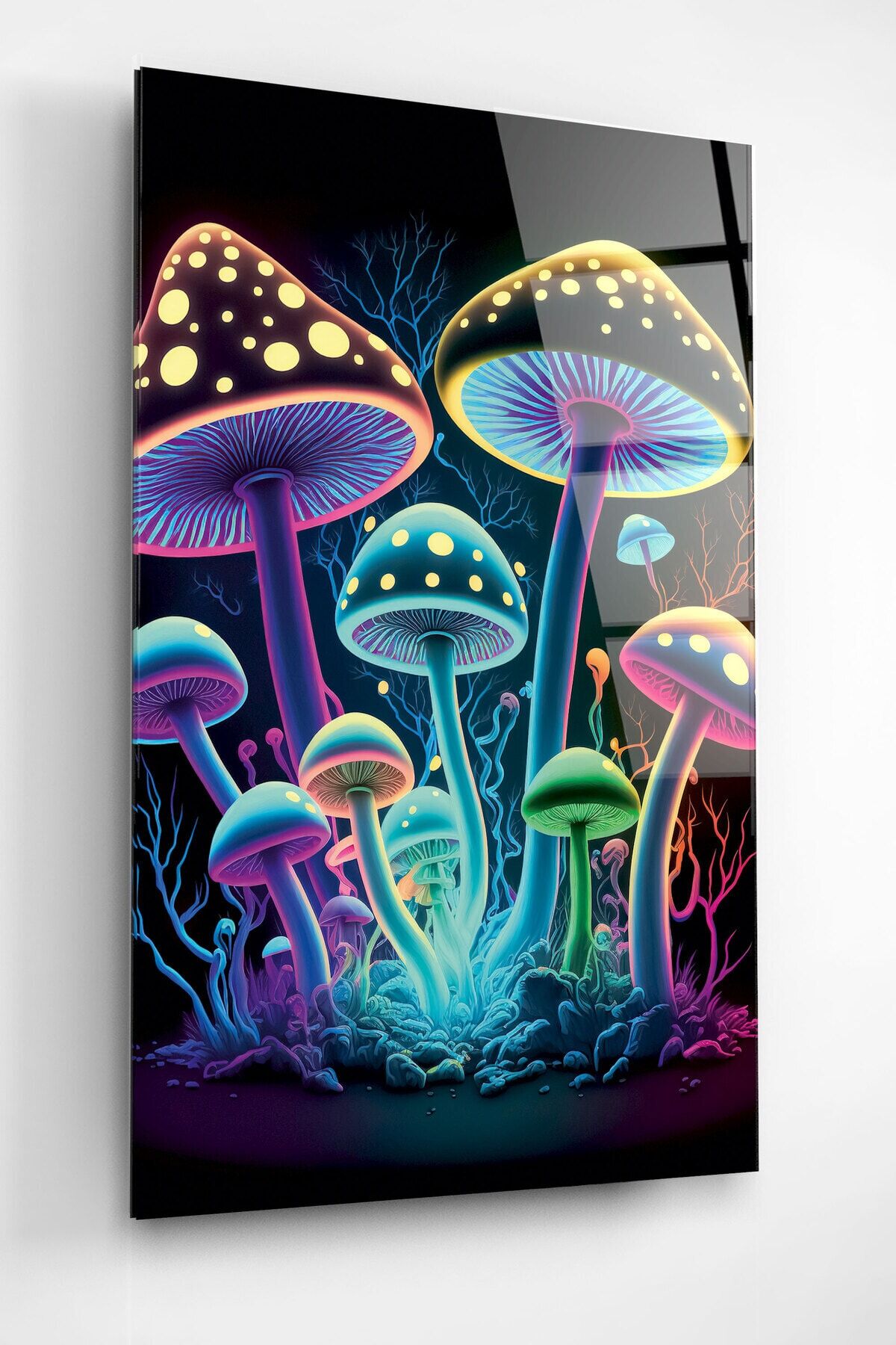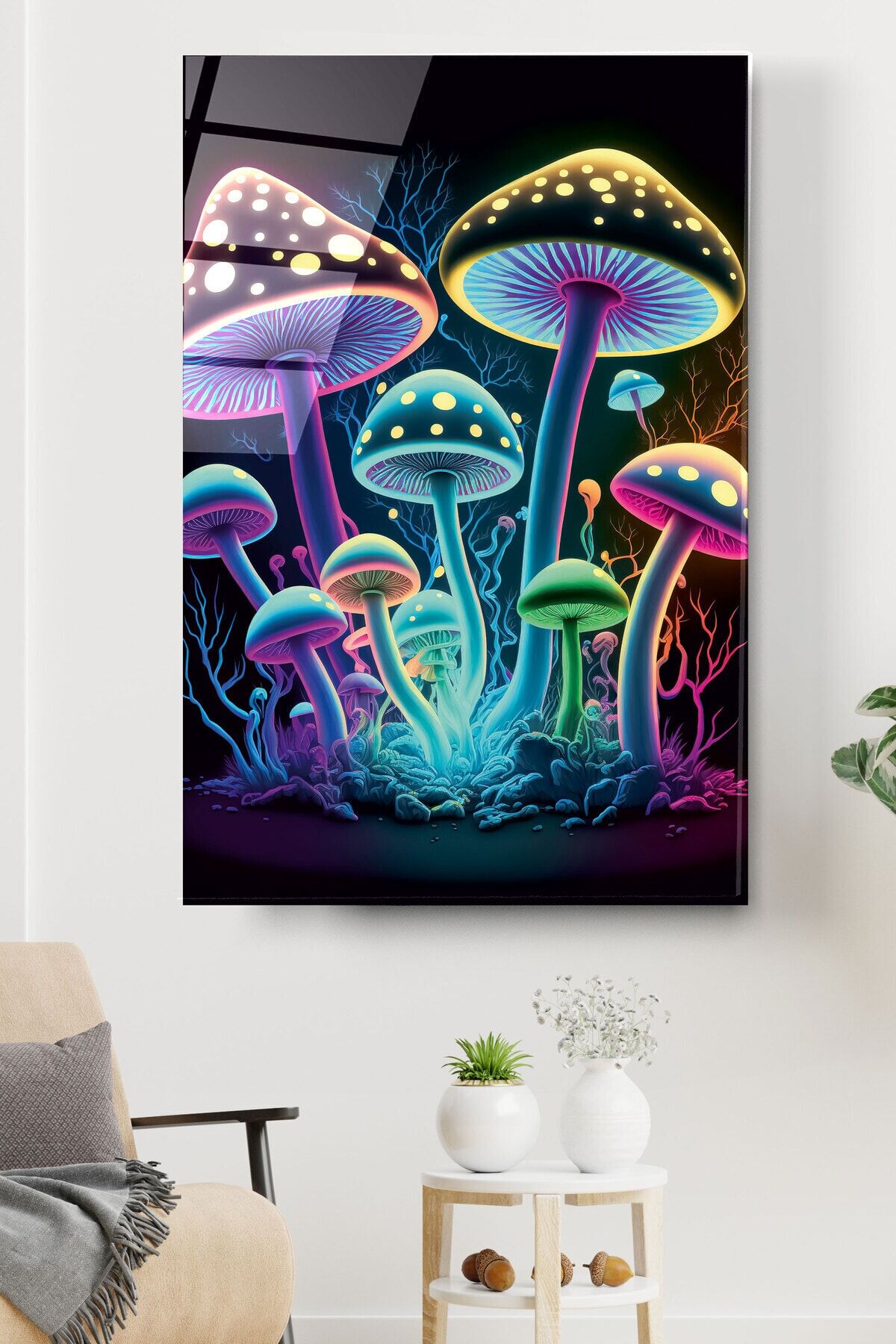 Neon Mantarlar Cam Tablo, Dekoratif Cam Tablo
