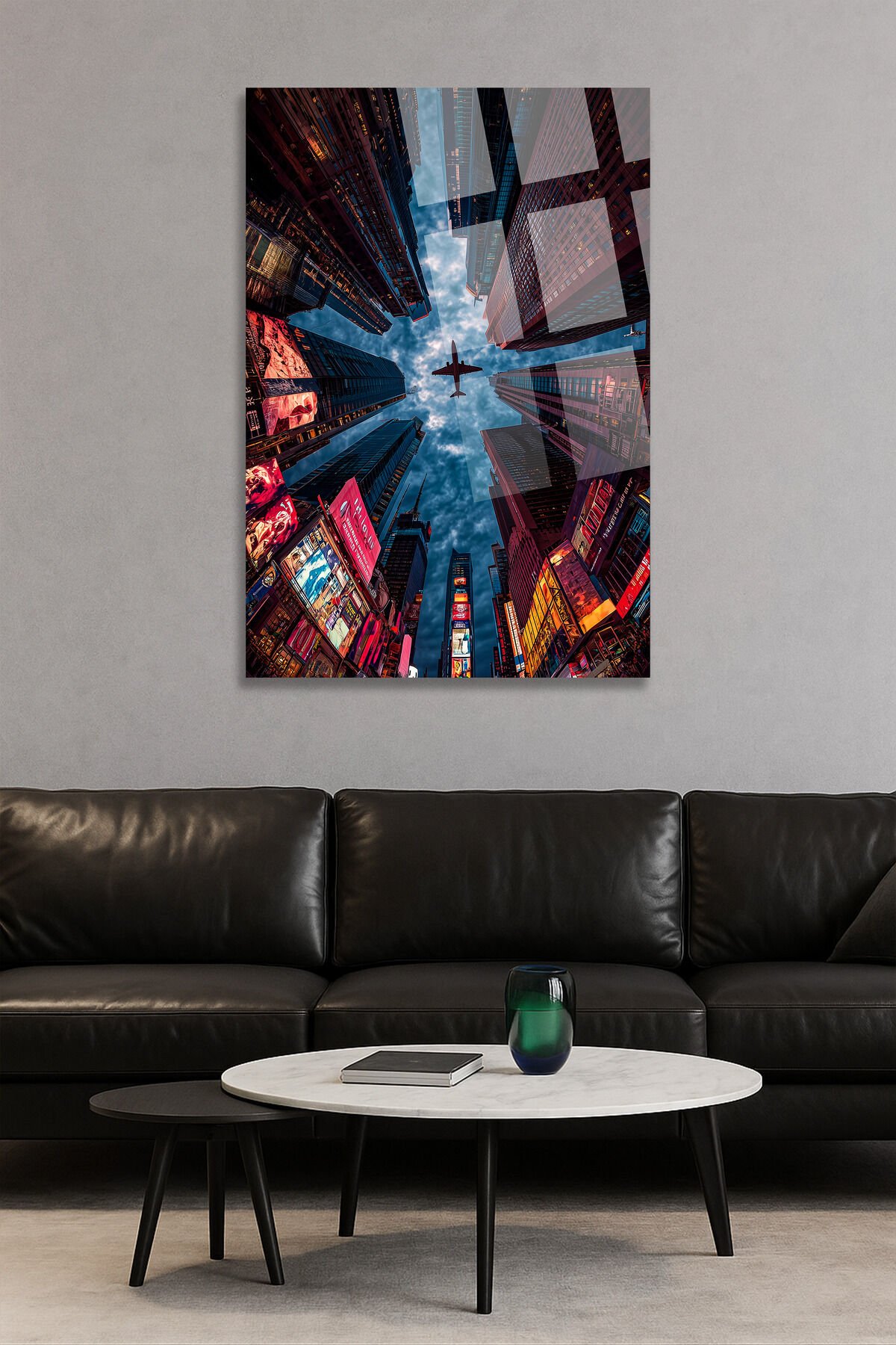 New York Cam Tablo Times Square Işıkları ve Uçak Silüeti Cam Tablo – Modern Şehir Manzarası Tablo Kırmızı