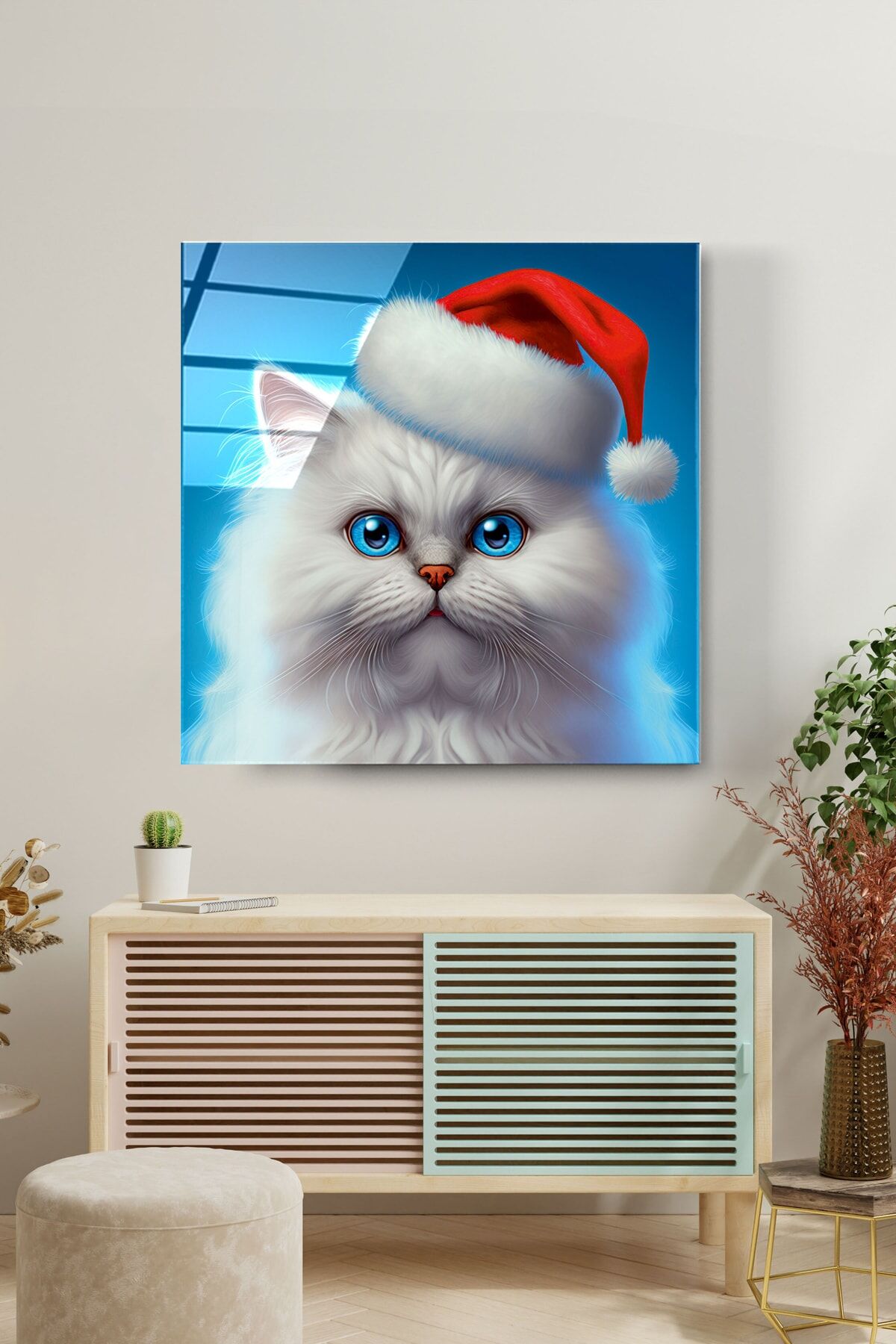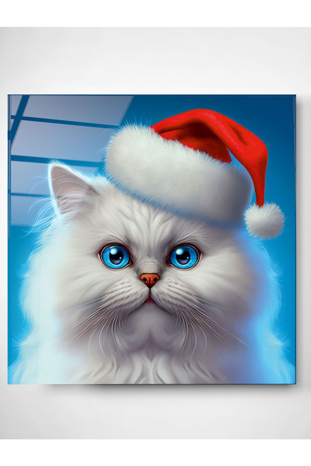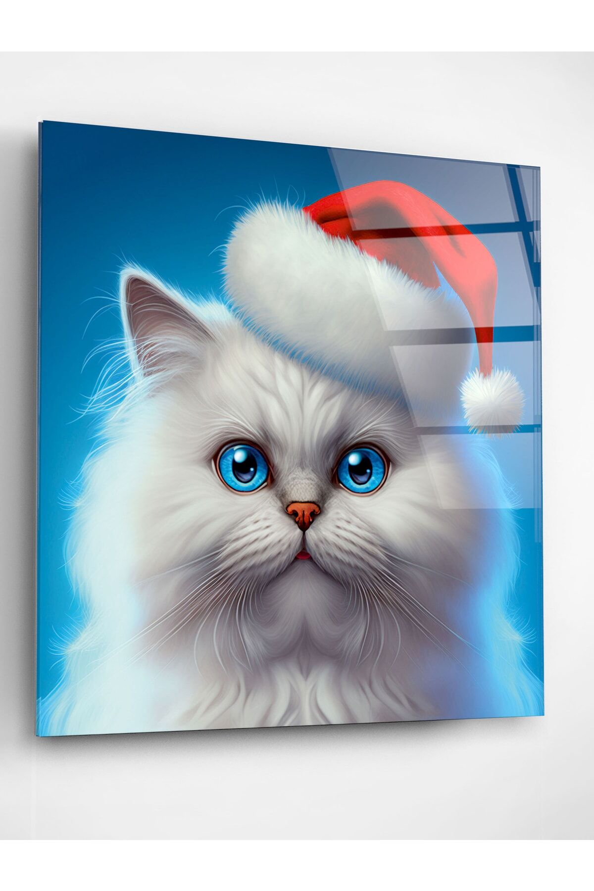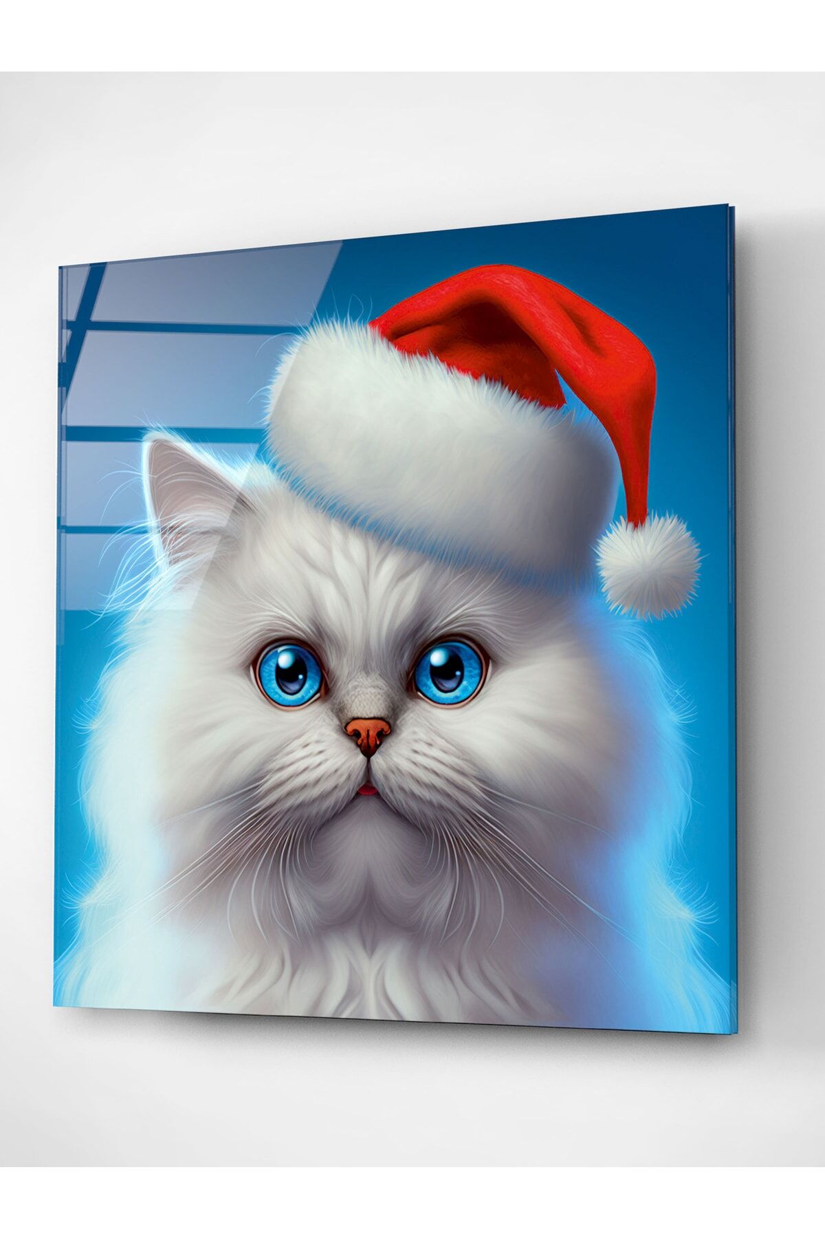 Noel Şapkalı Kedi Cam Tablo, Dekoratif Cam Tablo