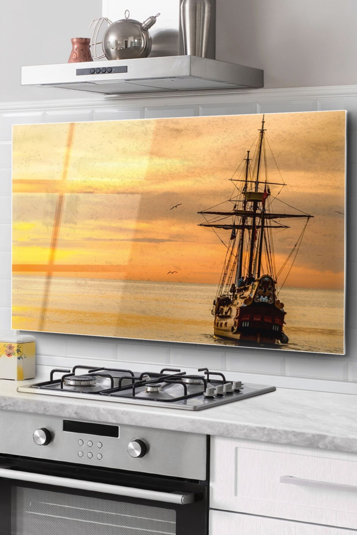 Ocak Arkası Cam Koruyucu Tezgah Ankastre Arkası Koruyucu 76x50 Cm |gemi Desenli