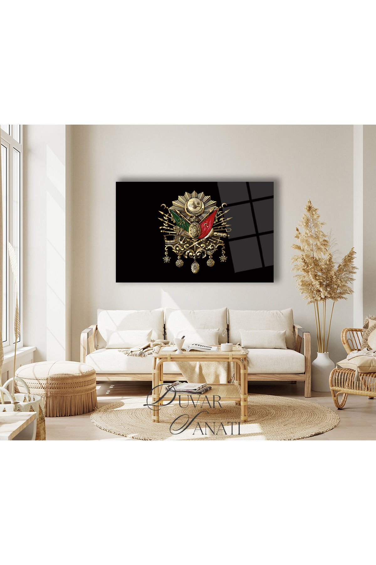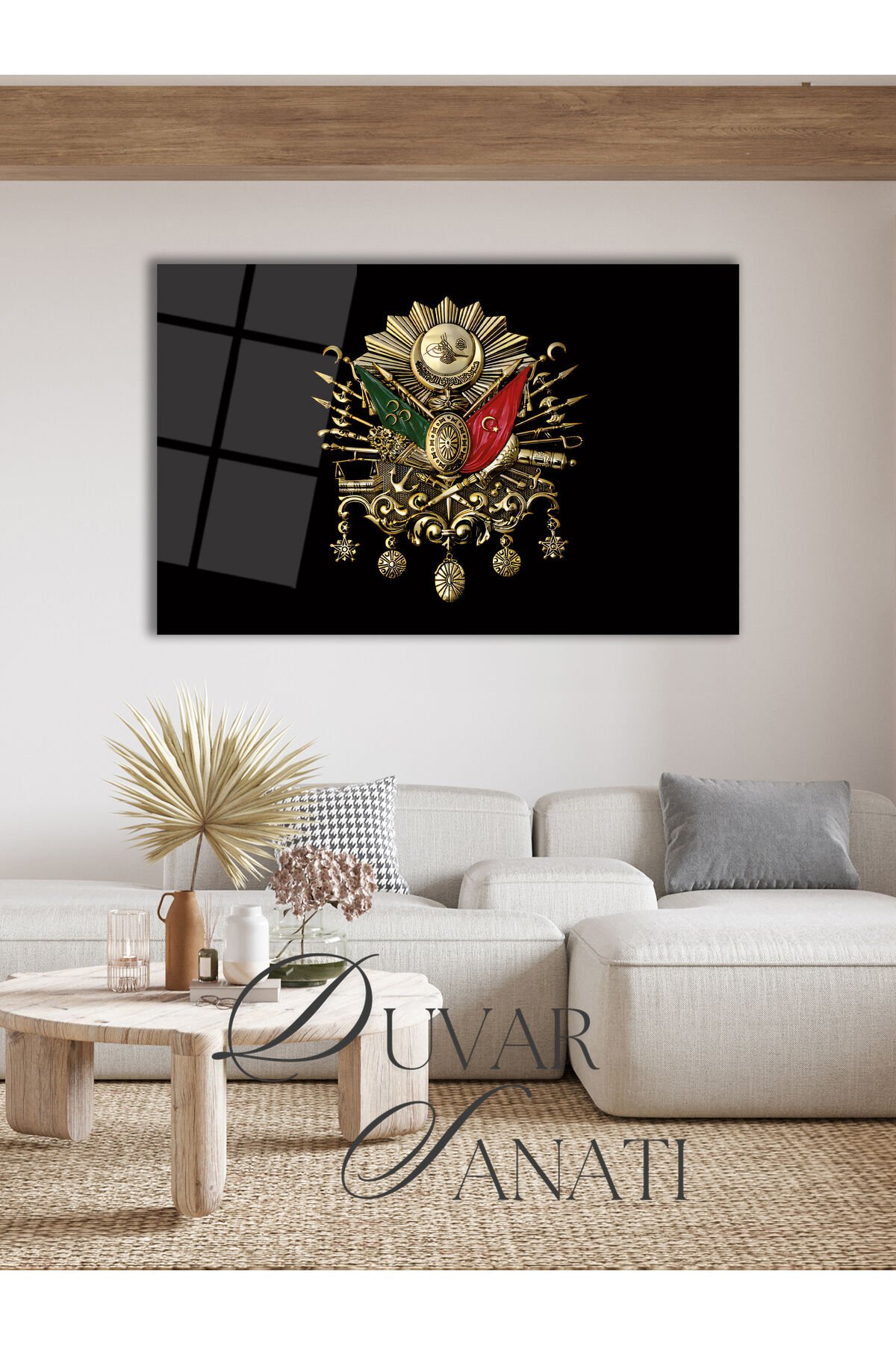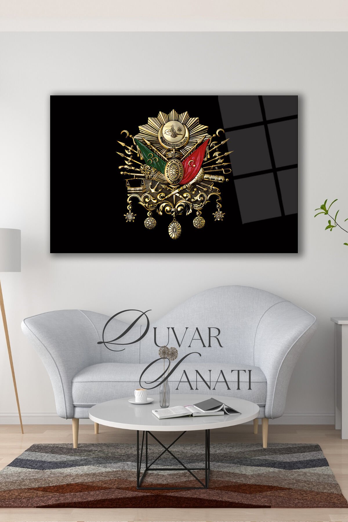 Osmanlı Arması Cam Tablo, Tuğra Modern Ev Salon Ofis Dekorasyonu Hediyelik Büyük Duvar Dekoru Siyah Gri