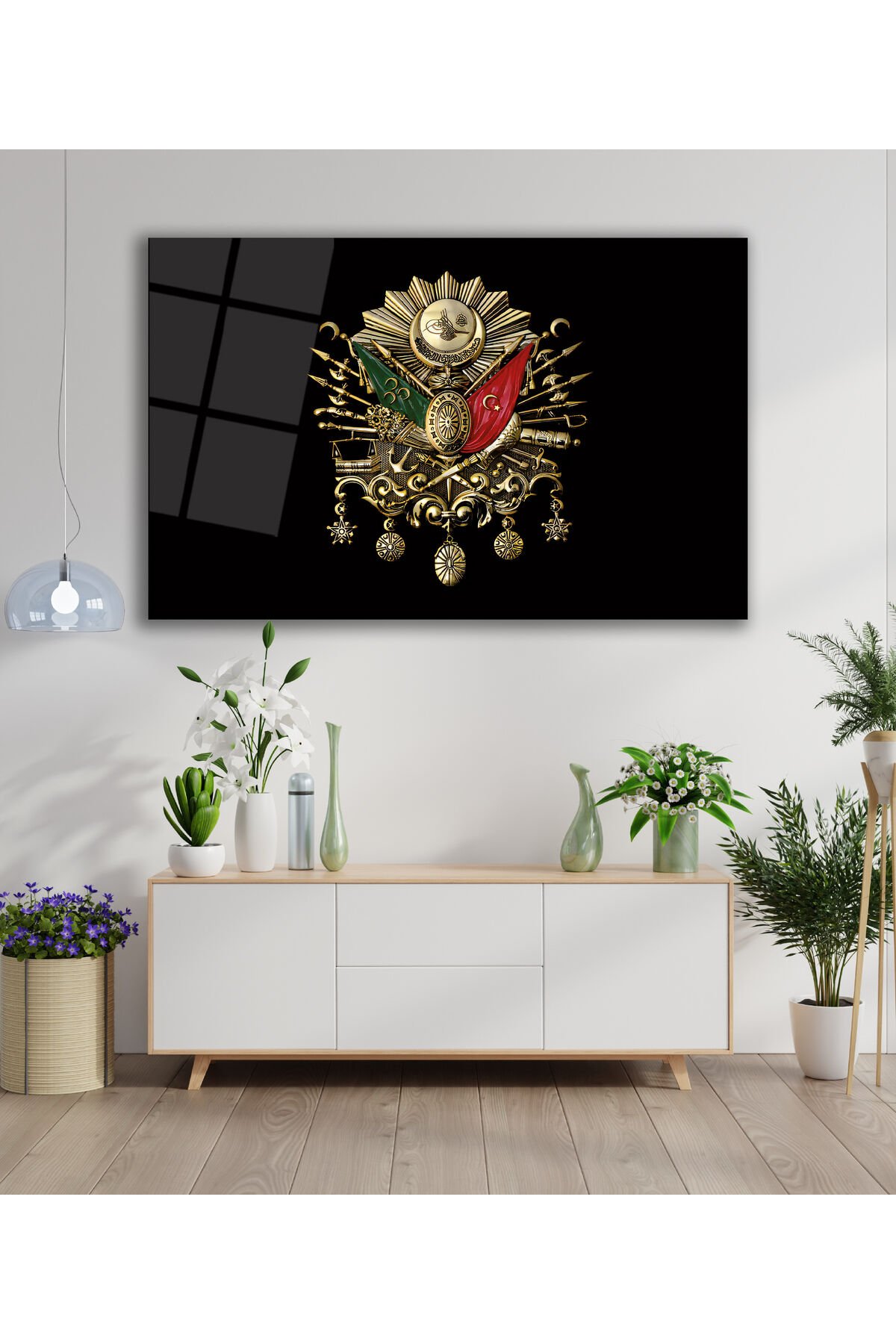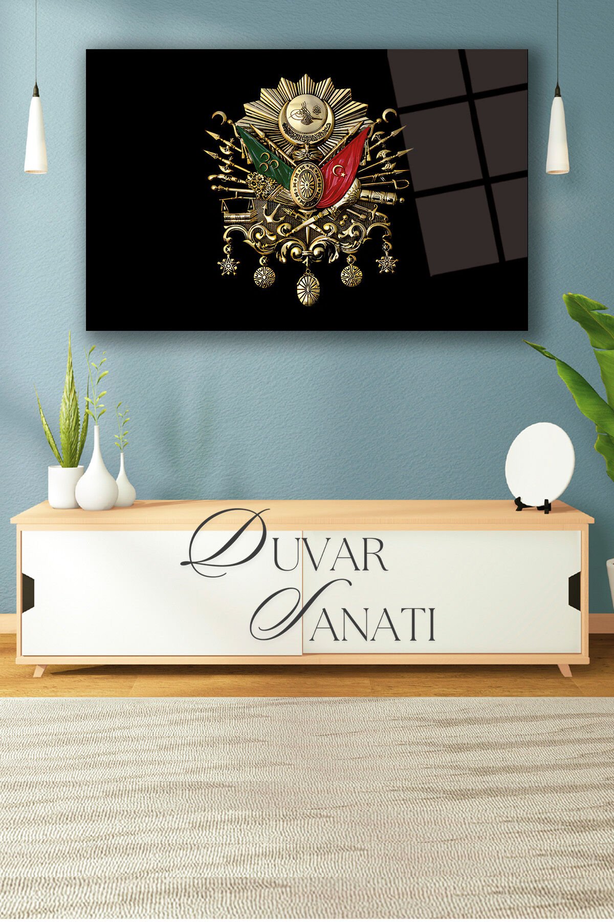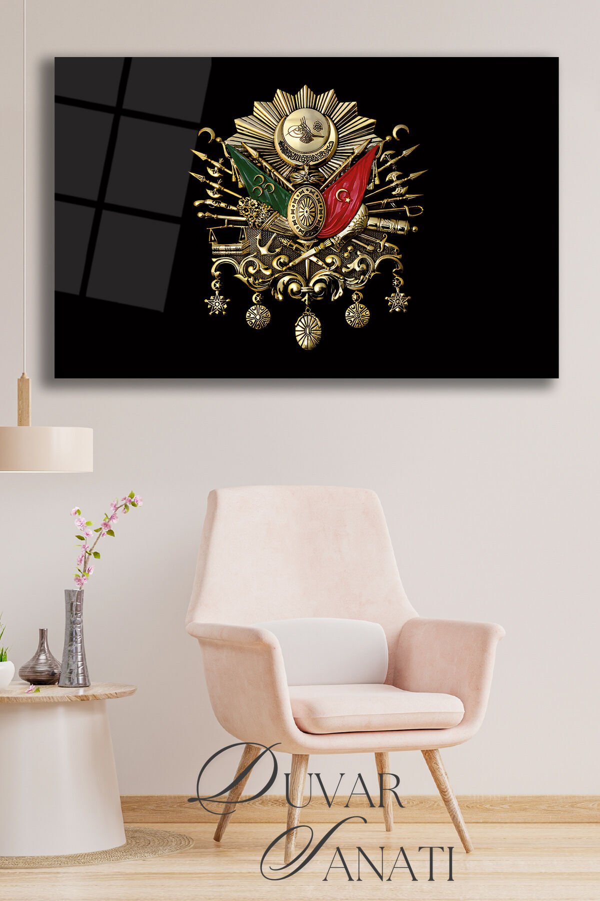 Osmanlı Arması Cam Tablo, Tuğra Modern Ev Salon Ofis Dekorasyonu Hediyelik Büyük Duvar Dekoru Siyah Gri
