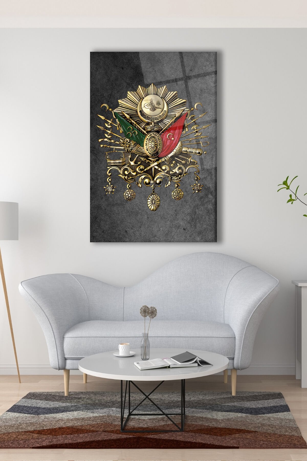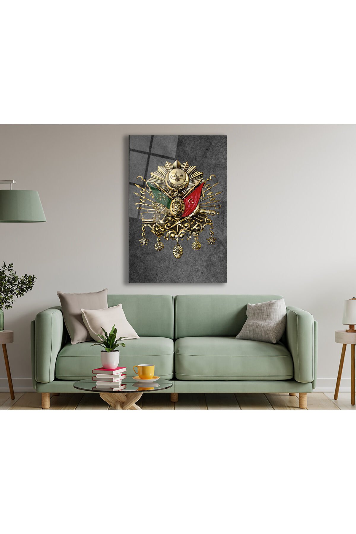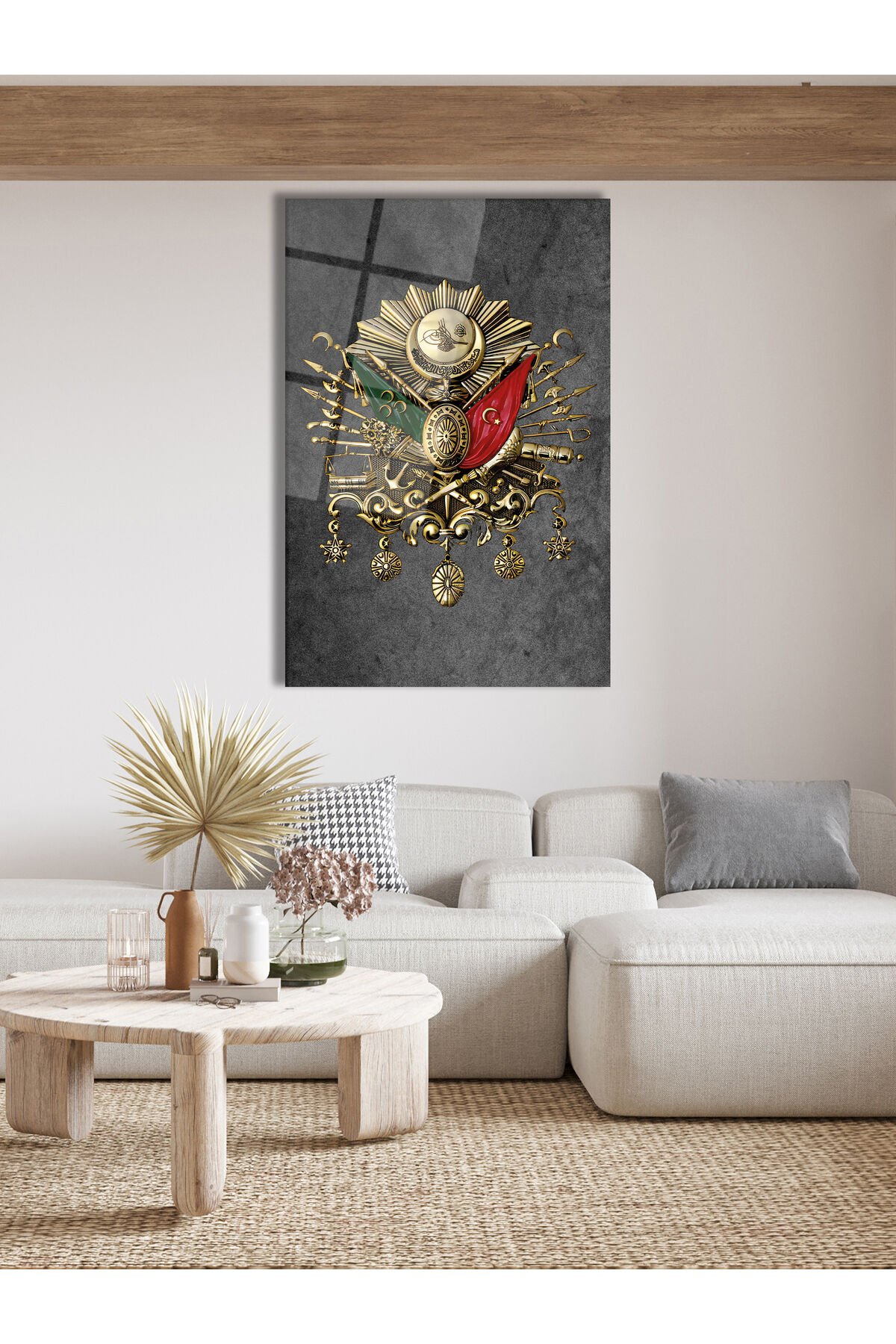 Osmanlı Arması Tuğra Dikey Cam Tablo, Modern Ev Ofis Salon Duvar Dekoru, Hediyelik Tablo Dekor Gri Sarı
