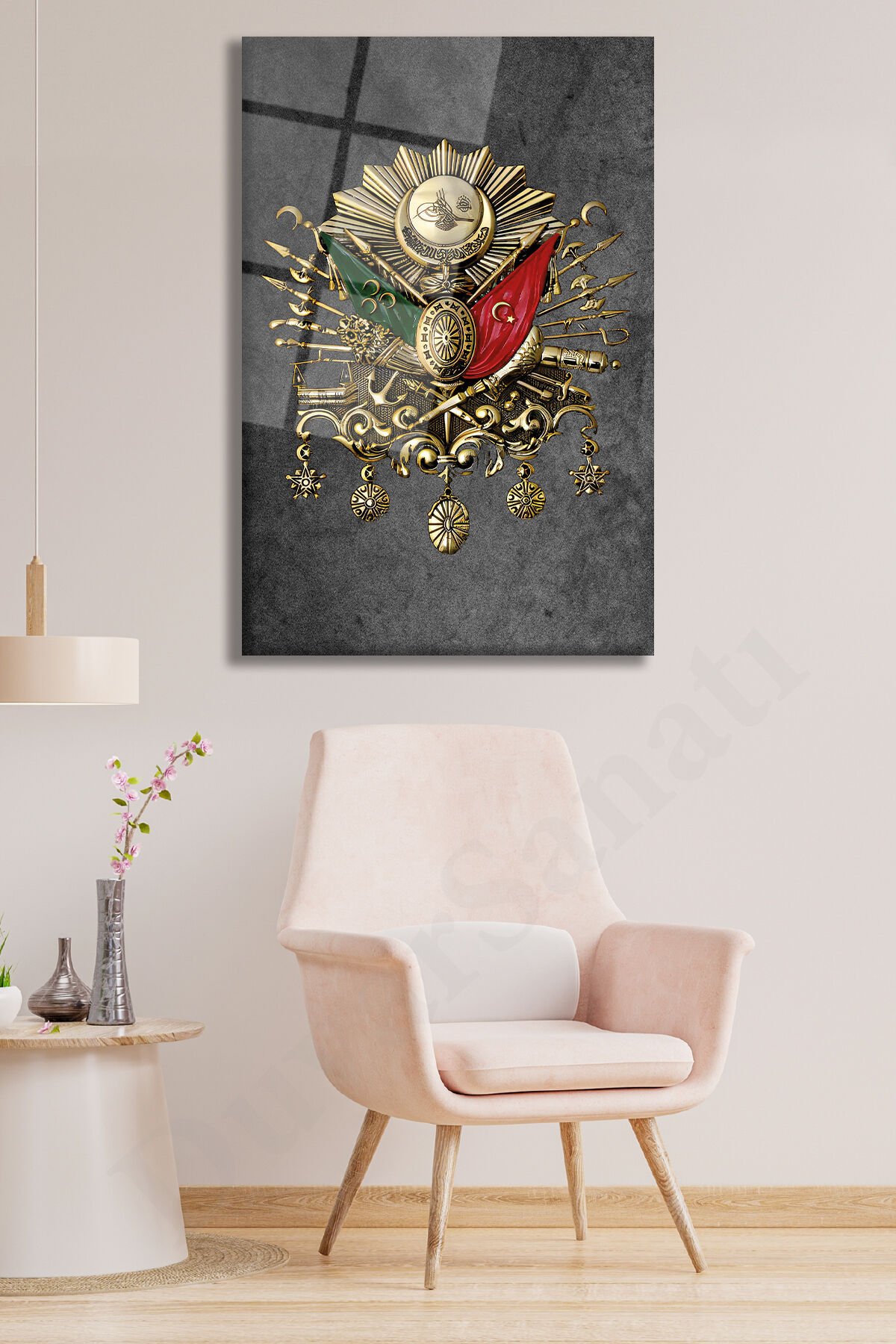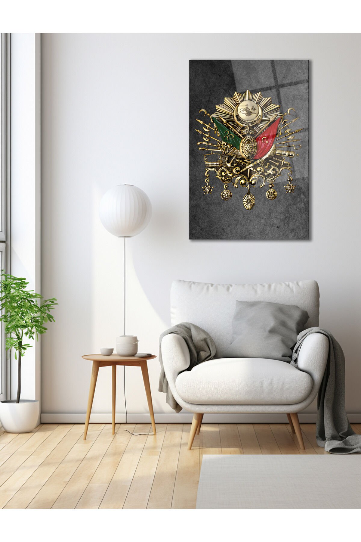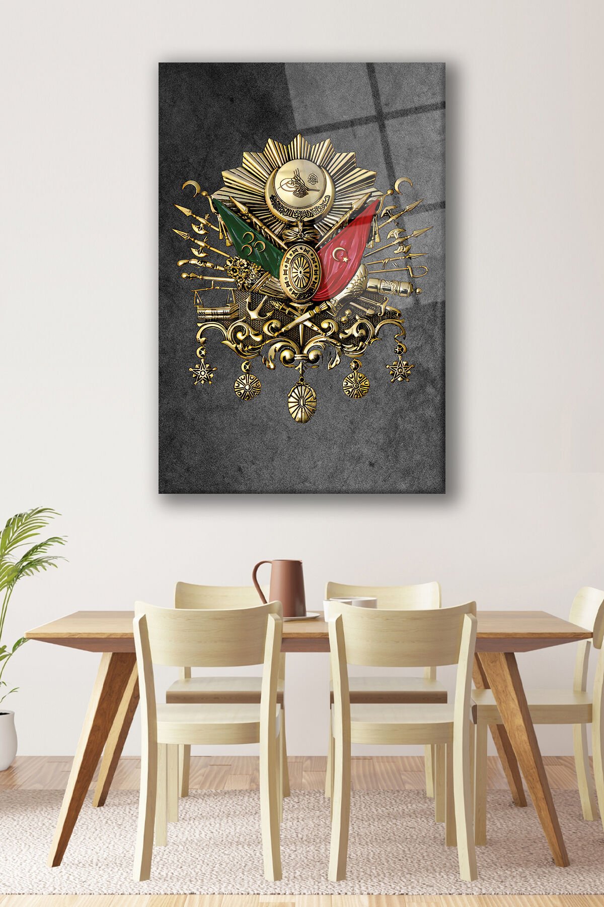 Osmanlı Arması Tuğra Dikey Cam Tablo, Modern Ev Ofis Salon Duvar Dekoru, Hediyelik Tablo Dekor Gri Sarı