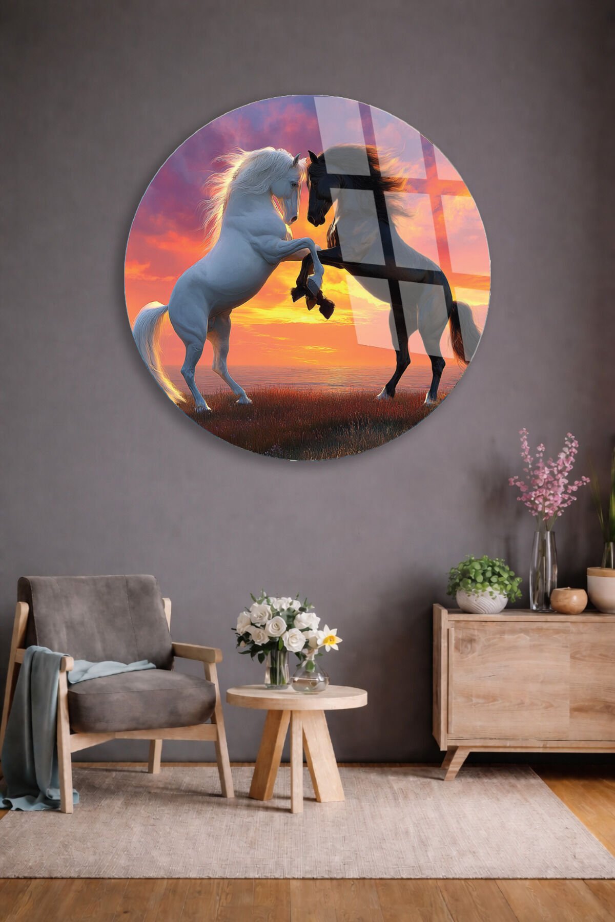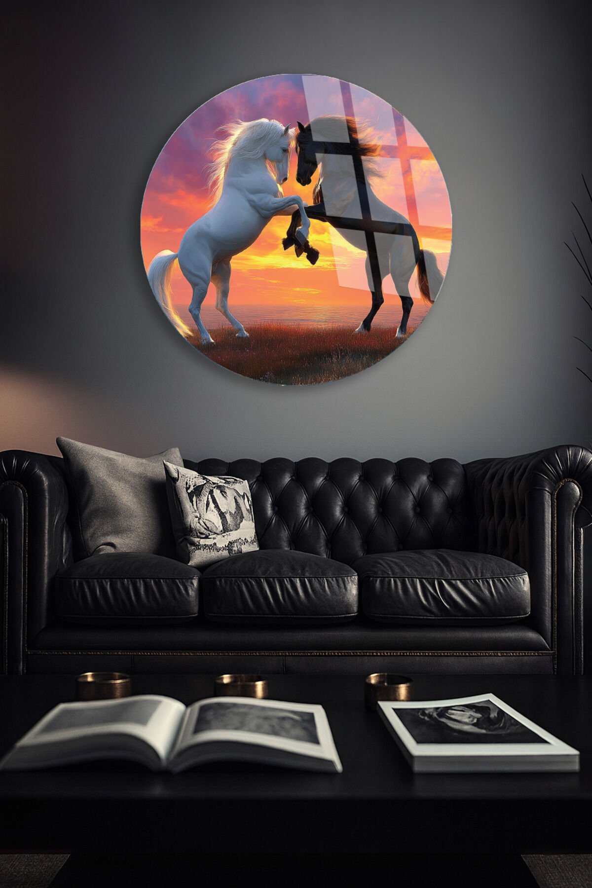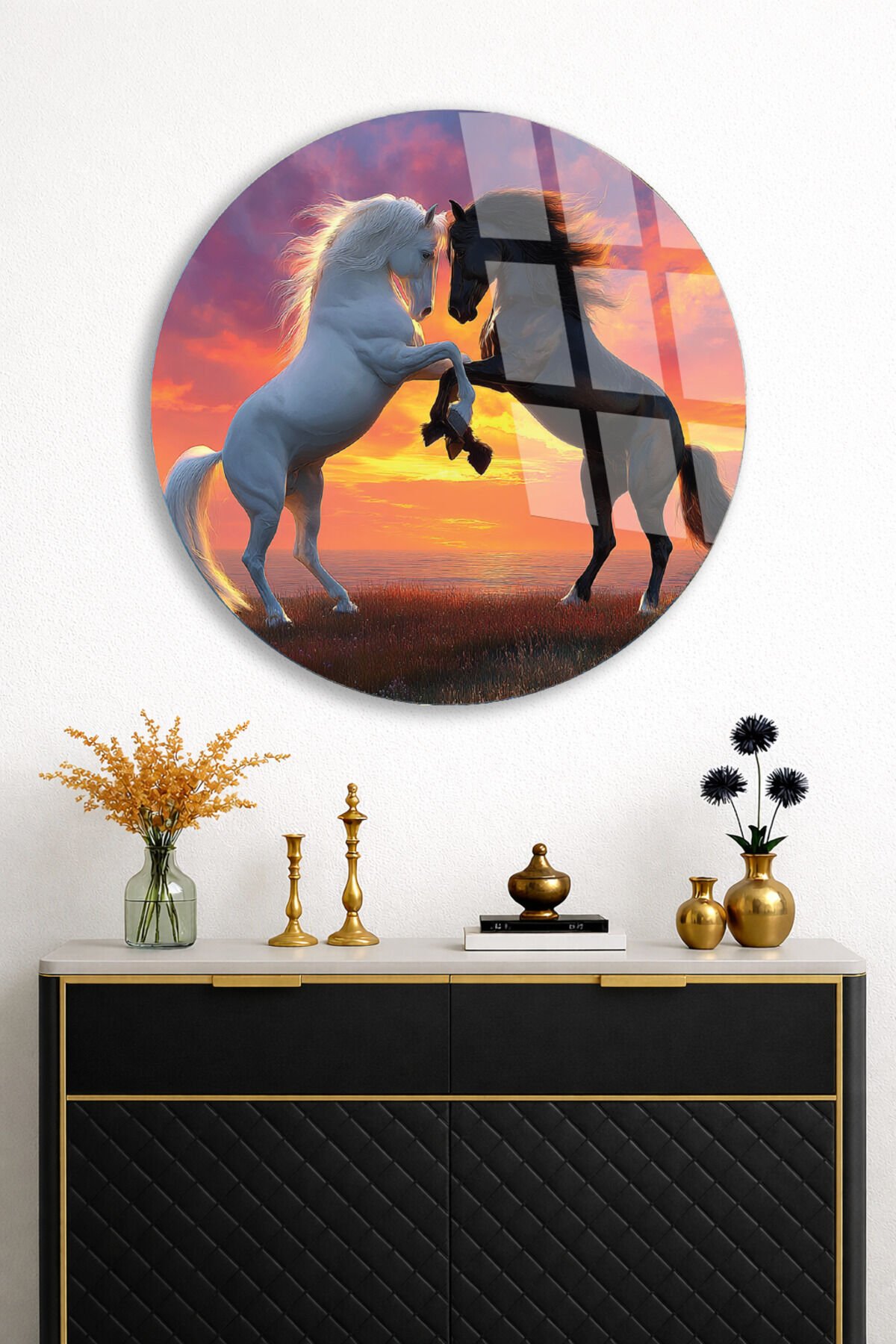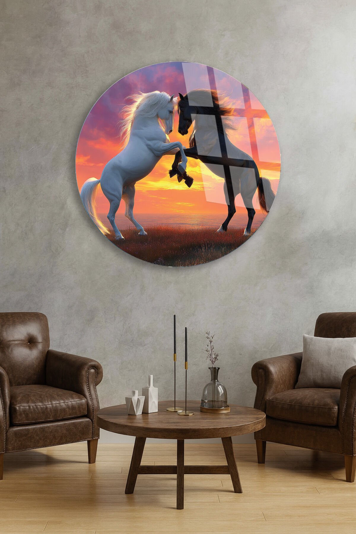 Özgürlüğün Dansı Cam Tablo – Gün Batımında Şahlanan Atlar Turuncu