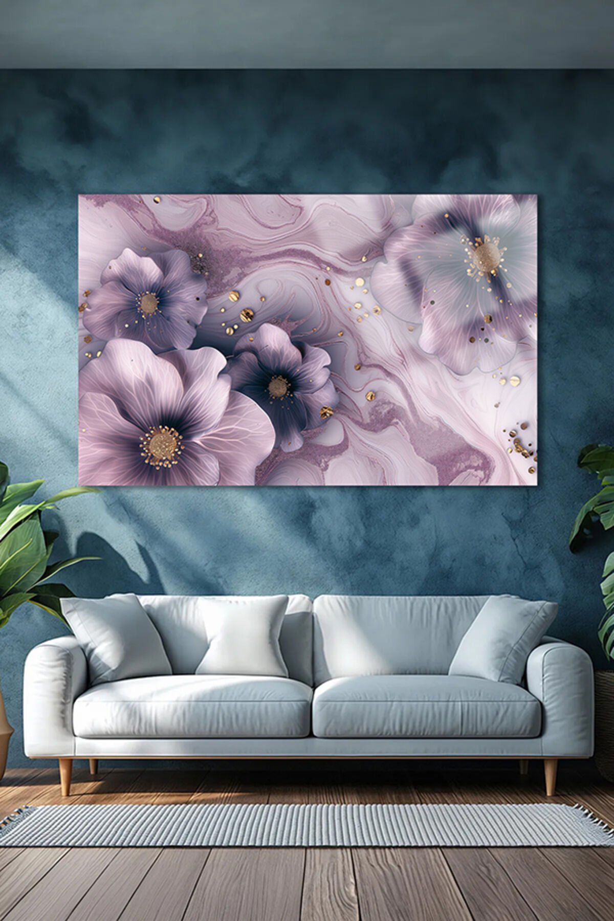 PARILDAYAN GOLD DETAYLI MOR ÇİÇEKLER YATAY CAM TABLO KIRILMAZ LÜKS CAM TABLO EV HEDİYESİ