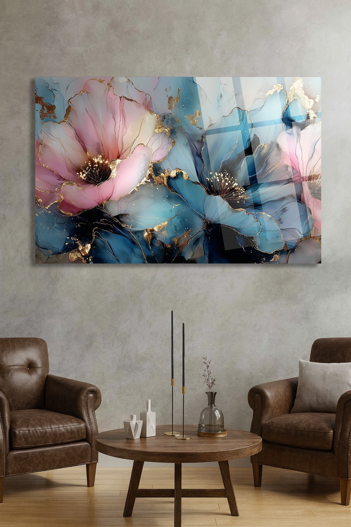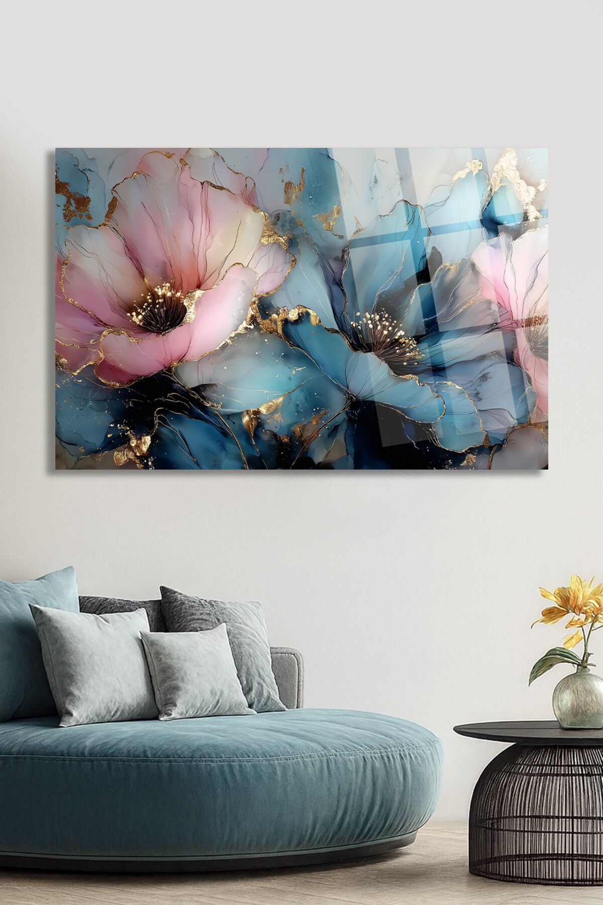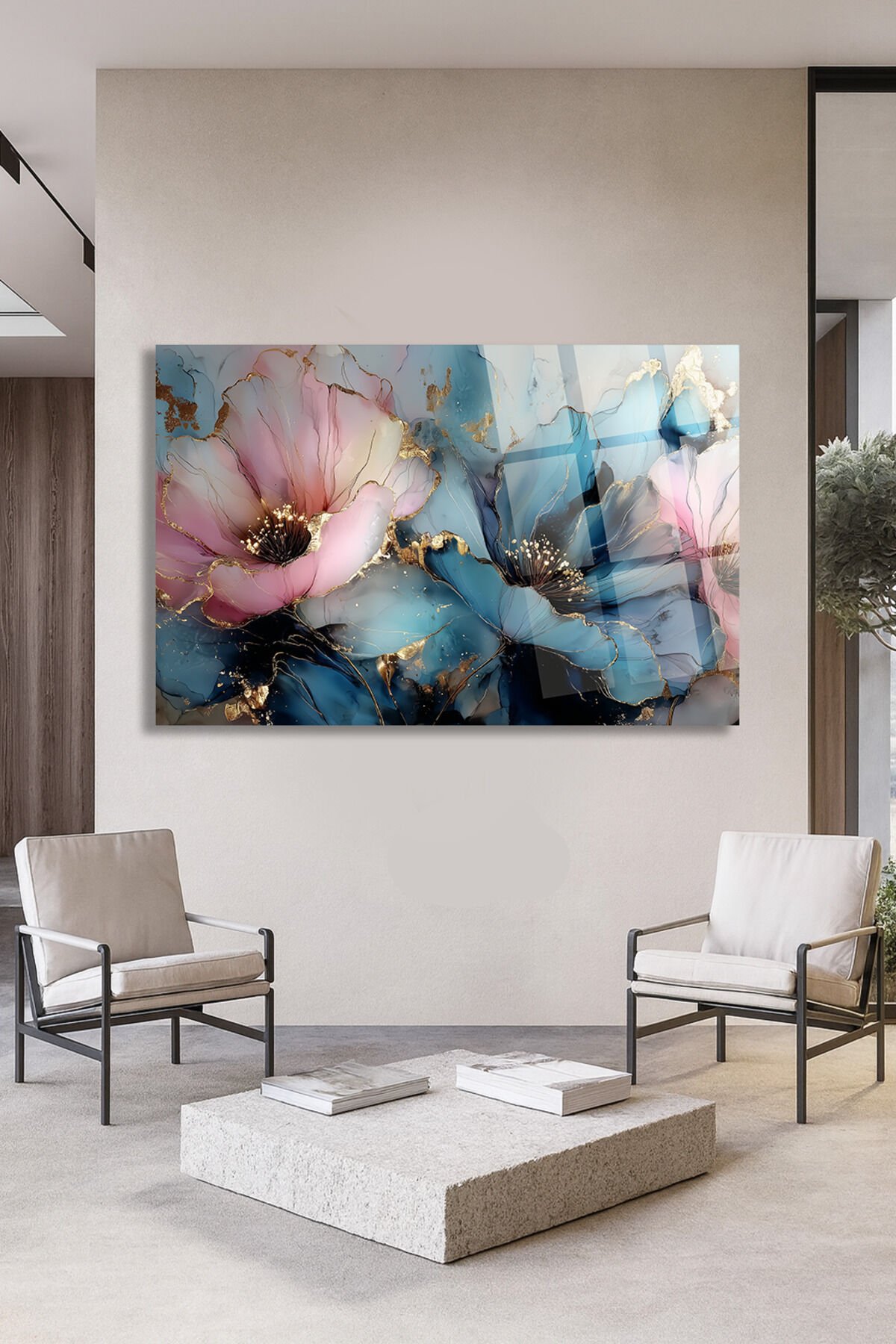 PARILTILI SOYUT ÇİÇEK KOMPOZİSYONLU ŞIK EV HEDİYESİ TABLO MODERN DEKORASYON KIRILMAZ LÜKS CAM TABLO Turkuaz