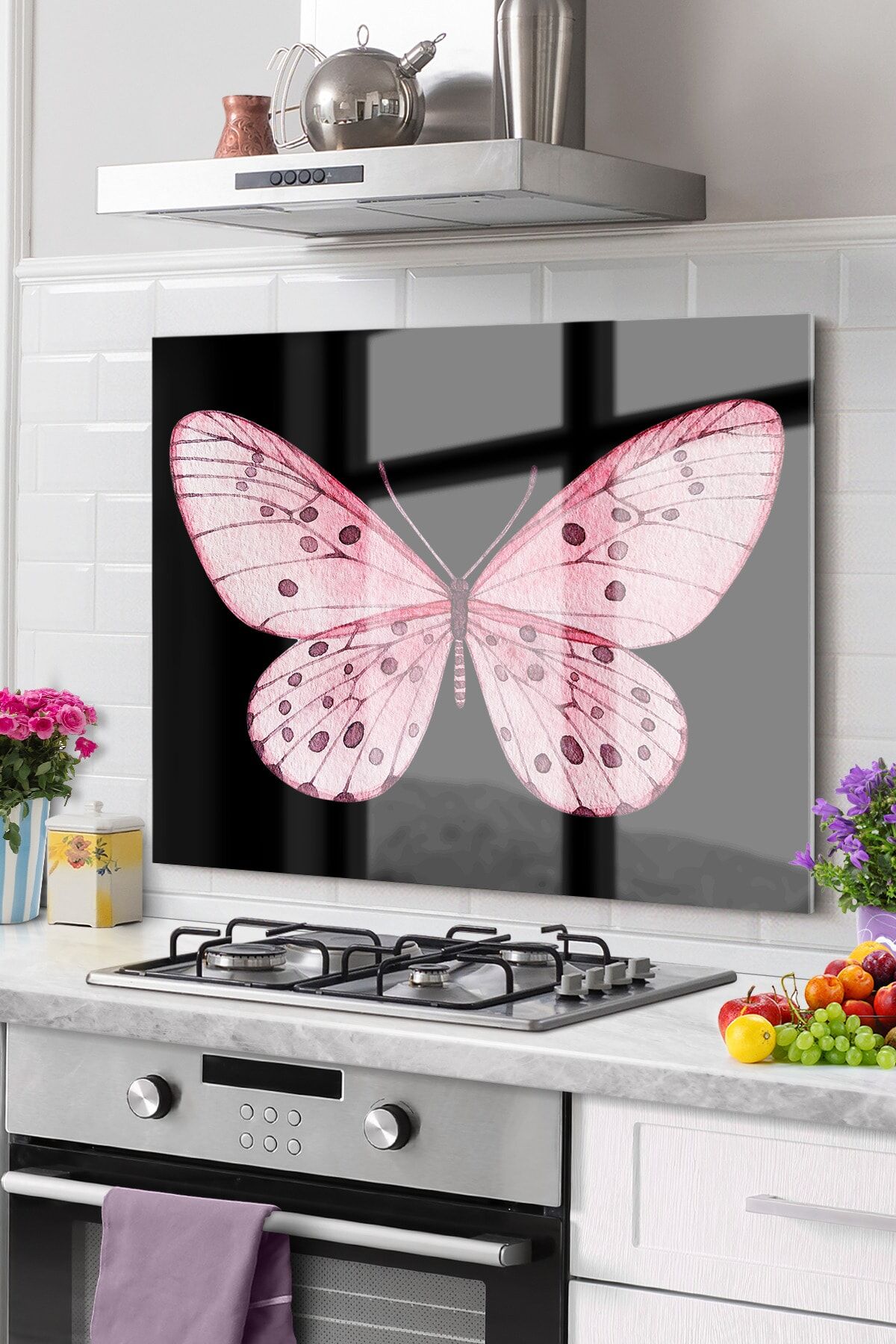 Pembe - Premium Mutfak Cam Ocak Arkası Koruyucu Tezgah Ankastre Arkası Koruyucu 52x60cm | Kelebek Pembe