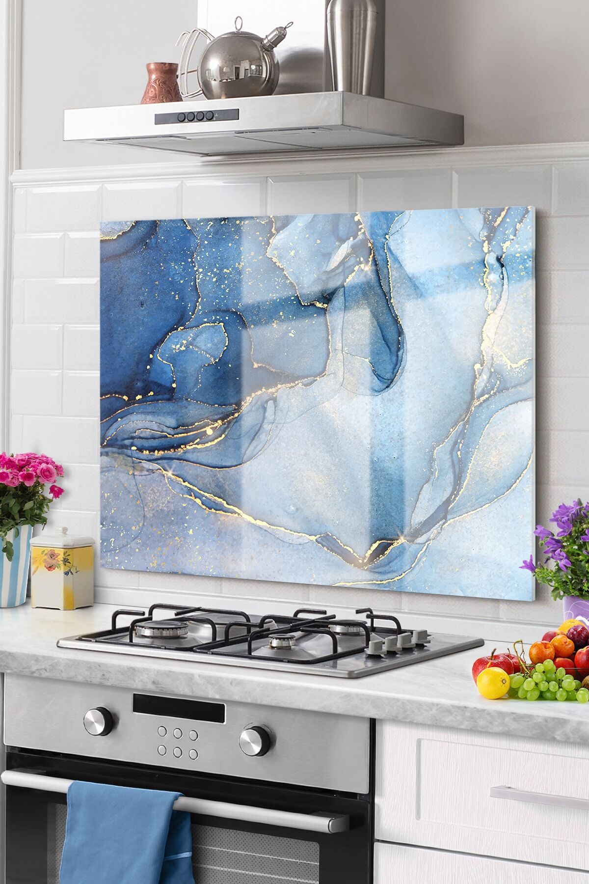 Premium Mutfak Cam Ocak Arkası Koruyucu Tezgah Ankastre Arkası Koruyucu 50x76cm | Mermer Mavi