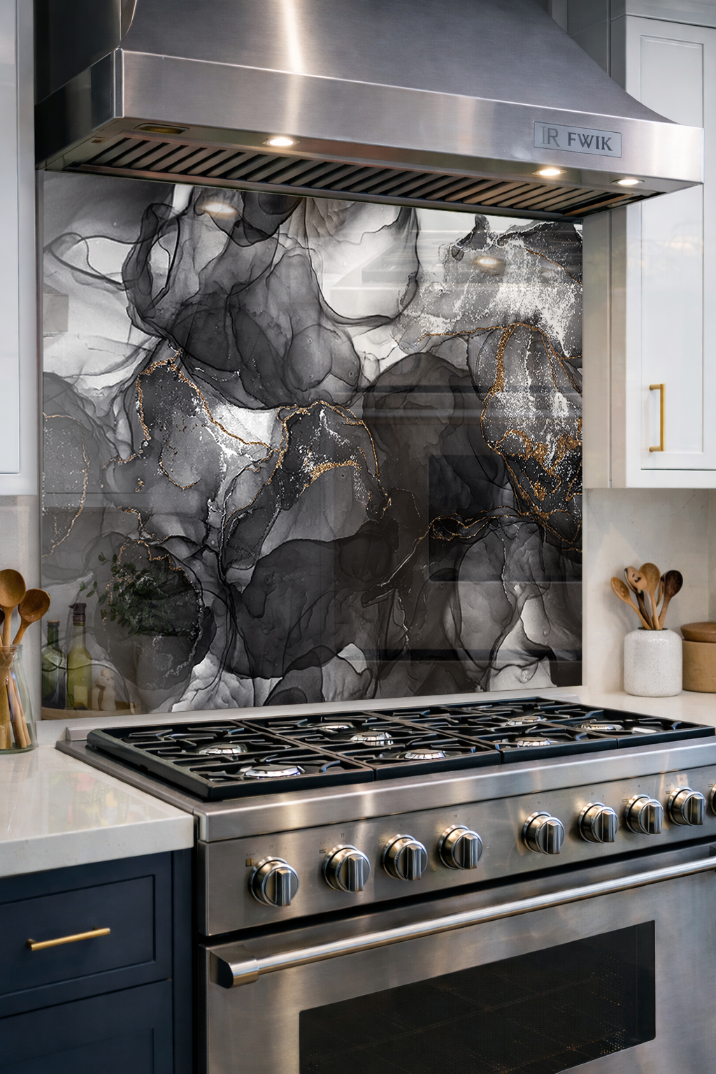 Premium Mutfak Cam Ocak Arkası Koruyucu Tezgah Ankastre Arkası Koruyucu | Siyah Beyaz Tasarım
