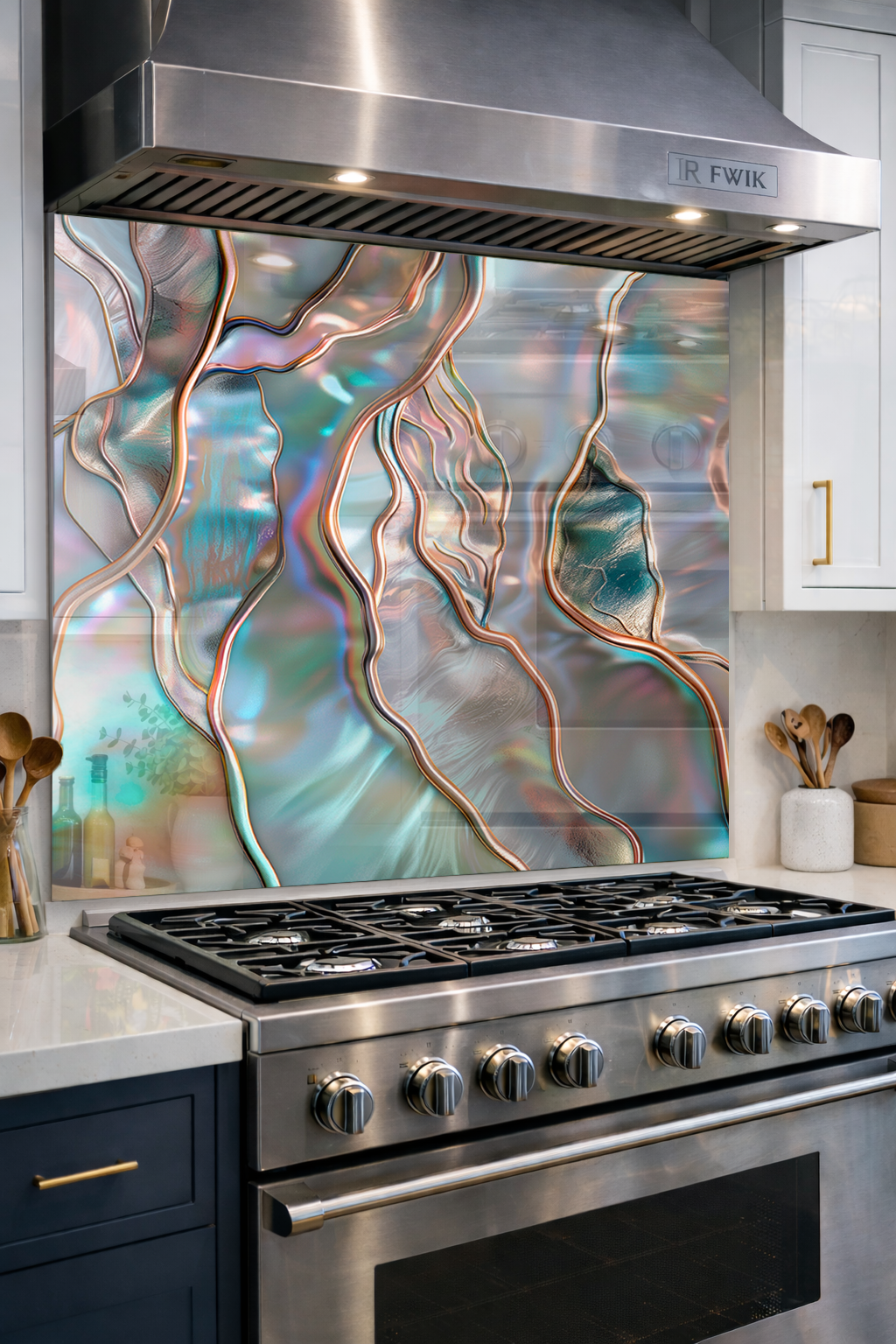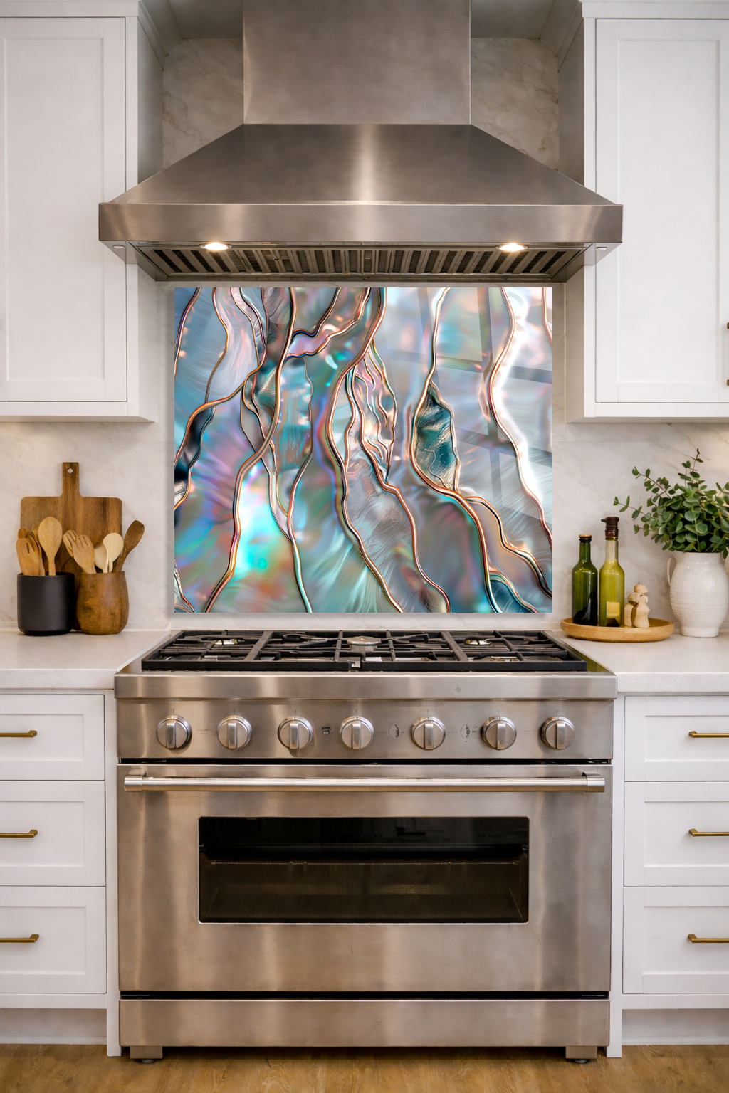 Premium Mutfak Cam Ocak Arkası Koruyucu Tezgah Ankastre Arkası Koruyucu | Soyut Akışkan Tasarım