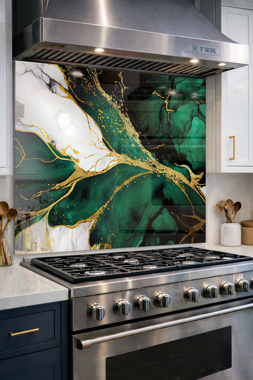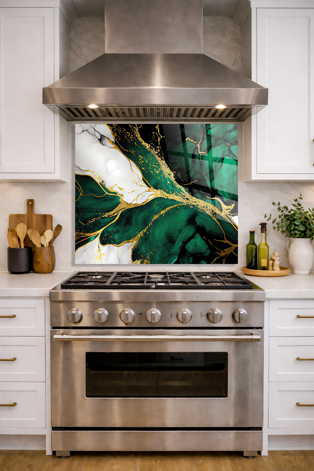 Premium Mutfak Cam Ocak Arkası Koruyucu Tezgah Ankastre Arkası Koruyucu | Yeşil Lüks Mermer Tasarımı