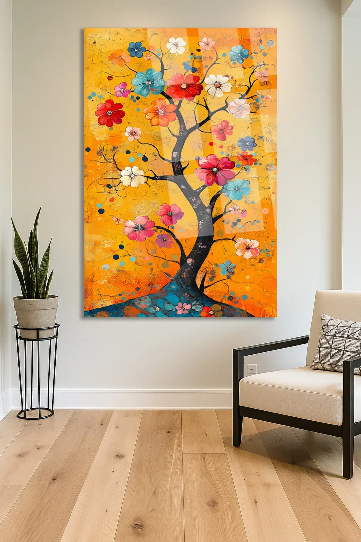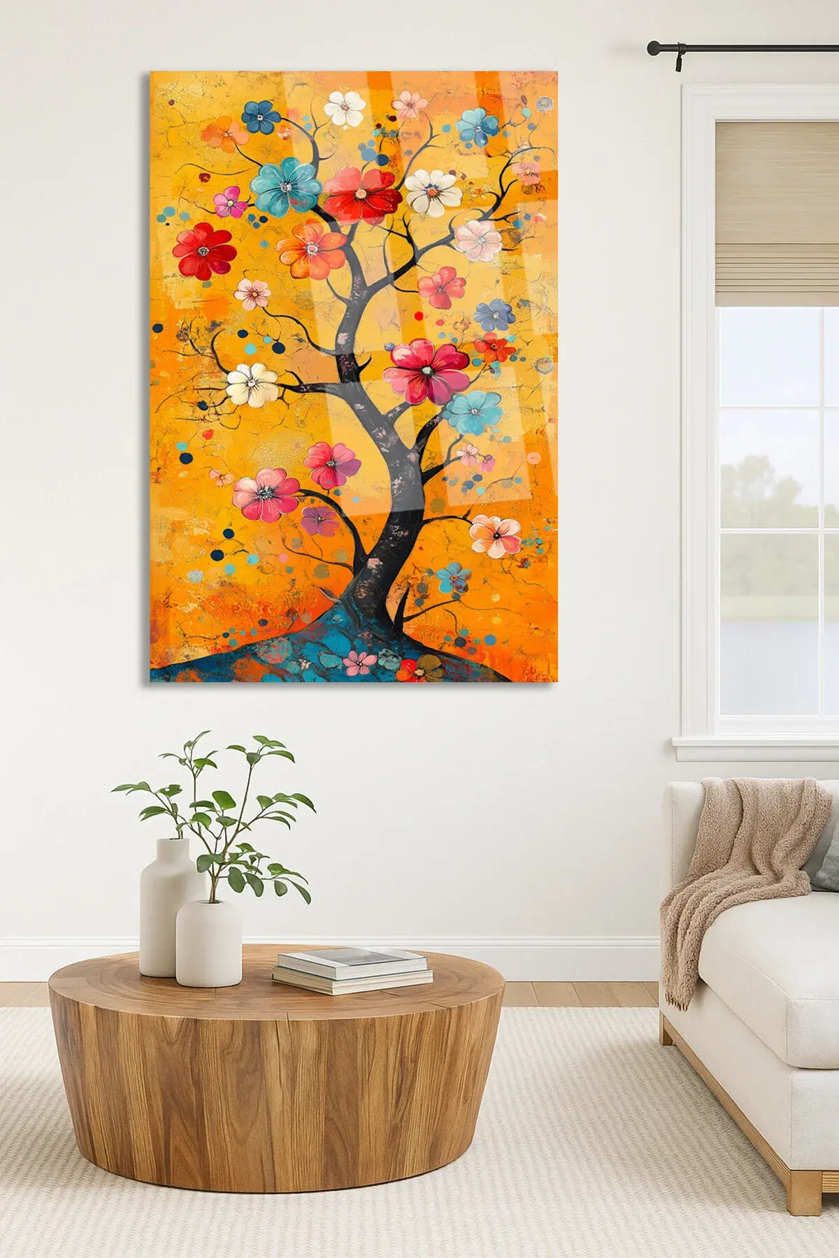 RENGARENK ÇİÇEK AÇAN AĞAÇ YÜKSEK KALİTE MODERN KIRILMAZ LÜKS CAM TABLO LÜKS TABLO Turuncu