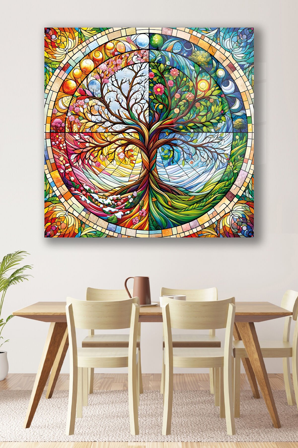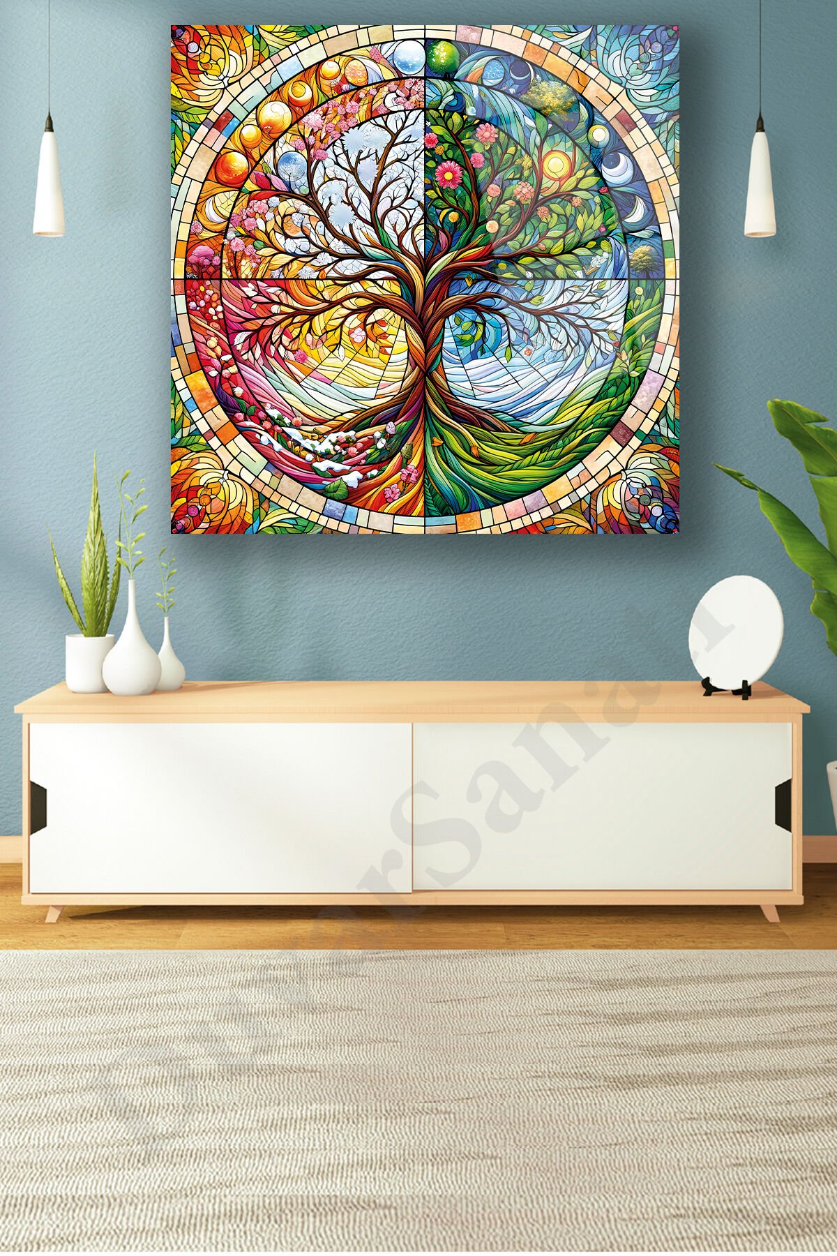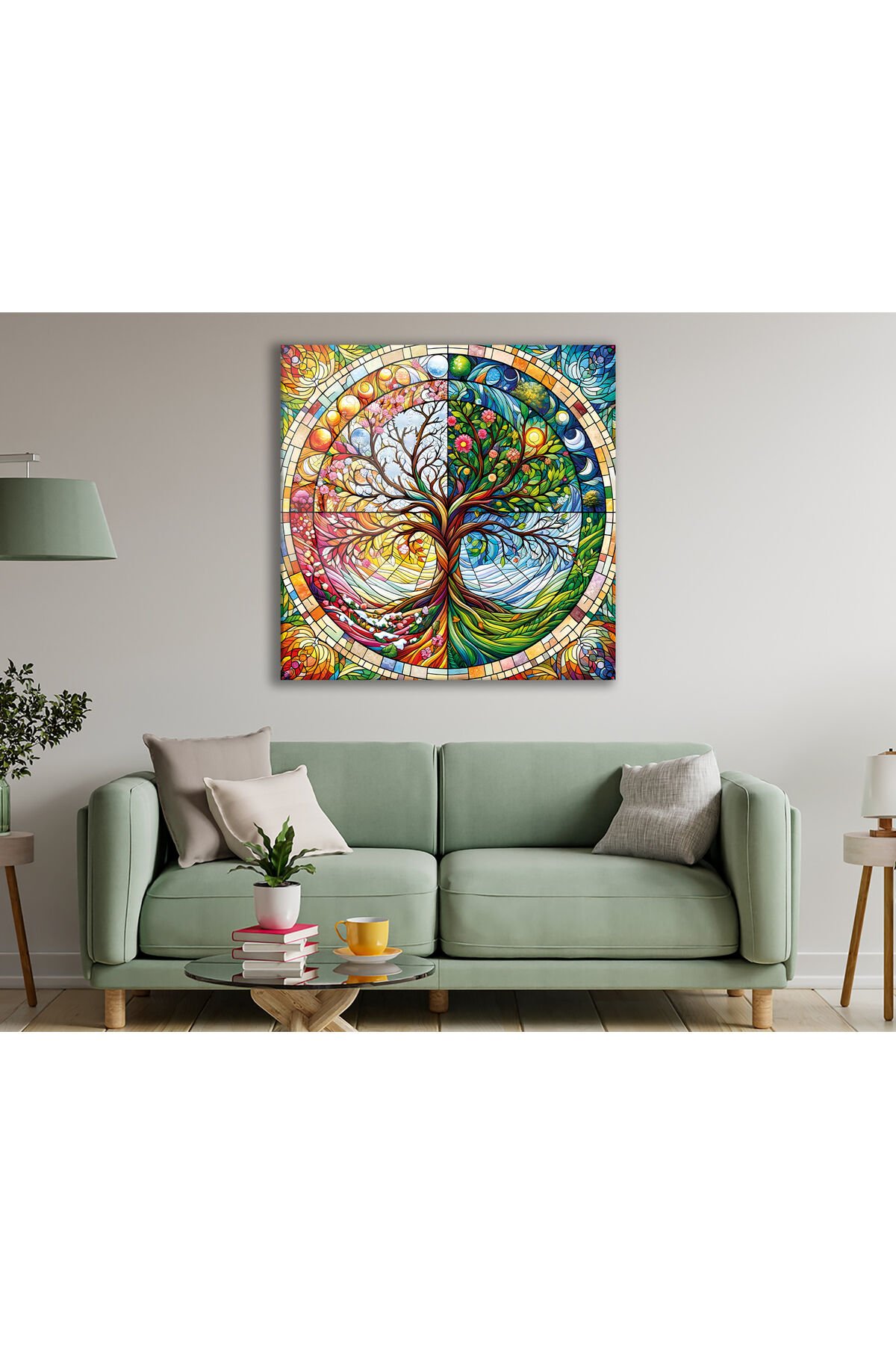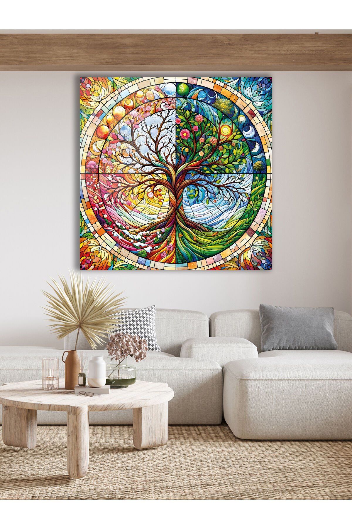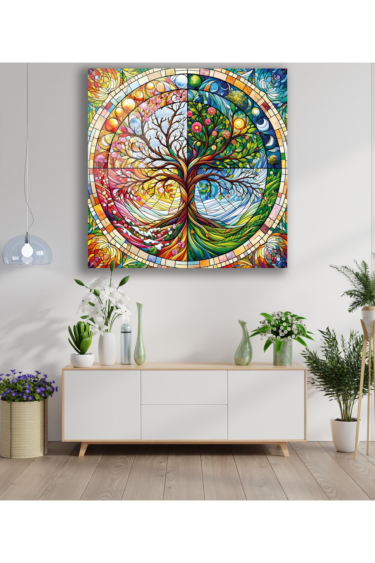 Rengarenk Hayat Ağacı Kare Cam Tablo, Modern Ev Salon Ofis Dekorasyonu Büyük Duvar Dekoru Rengarenk