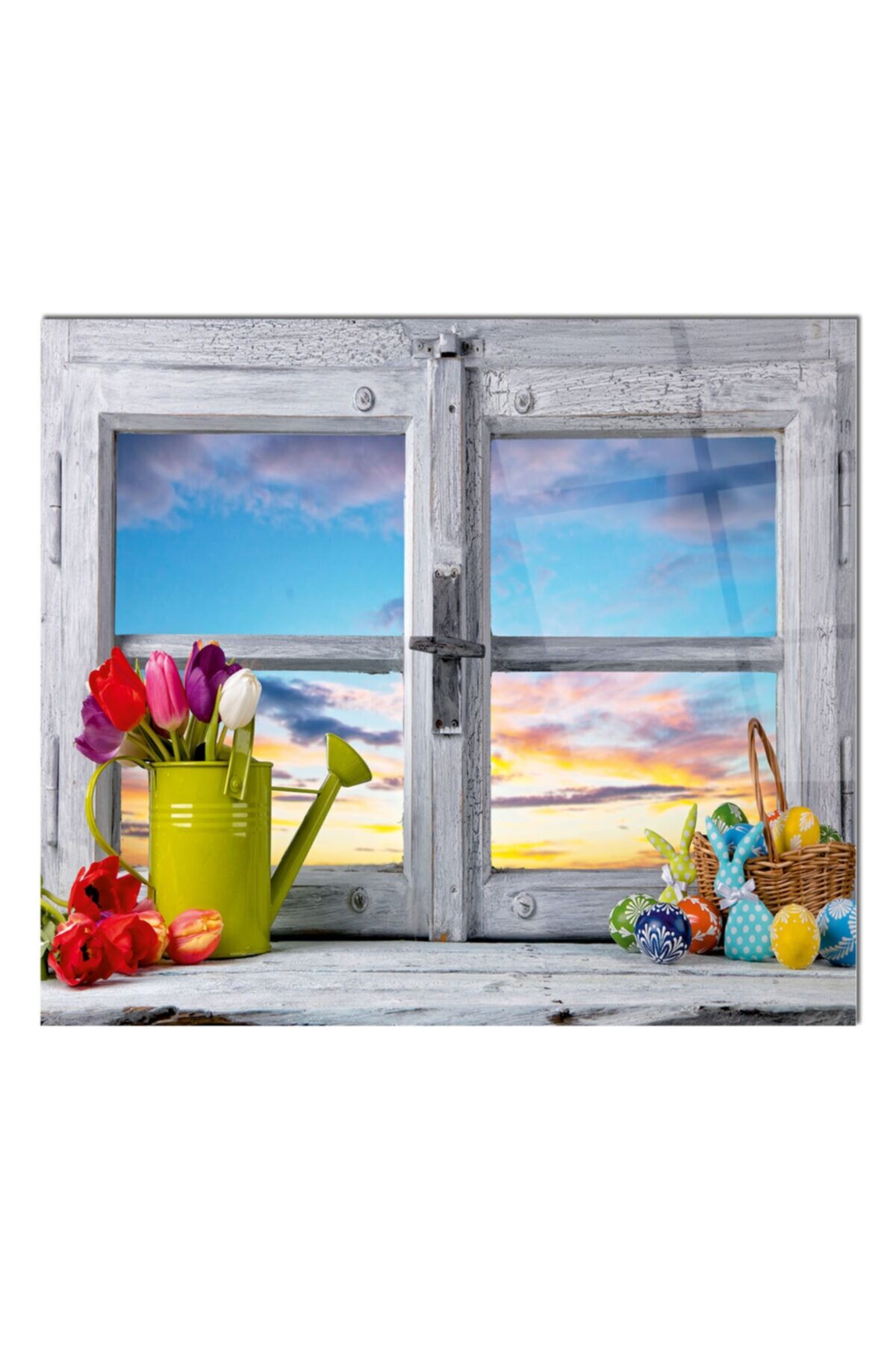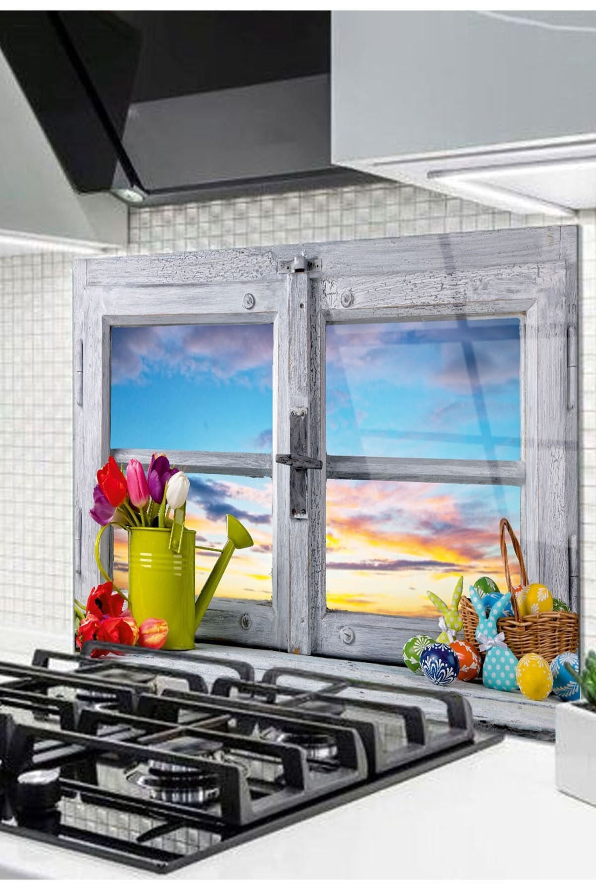 Renkli - 50x50 Cm Cam Ocak Arkası Koruyucu Tezgah Ankastre Arkası Koruyucu | Pencere Ve Laleler