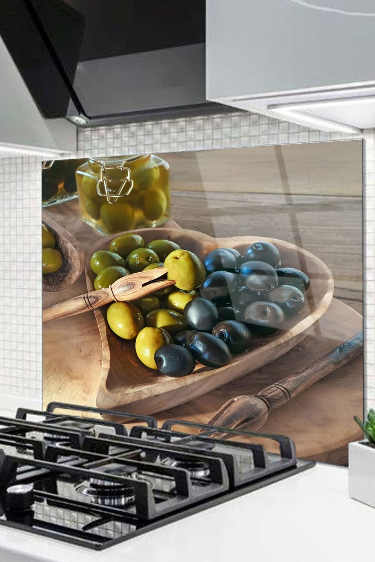 Renkli - 76x49,5 Cm Cam Ocak Arkası Koruyucu Tezgah Ankastre Arkası Koruyucu | Zeytin