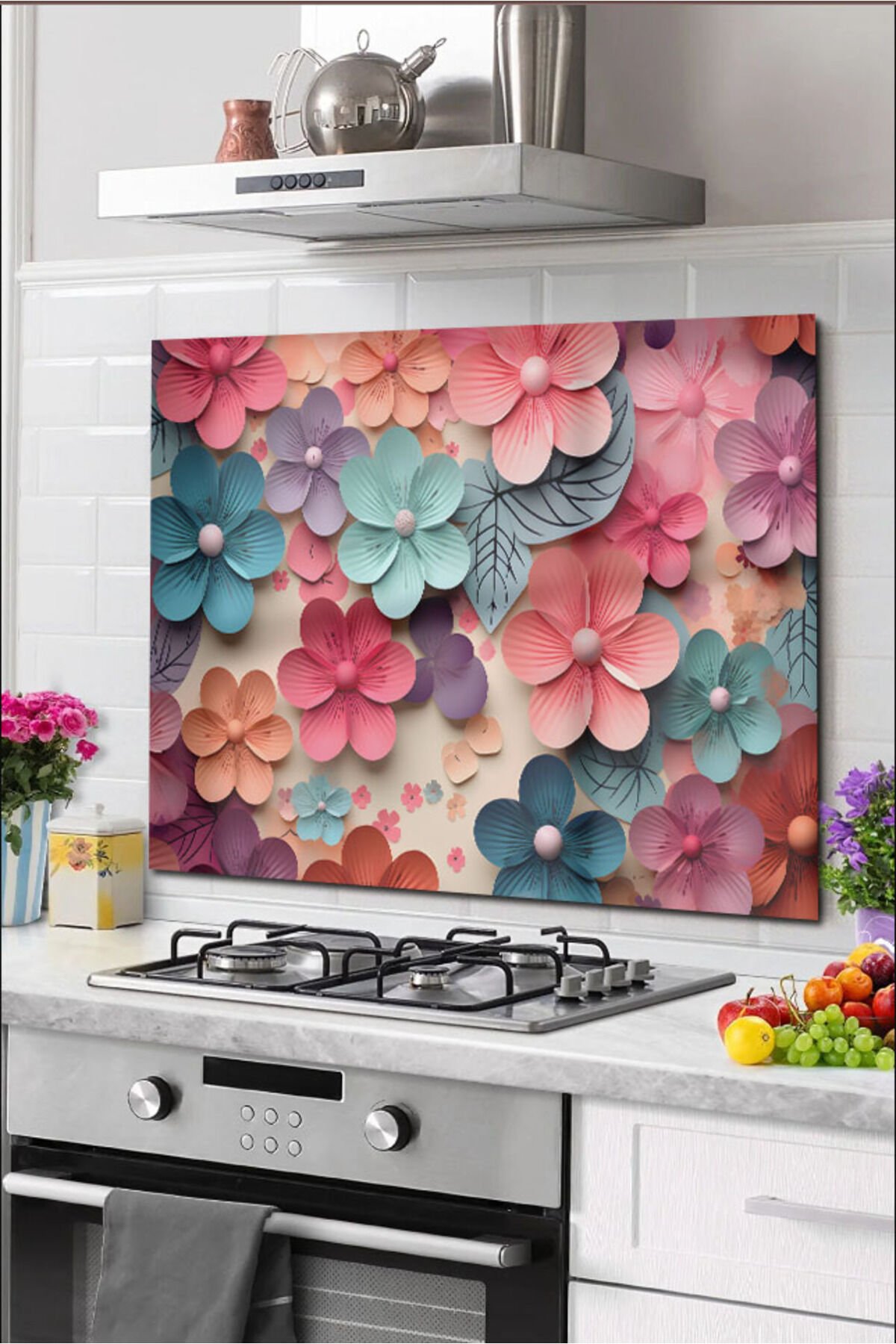 Cam Ocak Arkası Koruyucu Tezgah Ankastre Arkası Koruyucu 60x52 cm | Renkli Çiçekler Ocakların tezgah arkalarında oluşturmuş olduğu yağ vb. kirlerin cam üzerinden temizlenmesi çok daha kolaydır. ; Nemli bezle kolaylıkla temizlenebilme özelliğine sahiptir. ; Duvara montajı son derece basit olan bu şık ürün ile farklı yenilikçi iç dekorasyon çözümü sunulmaktadır. ; Arka kısmında bulunan çift taraflı bant ile kolayca monte edebilirsiniz. ; Mutfak dekoru olarak canlı renkleriyle şık bir görünüm sağlar. ; UV baskı tekniği ile kendi üretimimizdir. ; Isıya dayanıklıdır. ; 4mm kalınlığında temperli camdır. ;