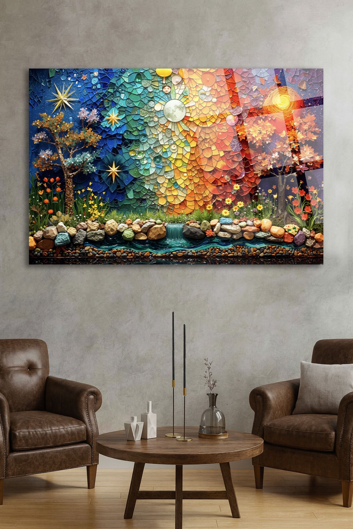 RENKLİ DOĞA MANZARA MOZAİK DETAYLI ULTRA CANLI EV DEKOR TABLOSU KIRILMAZ LÜKS CAM TABLO Turkuaz