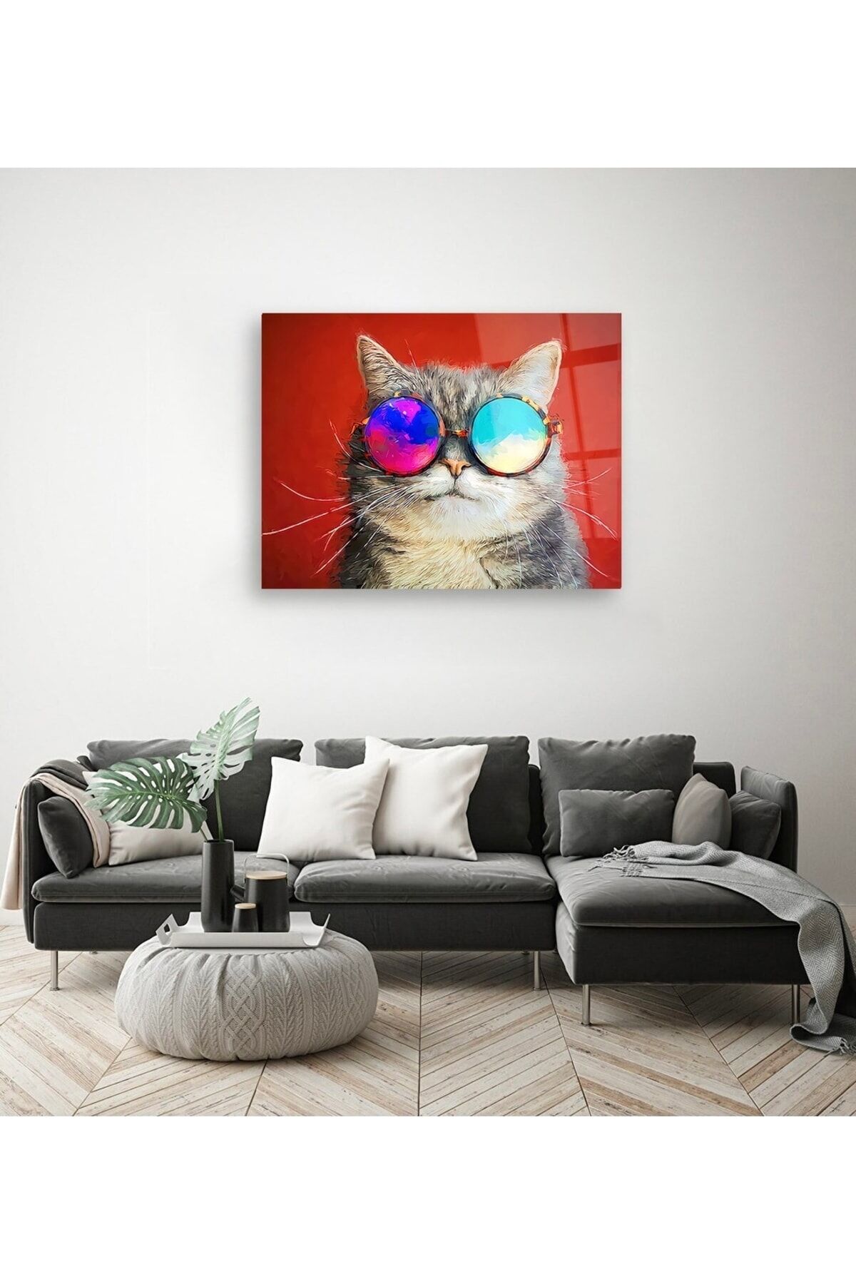 Renkli Gözlüklü Kedi Cam Tablo Renkli