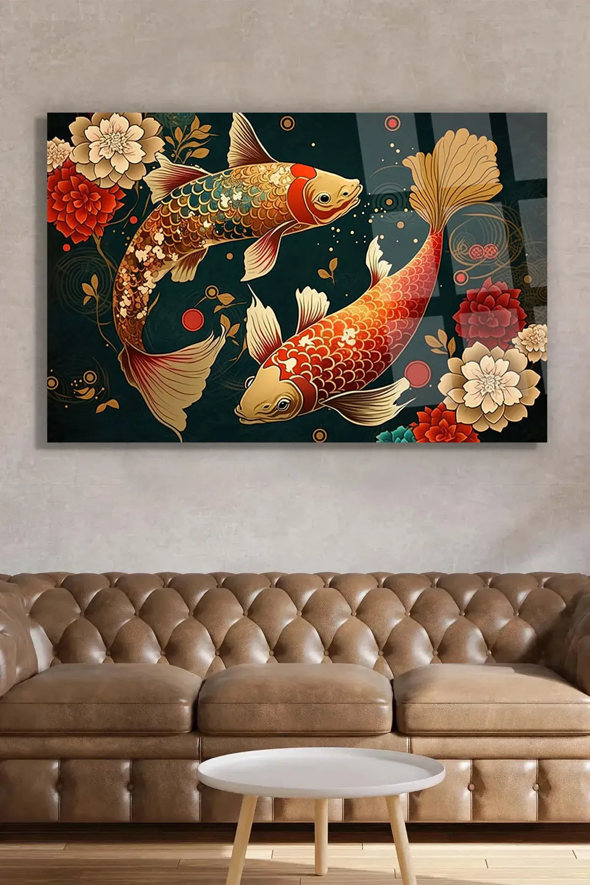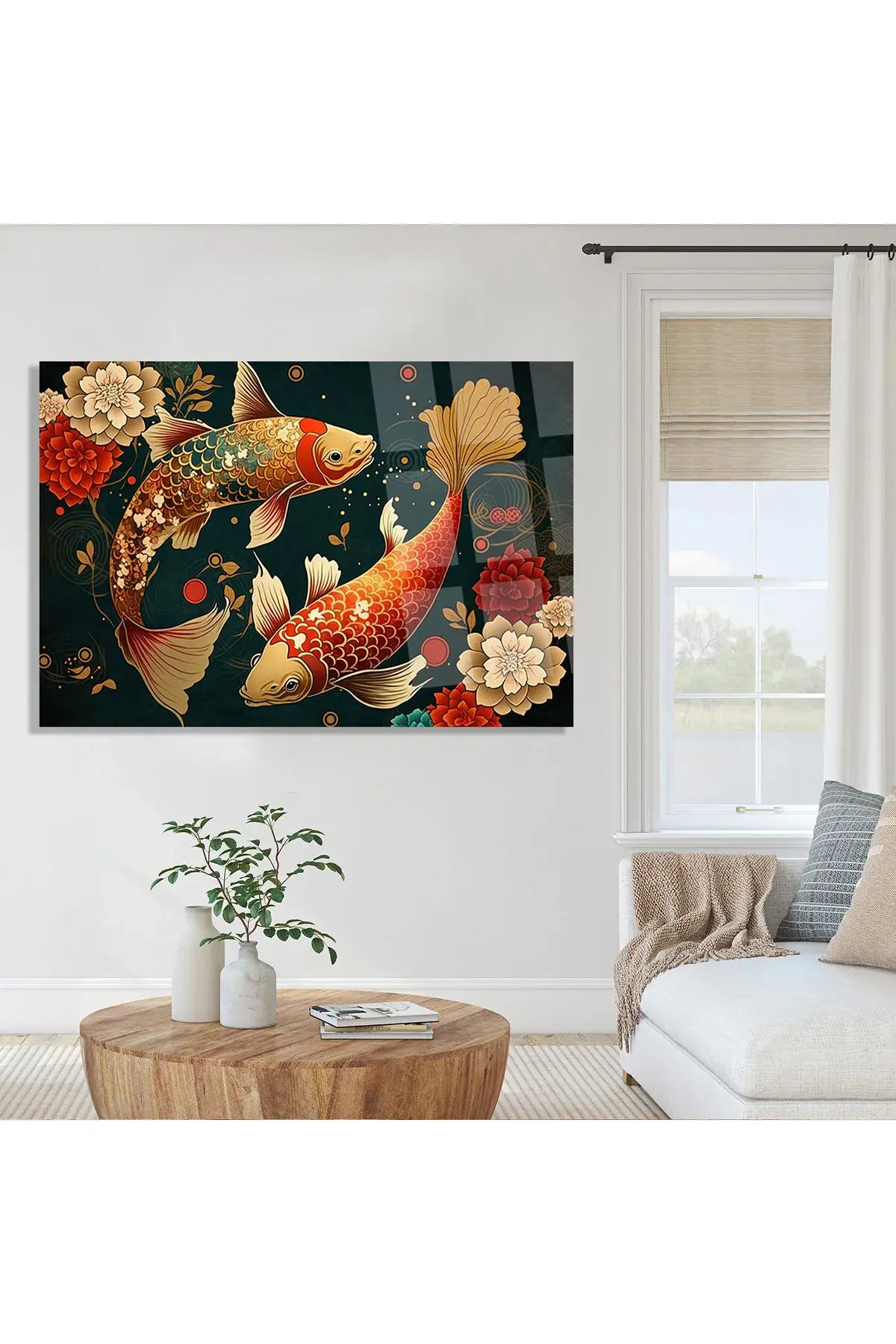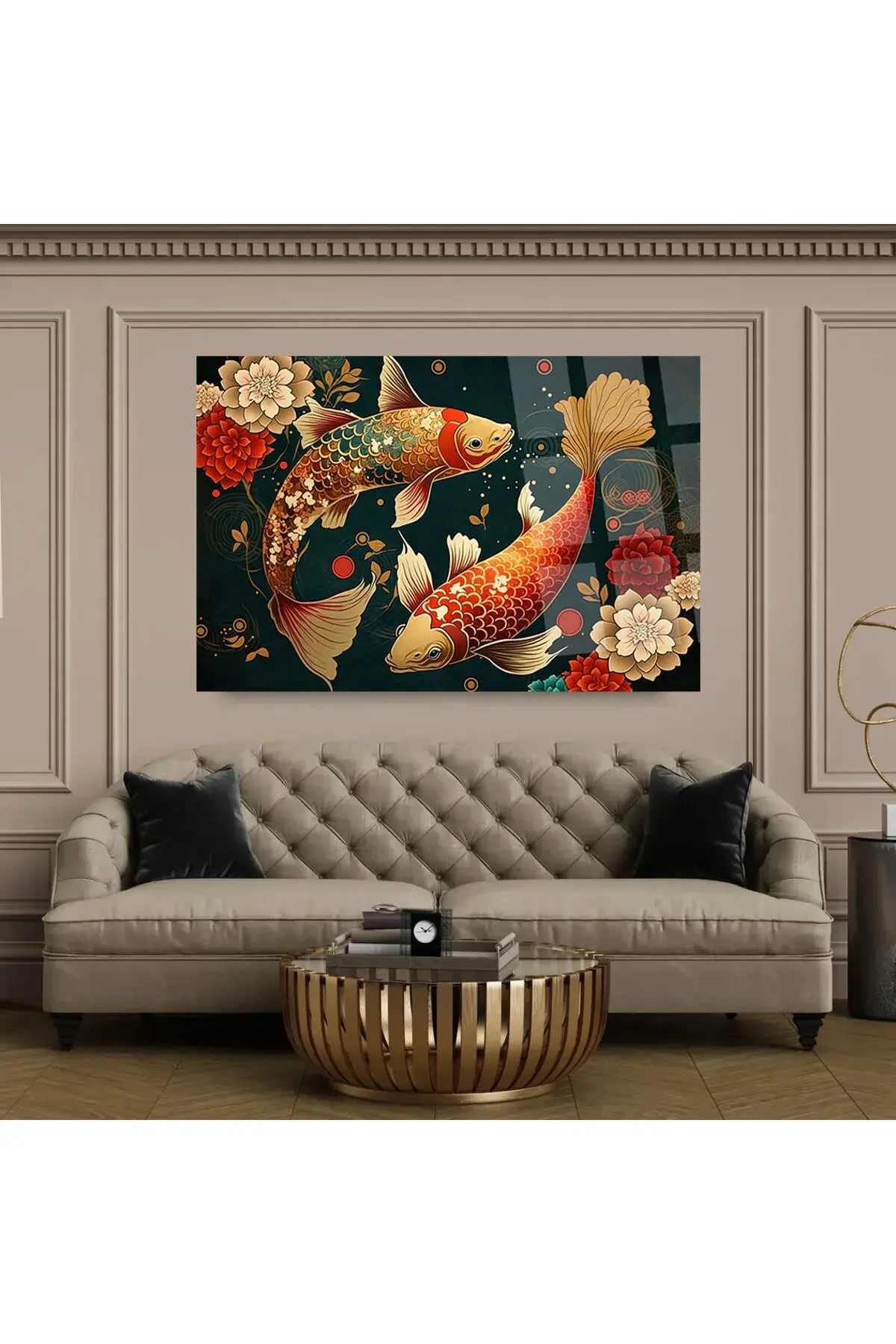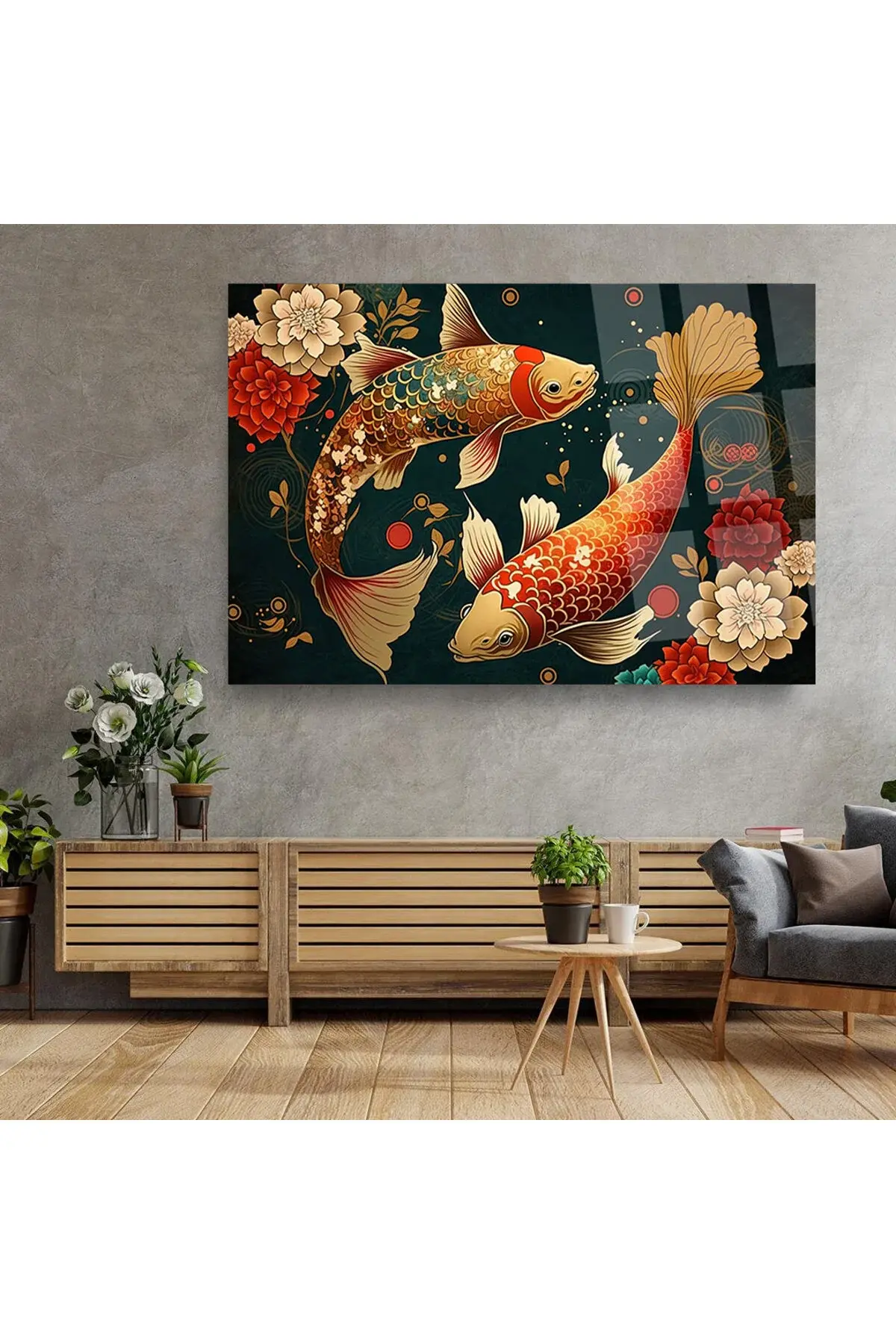 RENKLİ JAPON BALIKLARI JAPON SANATI YATAY KIRILMAZ CAM TABLO ULTRA CANLI RENKLER Turuncu