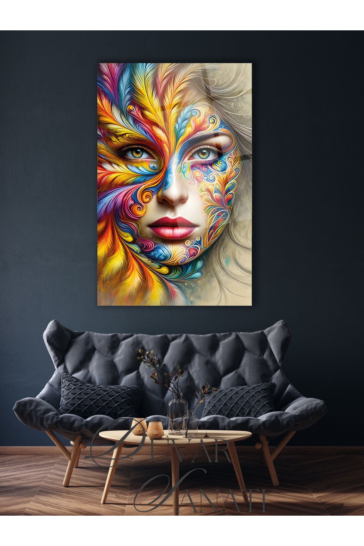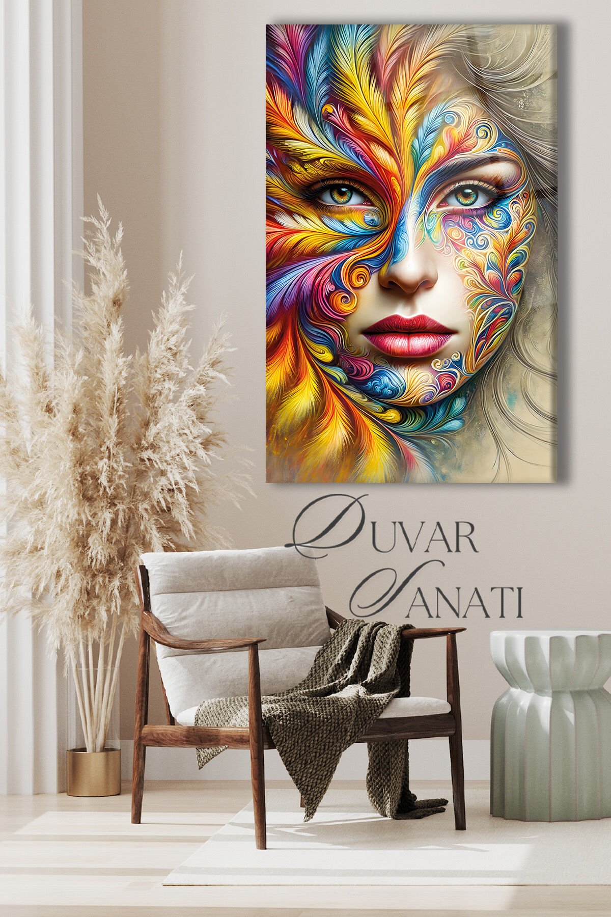 Renkli Kadın Yüzü Dikey Cam Tablo, Modern Ev Ofis Salon Duvar Dekoru , Hediyelik Tablo Çok Renkli