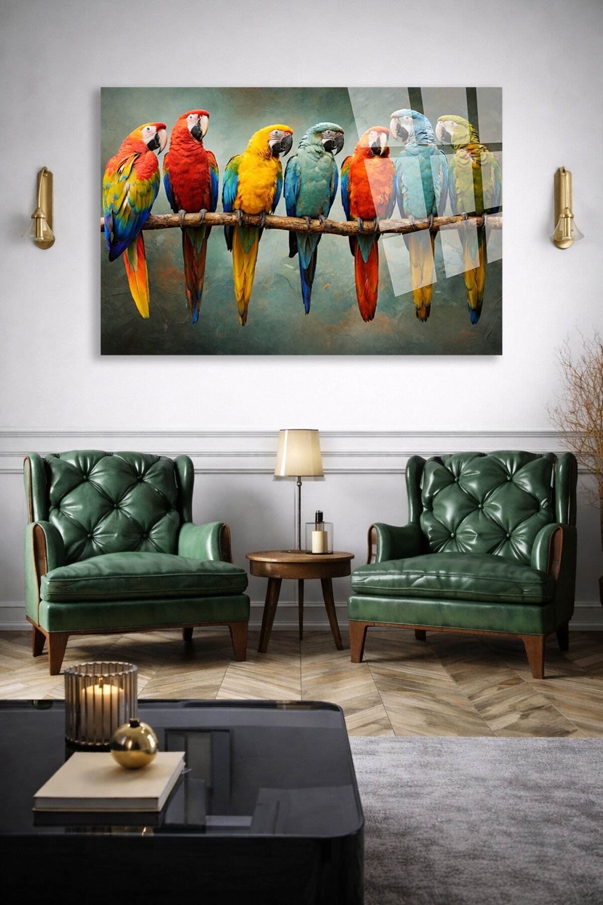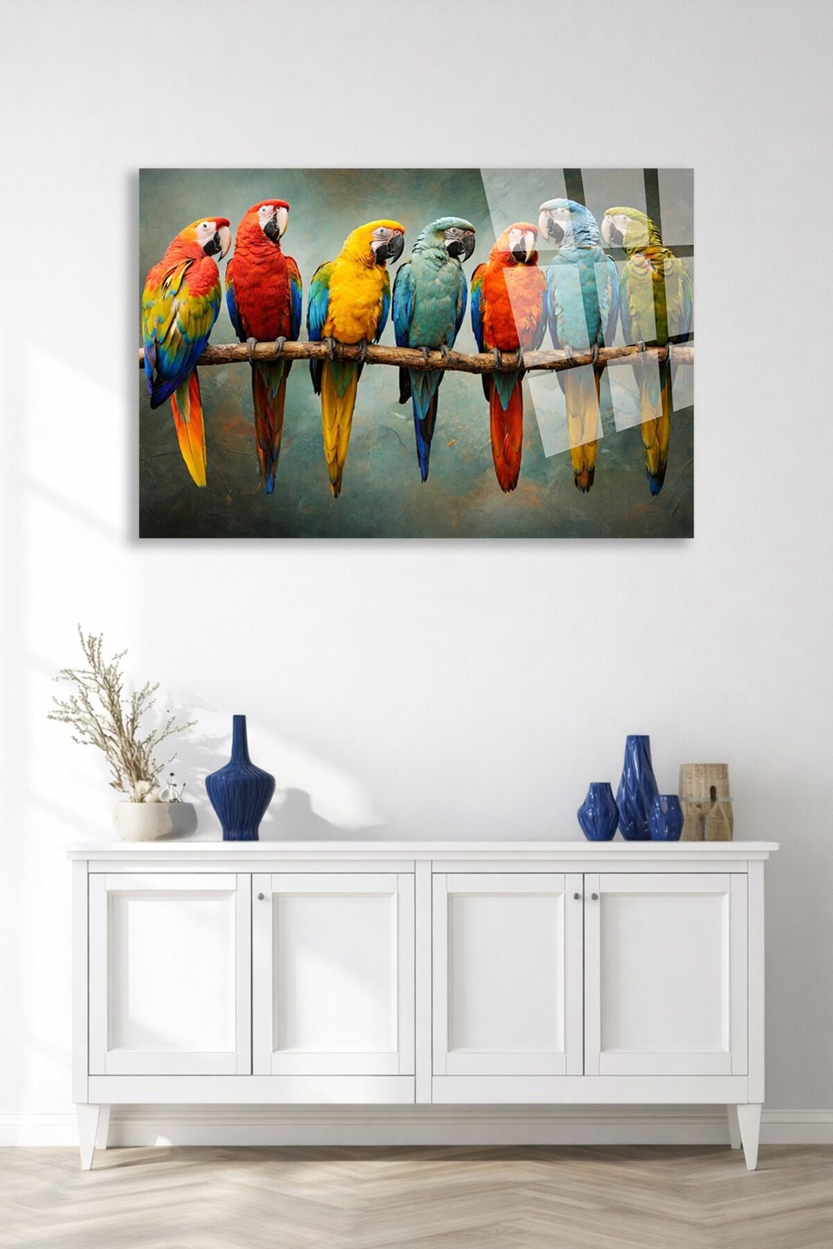 RENKLİ PAPAĞANLAR MODERN TABLO ULTRA CANLI RENKLER KIRILMAZ CAM DUVAR TABLOSU EV OFİS HEDİYESİ