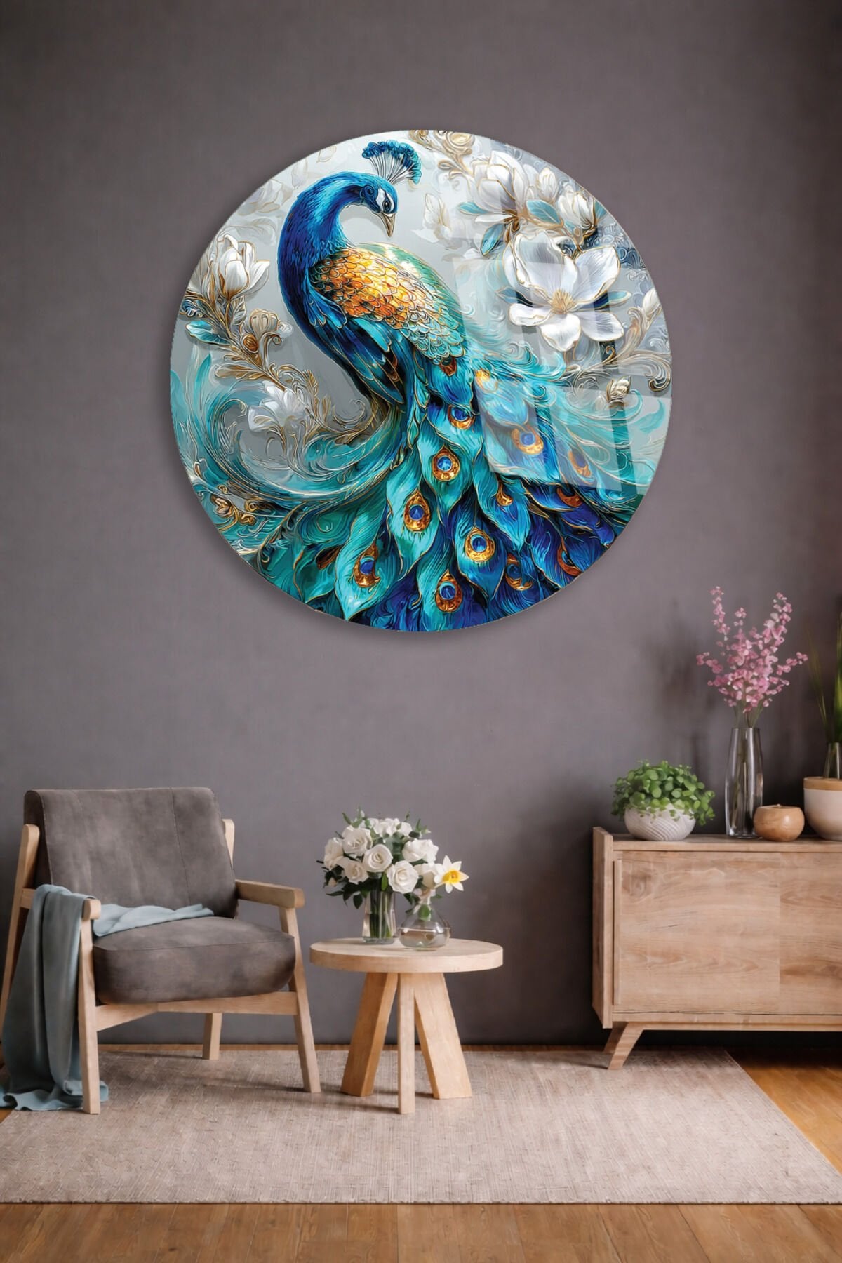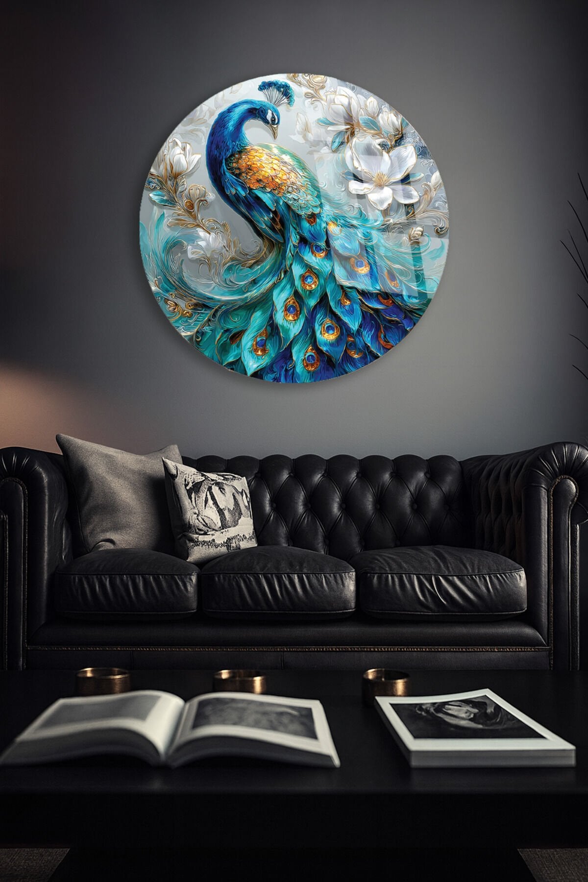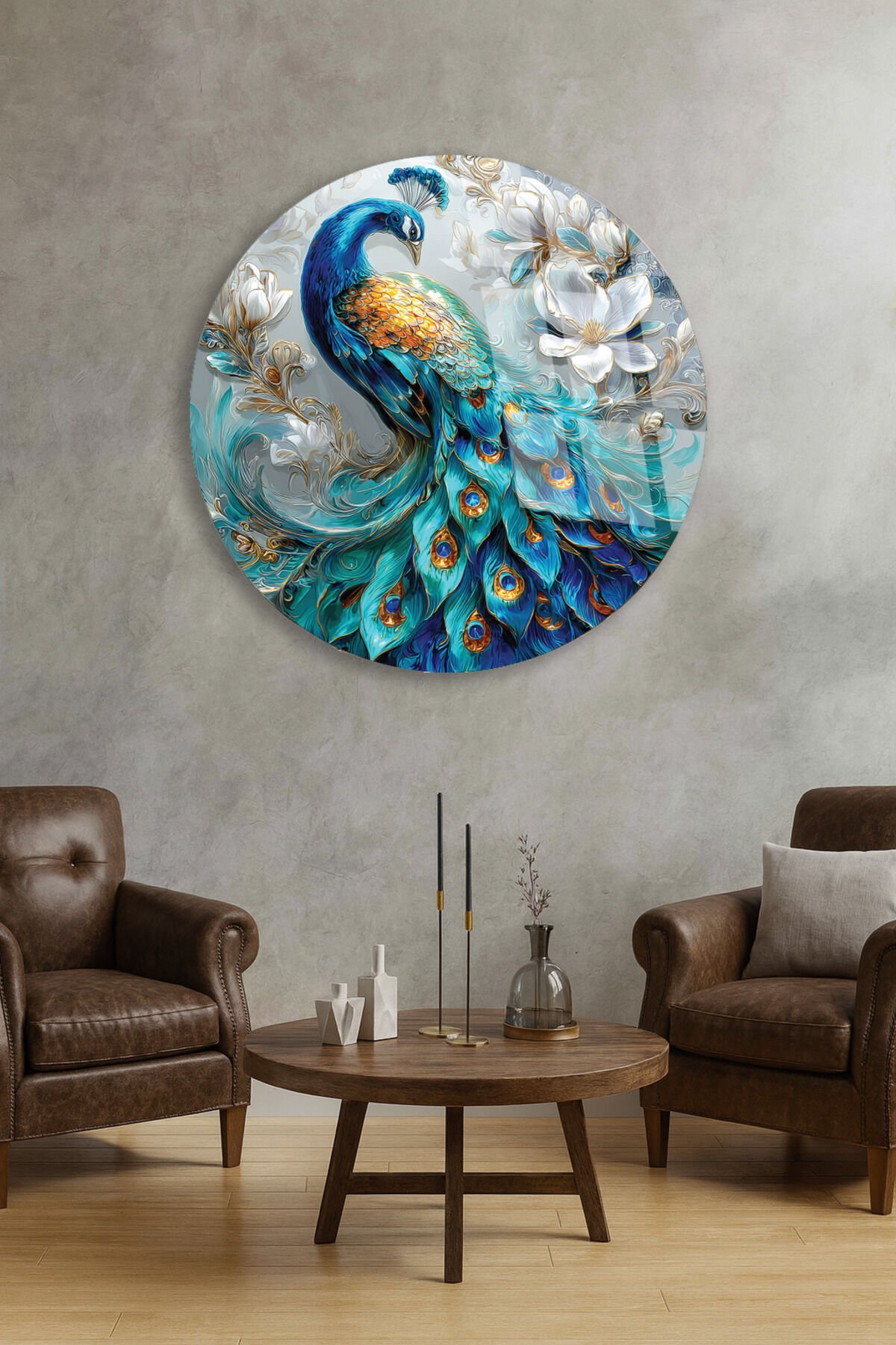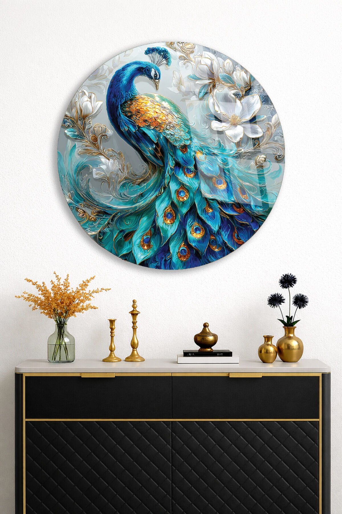 RENKLİ TAVUS KUŞU SANATI ZARİF DEKOR KIRILMAZ CAM TABLO Turkuaz