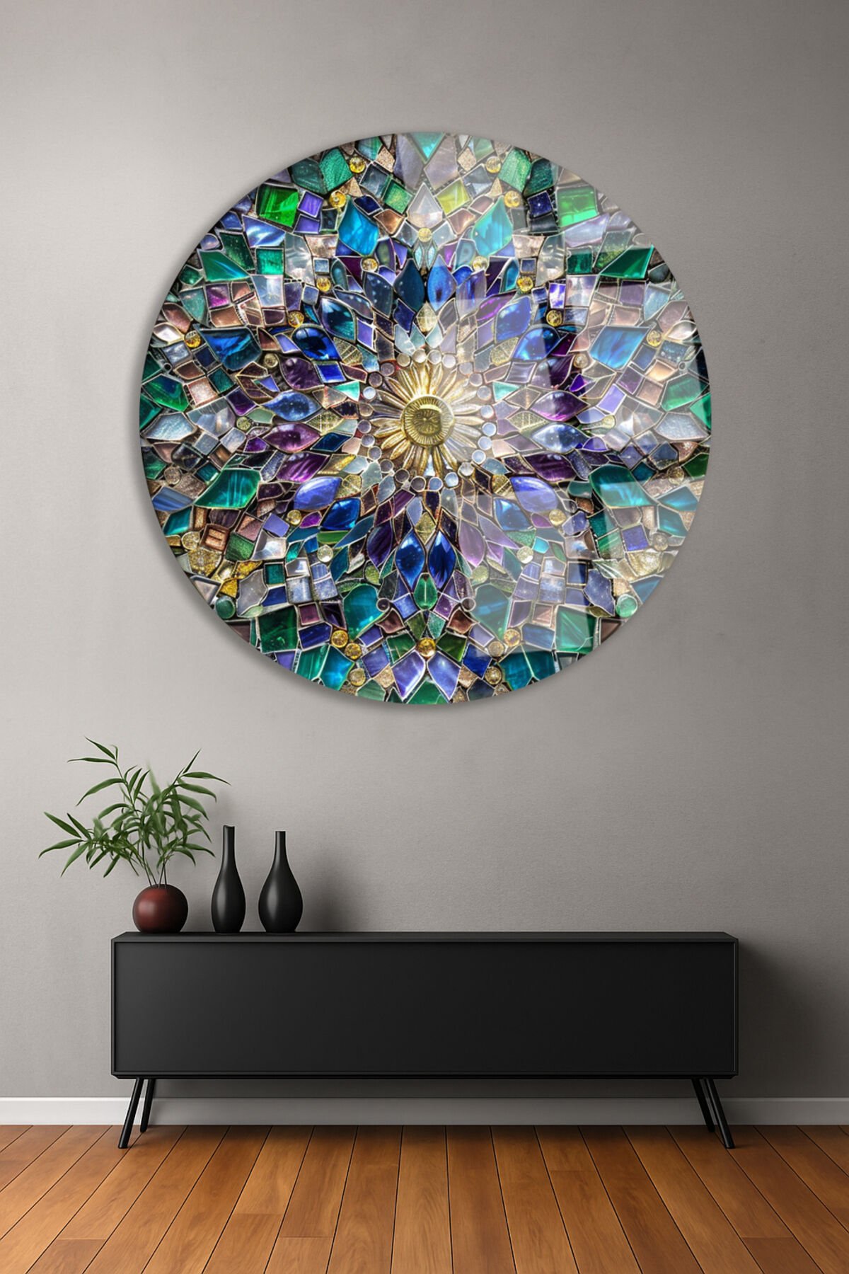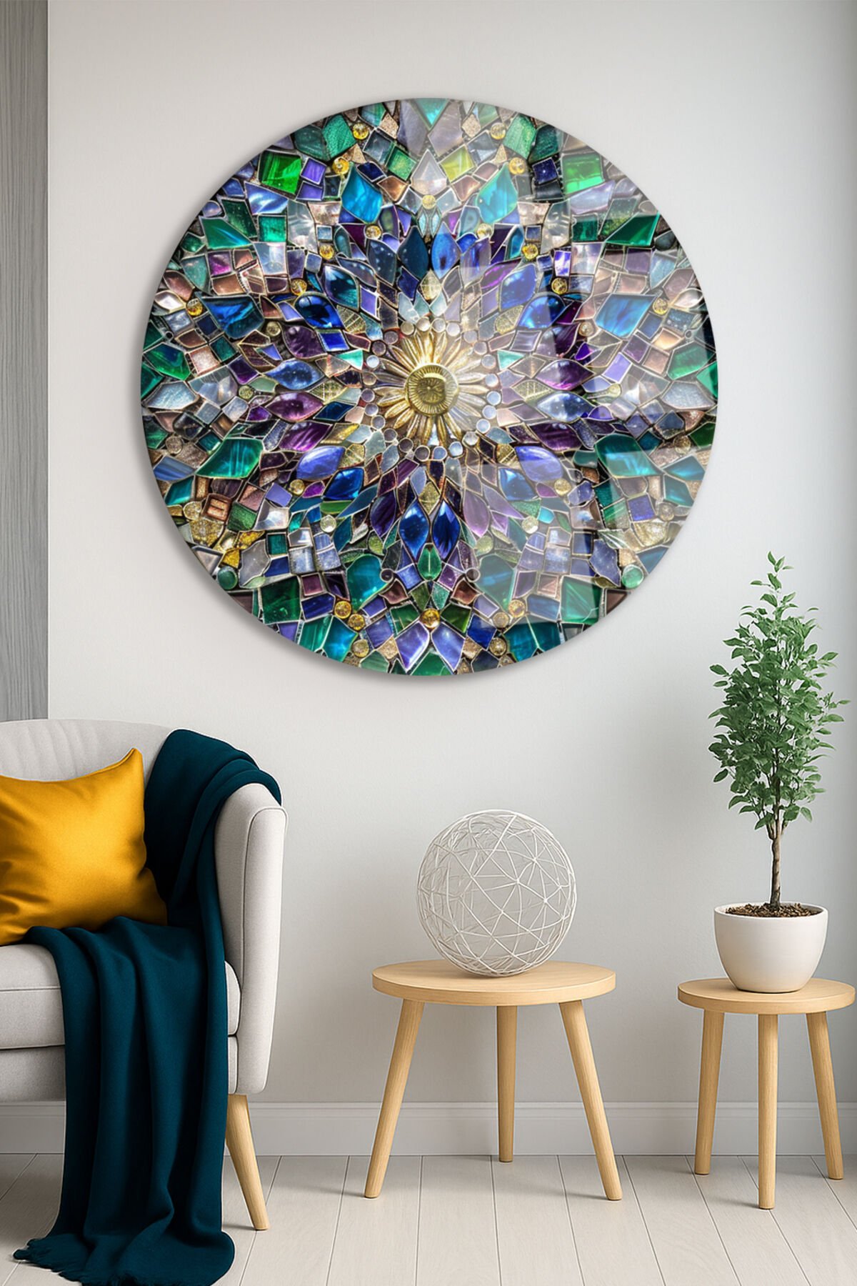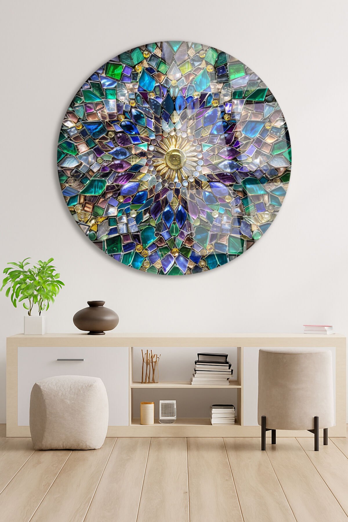 Renkli Vitray Parçalarıyla Oluşturulmuş Yuvarlak Kırılmaz Cam Tablo Modern Tablo Ev Hediyesi Tablo Yeşil