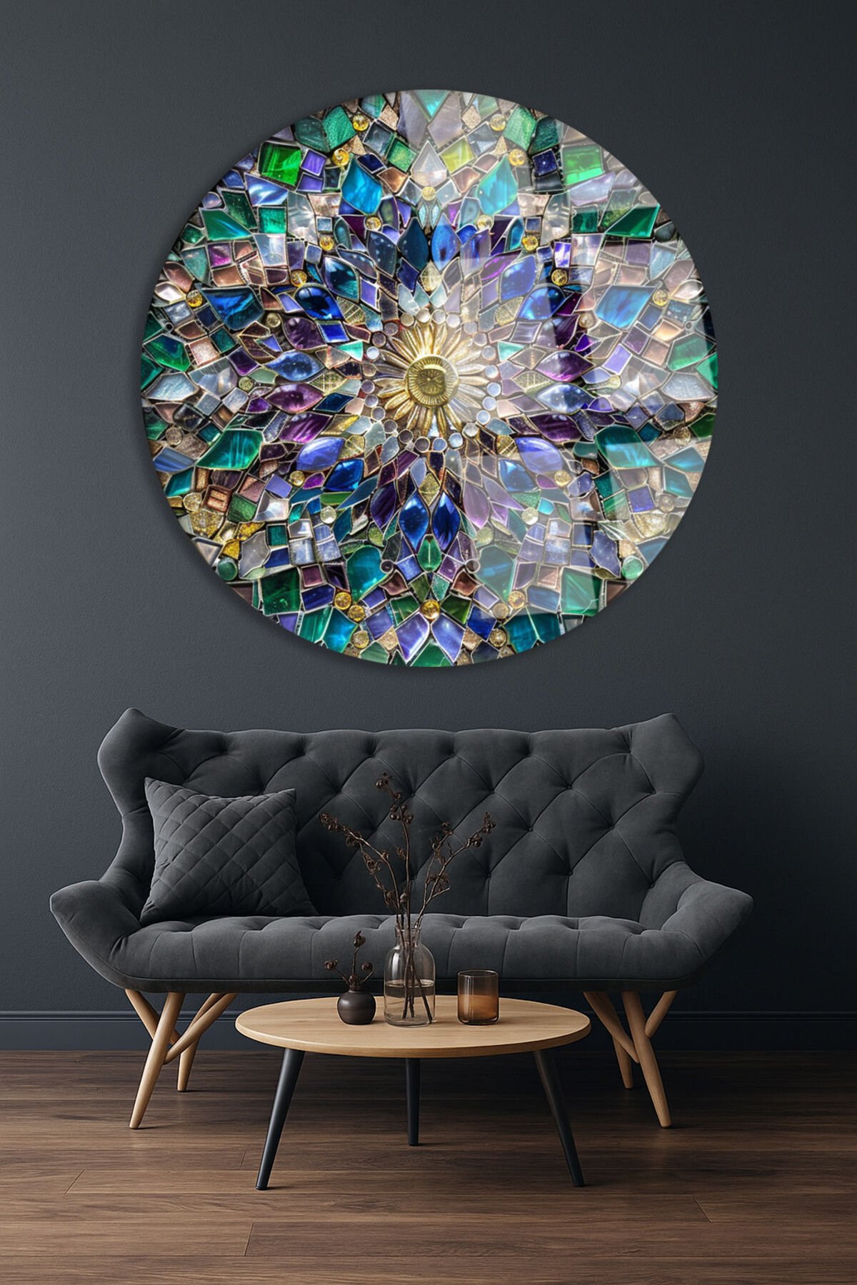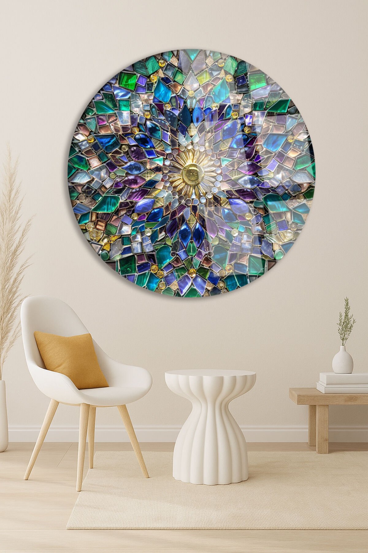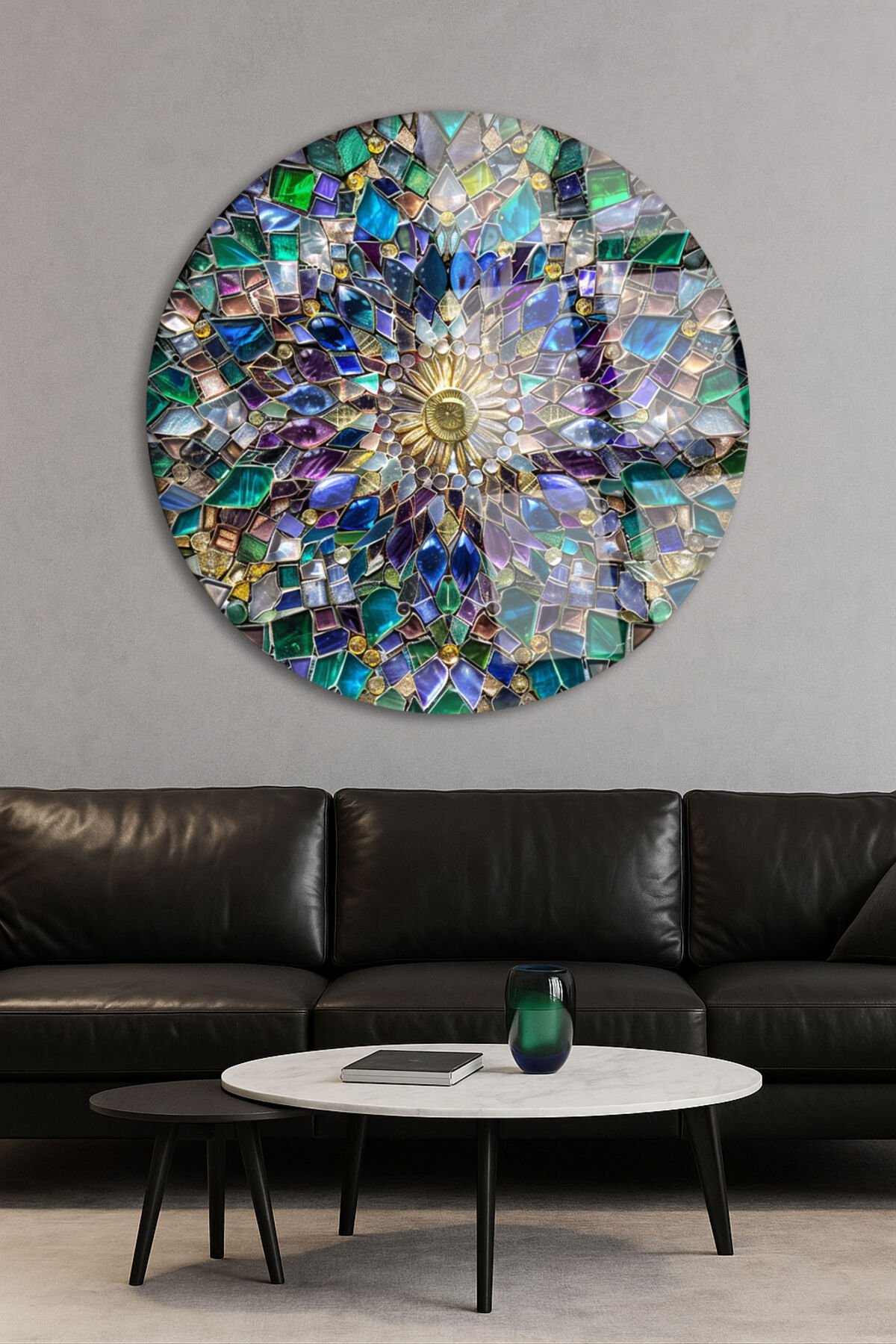Renkli Vitray Parçalarıyla Oluşturulmuş Yuvarlak Kırılmaz Cam Tablo Modern Tablo Ev Hediyesi Tablo Yeşil