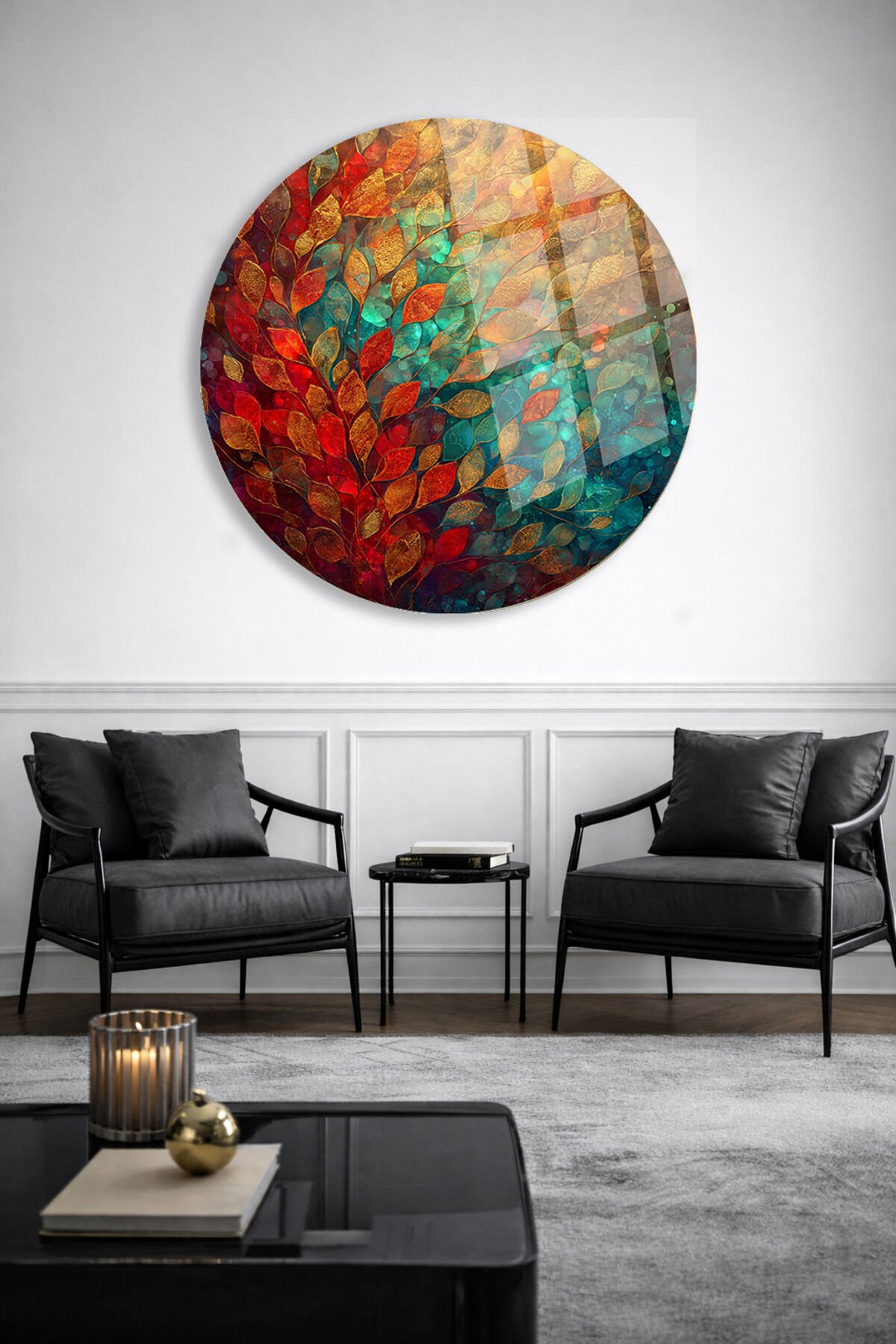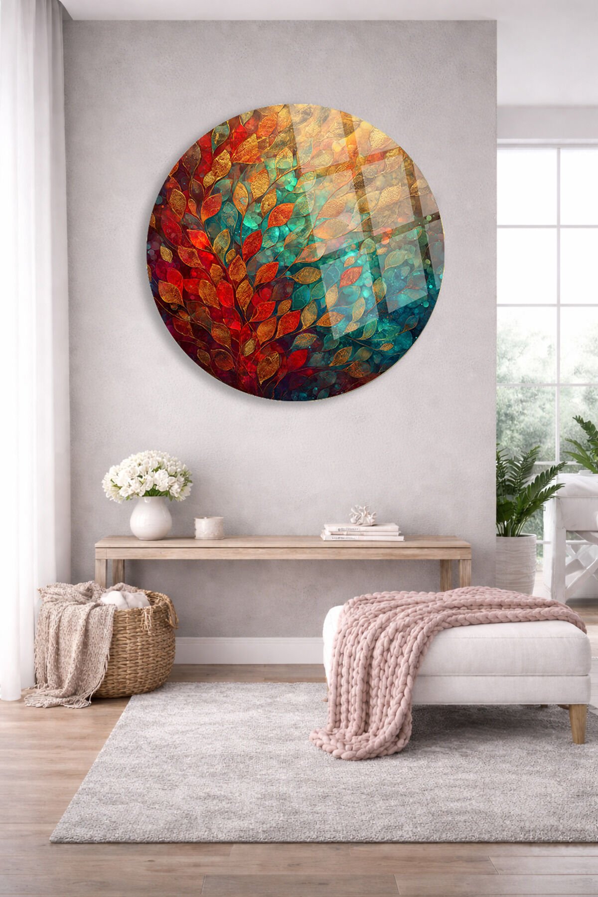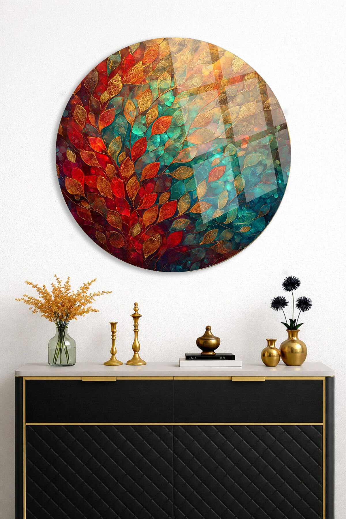 RENKLİ YAPRAK DESENLİ SANATSAL KIRILMAZ CAM TABLO DOĞA TEMALI EV OFİS HEDİYESİ ULTRA CANLI RENKLER Turkuaz
