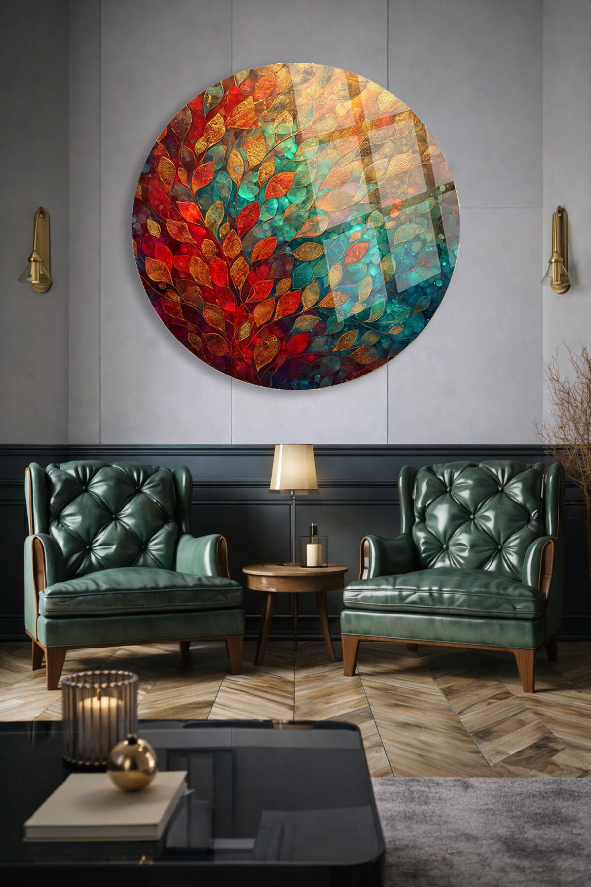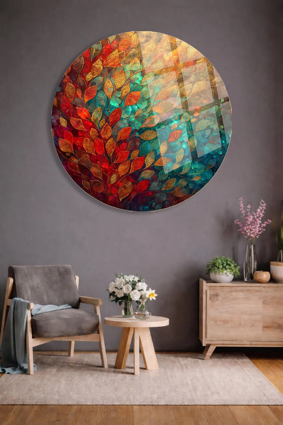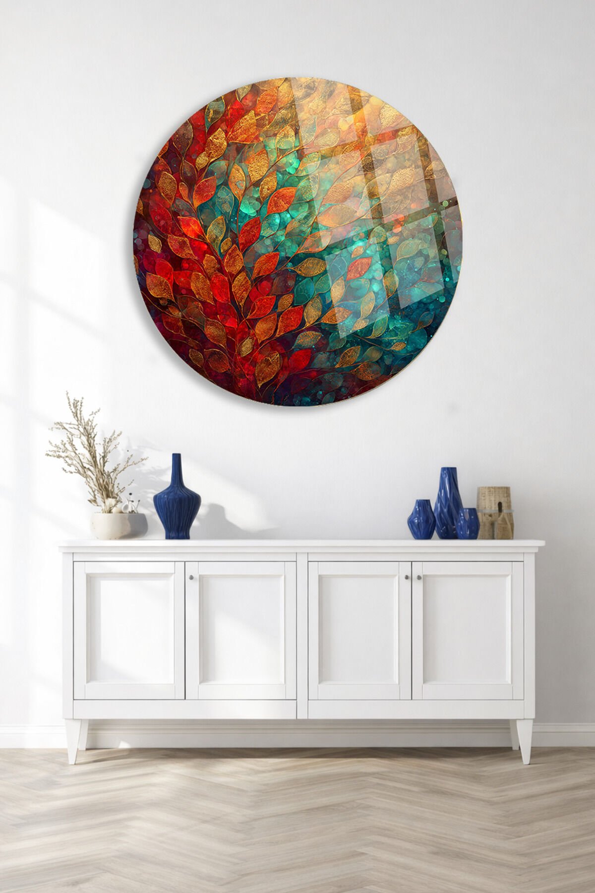 RENKLİ YAPRAK DESENLİ SANATSAL KIRILMAZ CAM TABLO DOĞA TEMALI EV OFİS HEDİYESİ ULTRA CANLI RENKLER Turkuaz