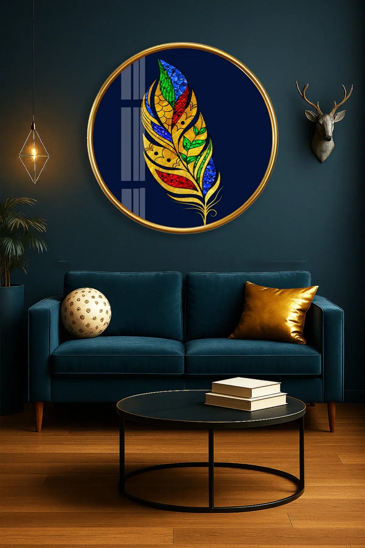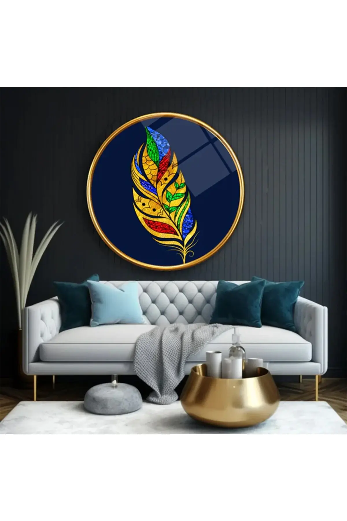 RENKLİ YAPRK GOLD DETAY YUVARLAK KIRILMAZ MODERN CAM TABLO EV HEDİYESİ LÜKS ODA TABLOSU Lacivert