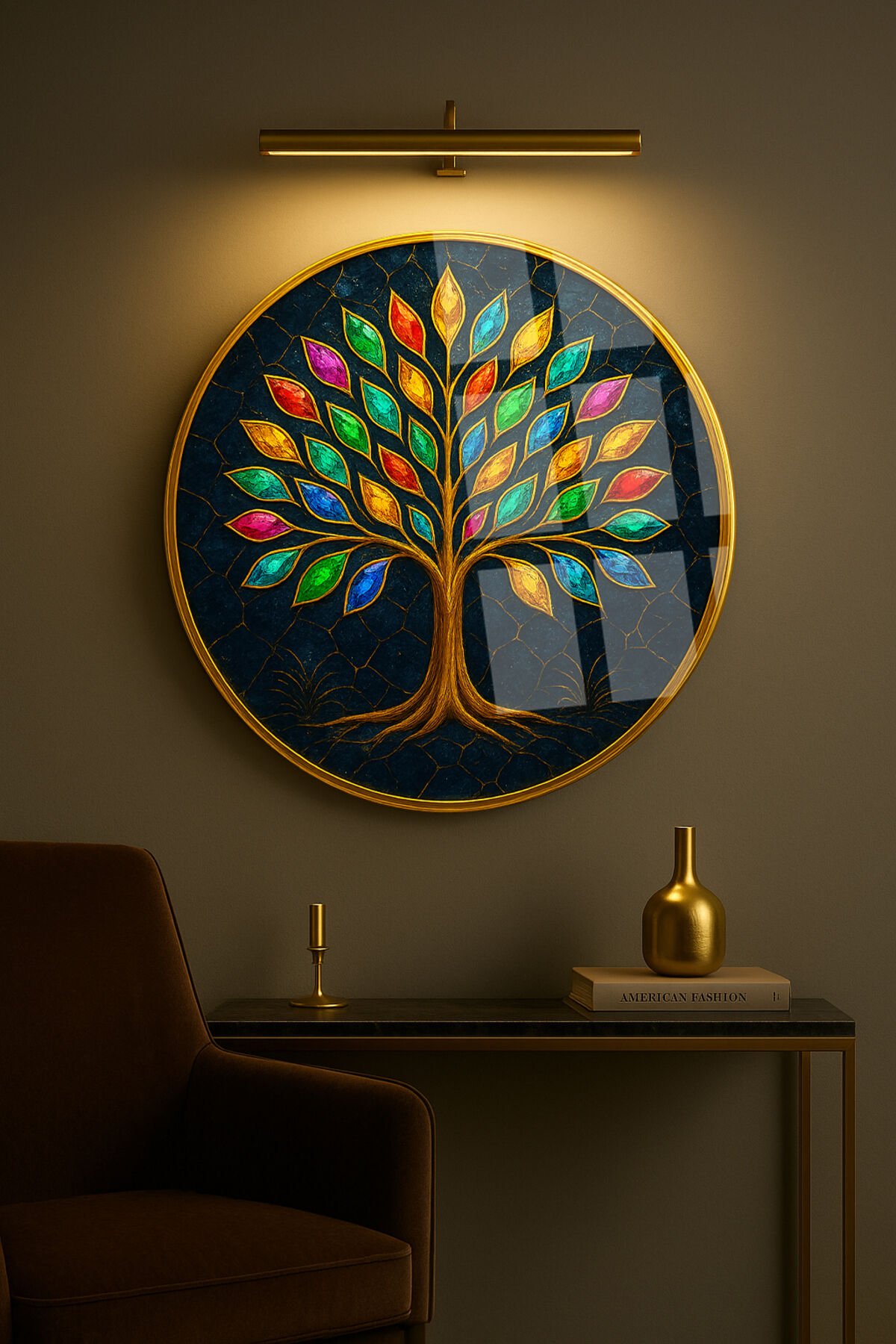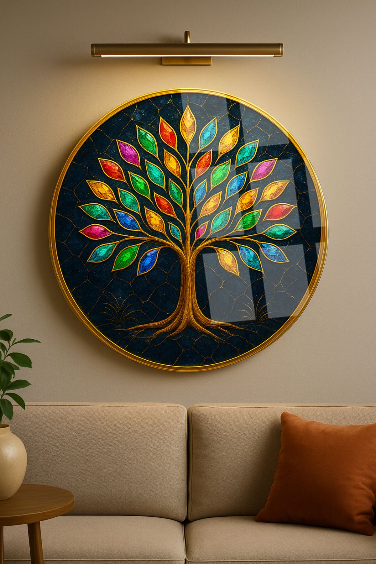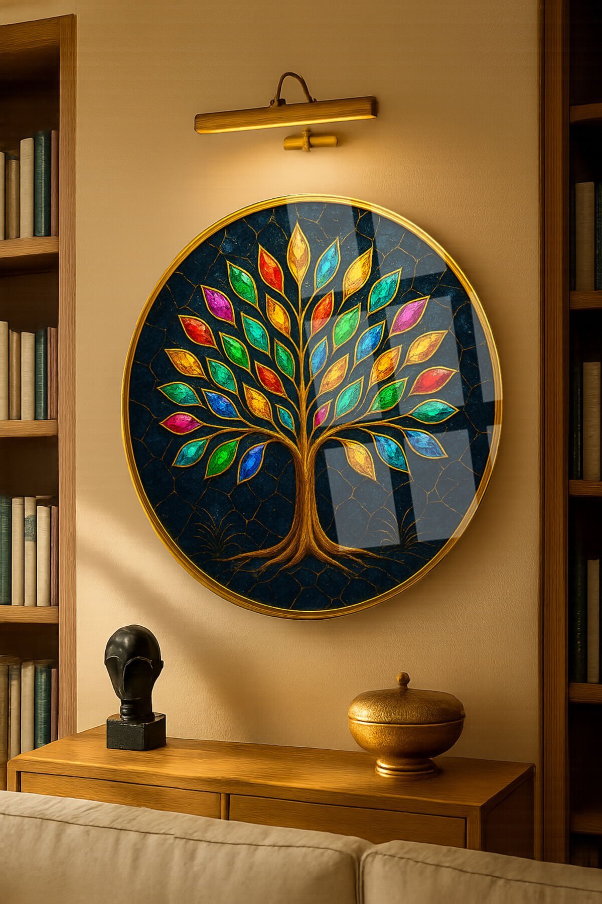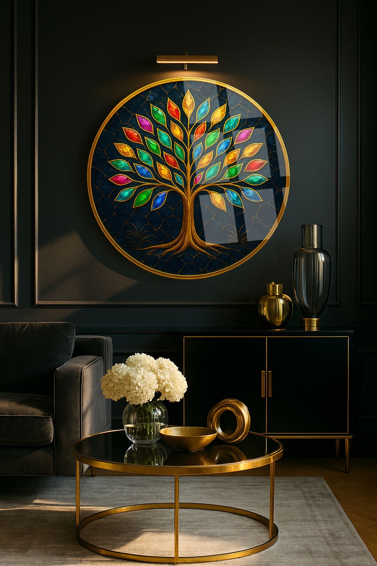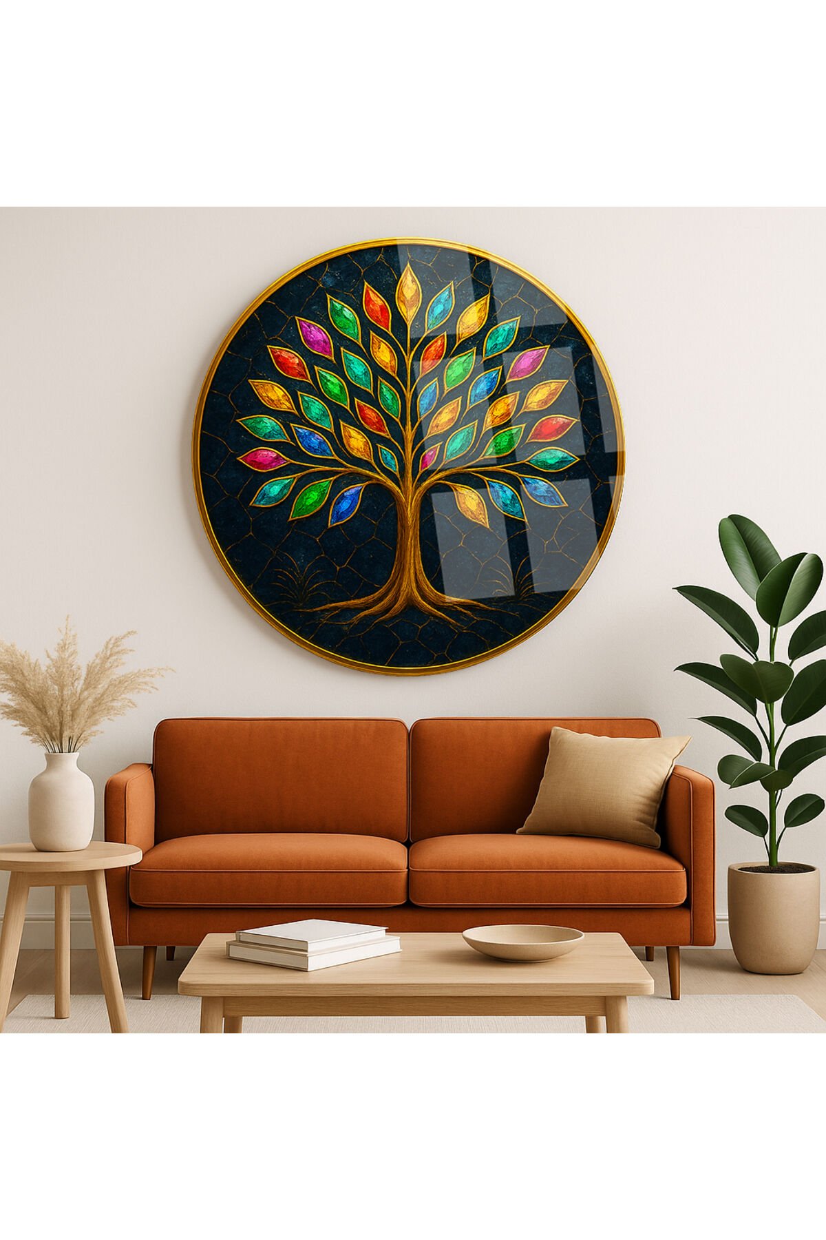 RENKLİ ZÜMRÜT YAPRAKLI AĞAÇ TASARIMI KIRILMAZ YUVARLAK CAM TABLO LÜKS EV HEDİYESİ ULTRA CANLI RENKLİ