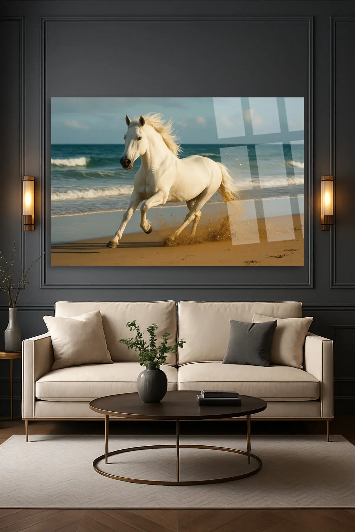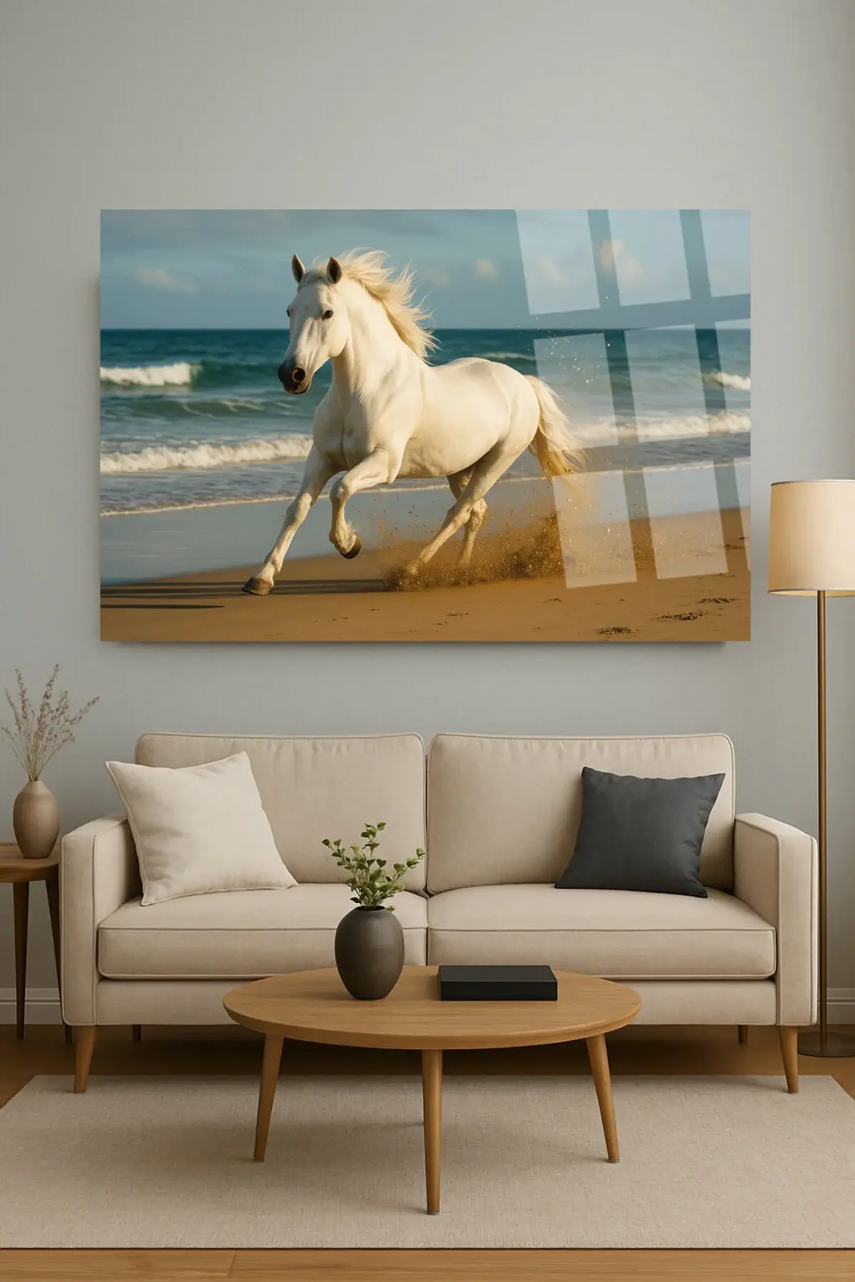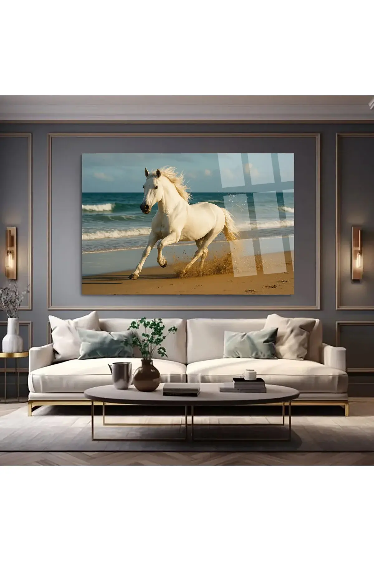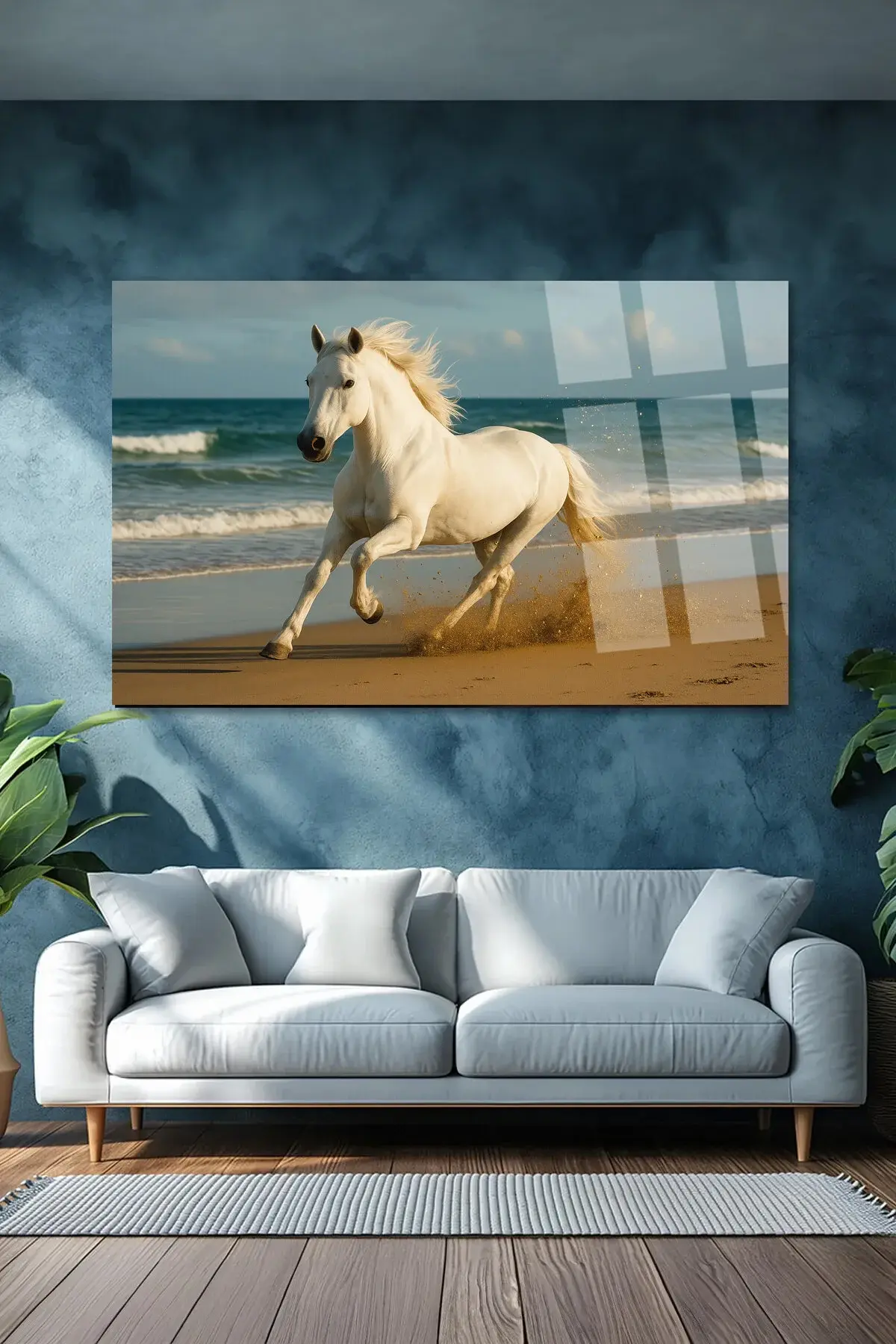 SAHİLDE KOŞAN ASİL BEYAZ AT KIRILMAZ CAM TABLO LÜKS MODERN TABLO EV HEDİYESİ Mavi