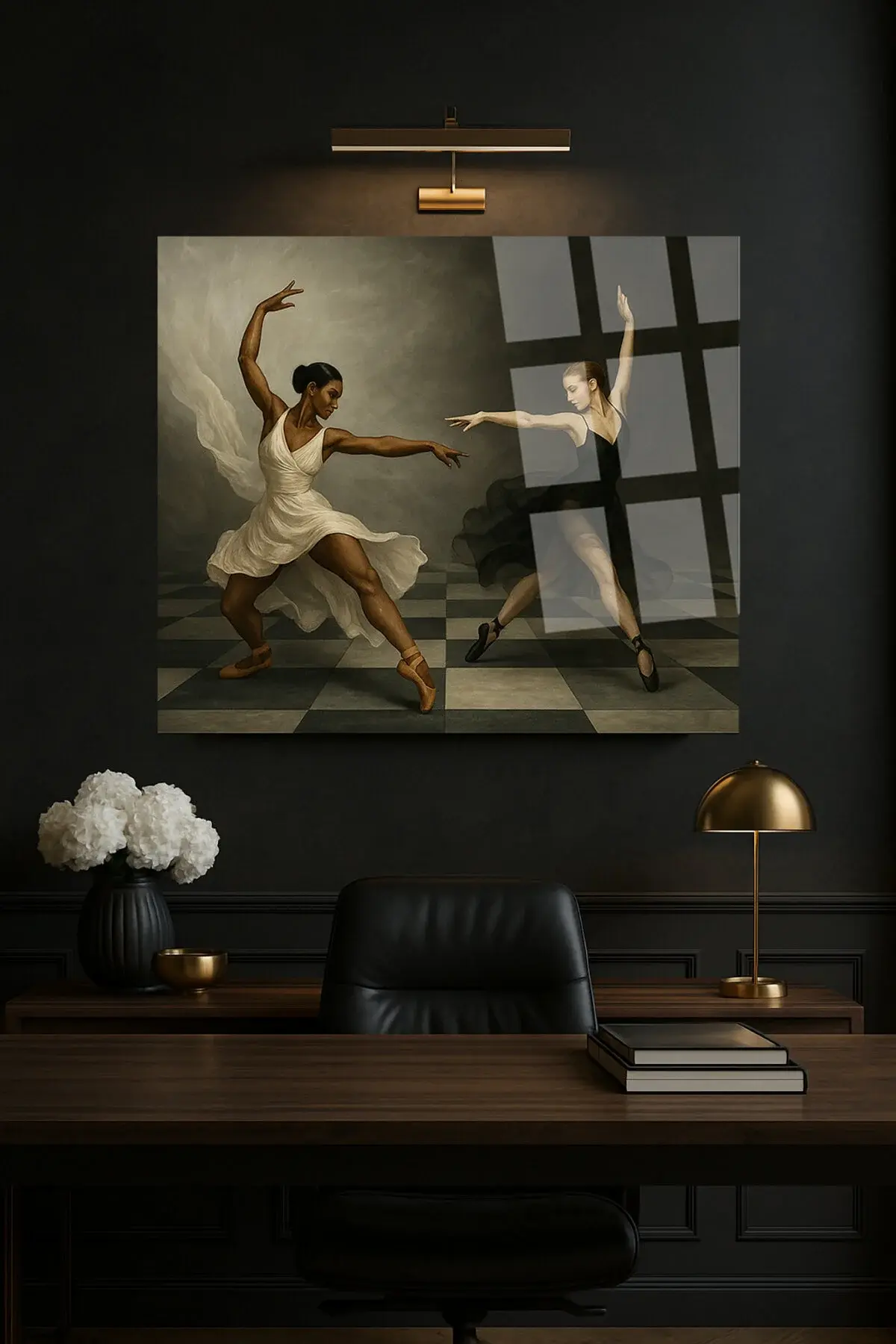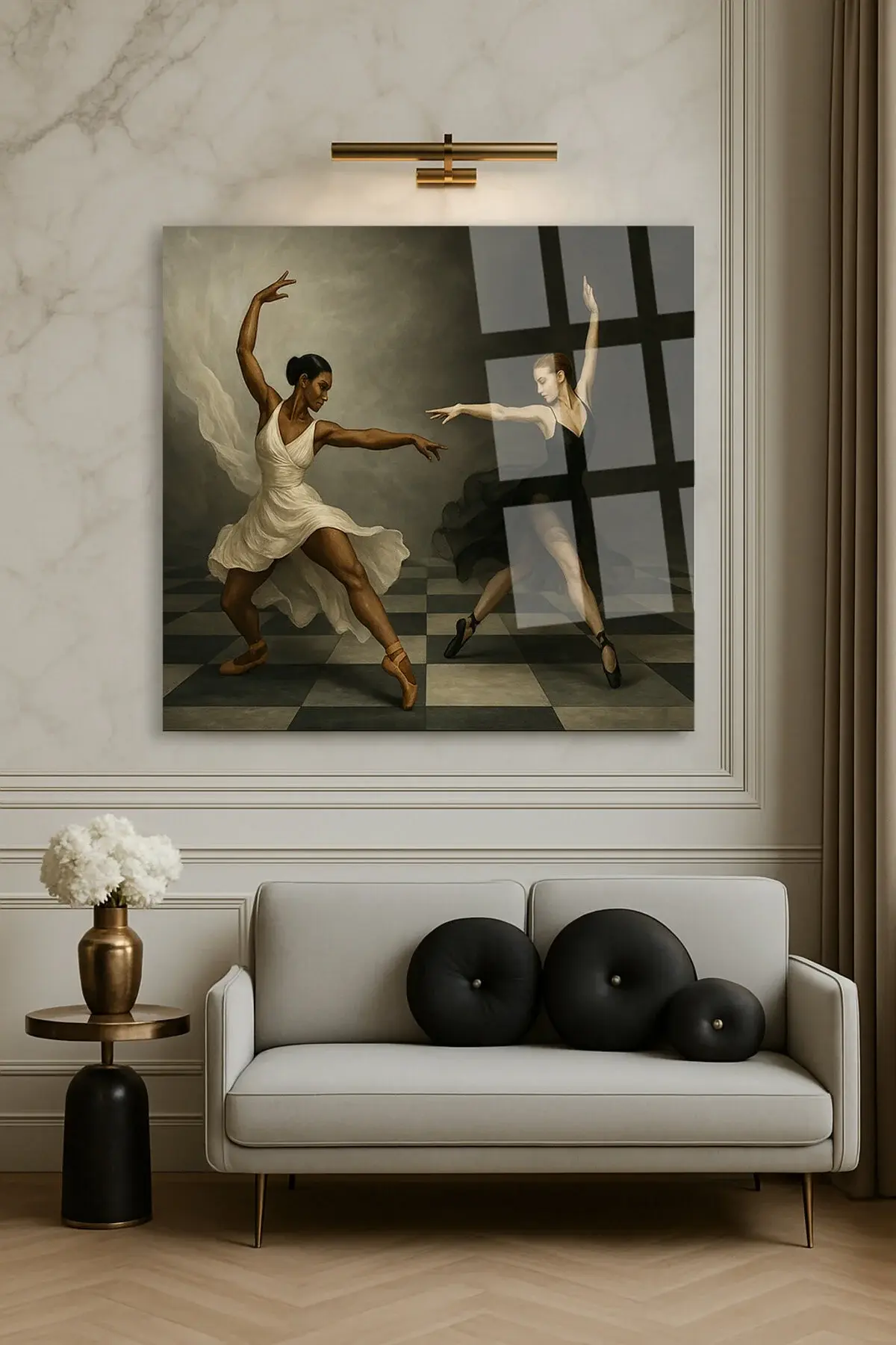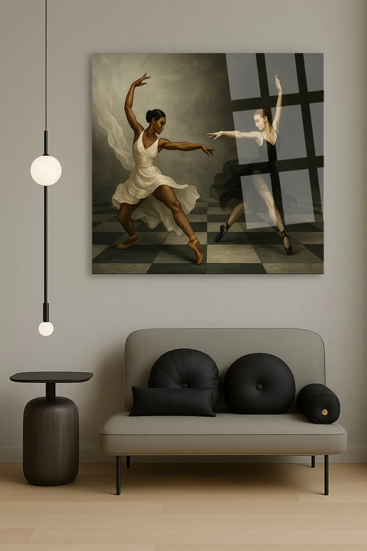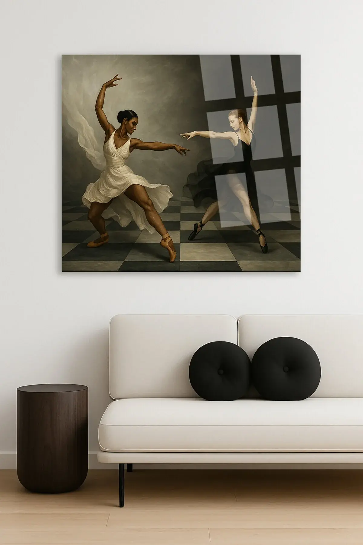 SANTRANÇ TAHTASI ÜZERİNDE DANS EDEN KADINLAR TASARIMI KIRILMAZ MODERN KARE CAM TABLO Siyah