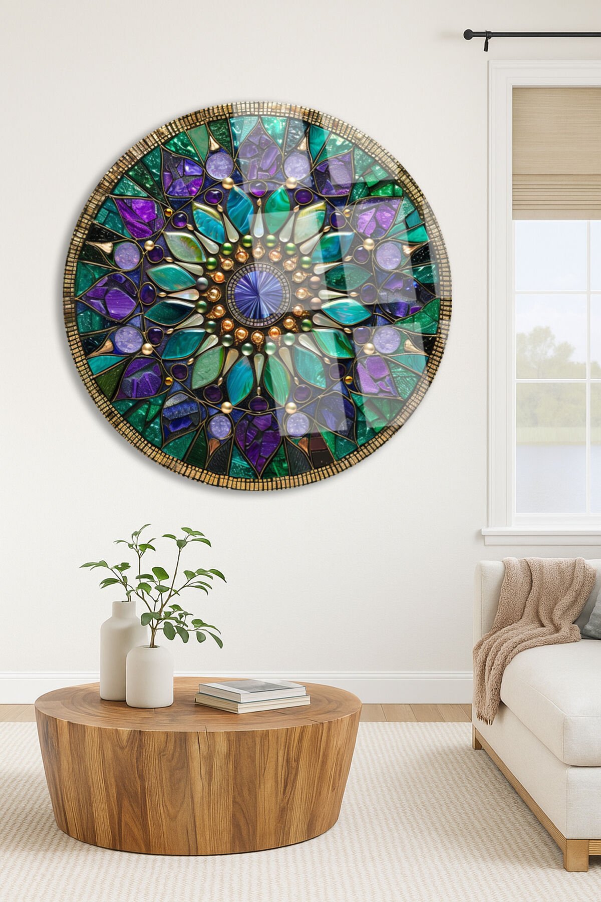 Saray Motifli Taş Efektli Çiçek Deseni Yuvarlak Kırılmaz Cam Tablo Modern Tablo Ev Hediyesi Tablo Turkuaz