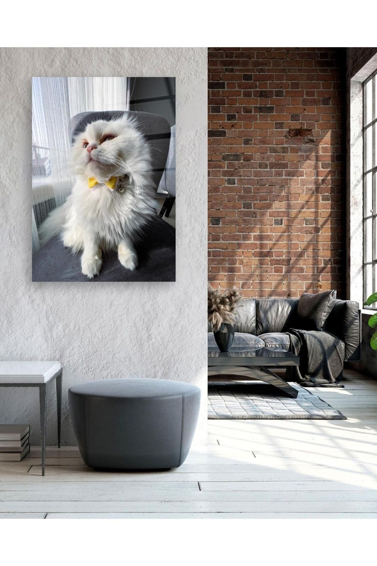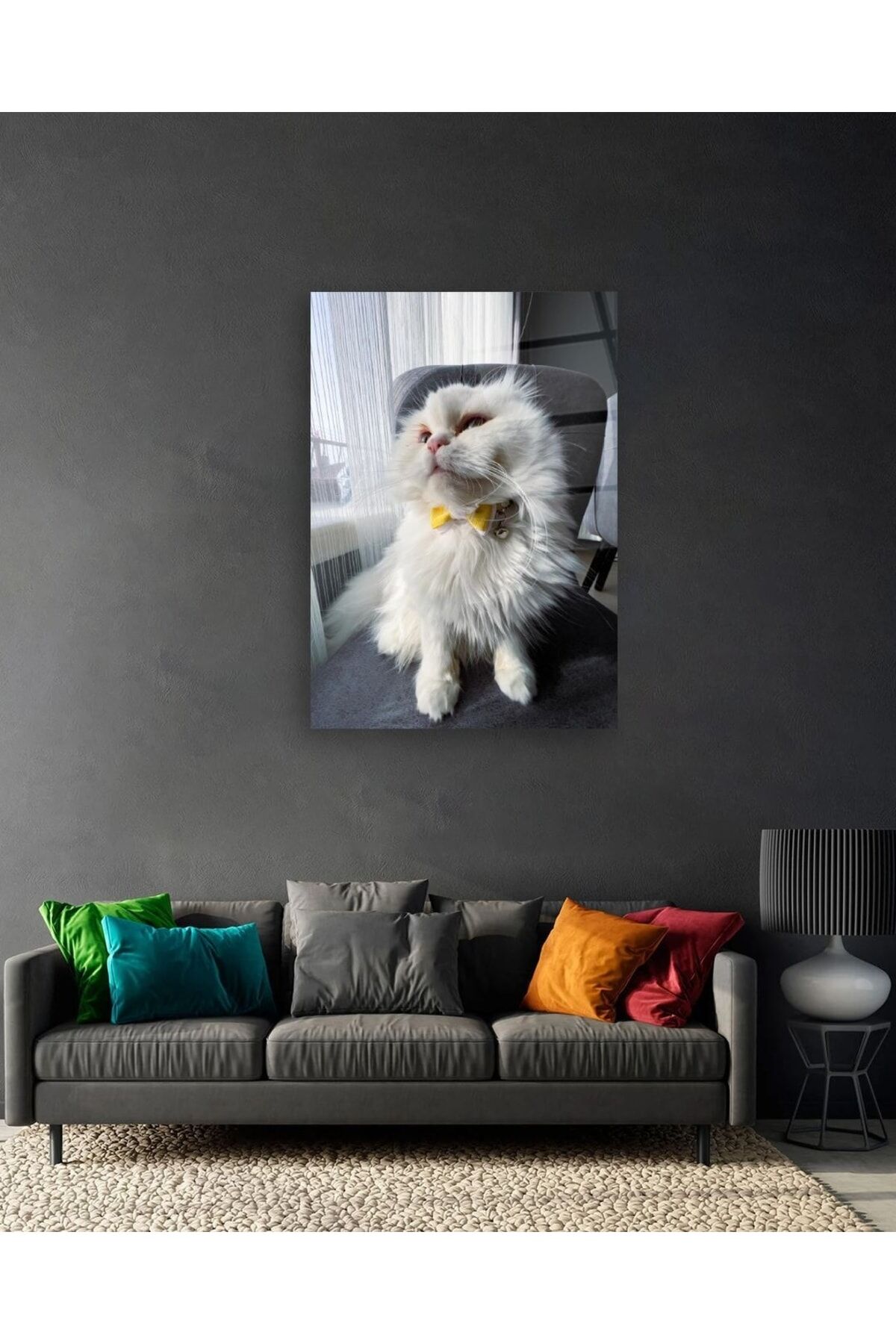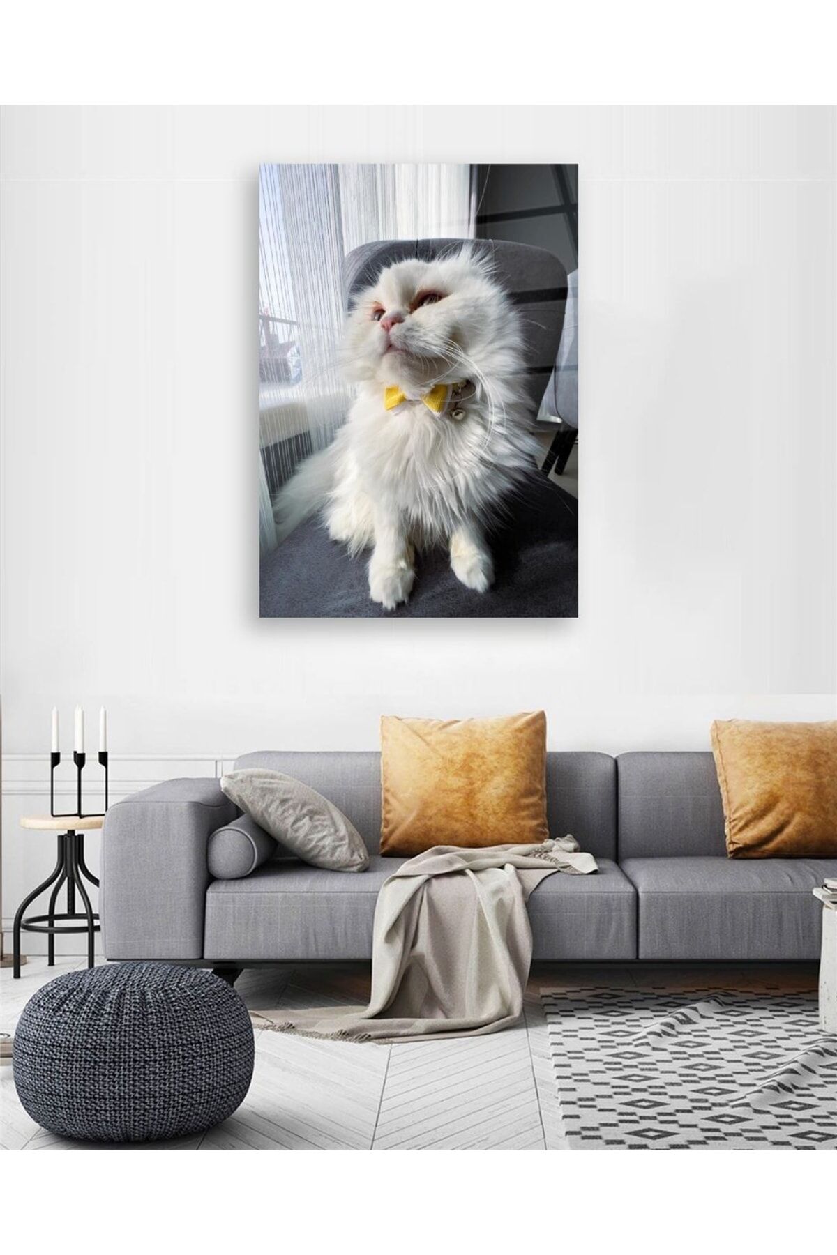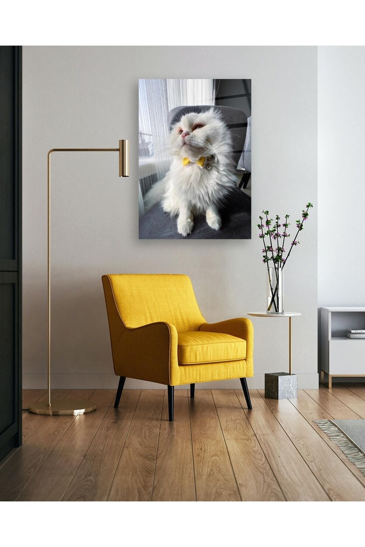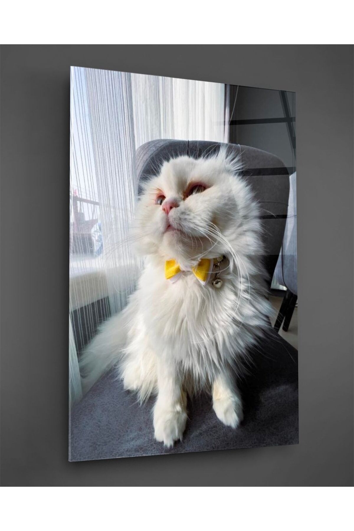 Sarı Papyonlu Beyaz Kedi Cam Tablo Renkli