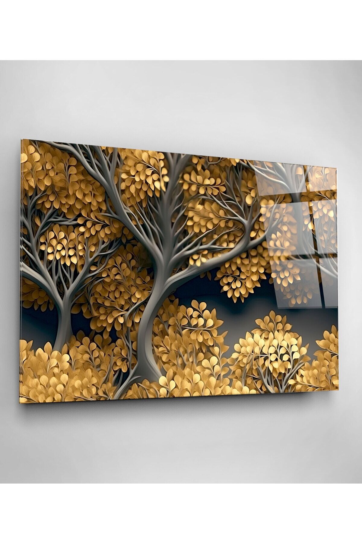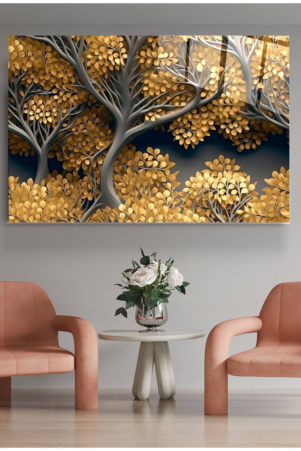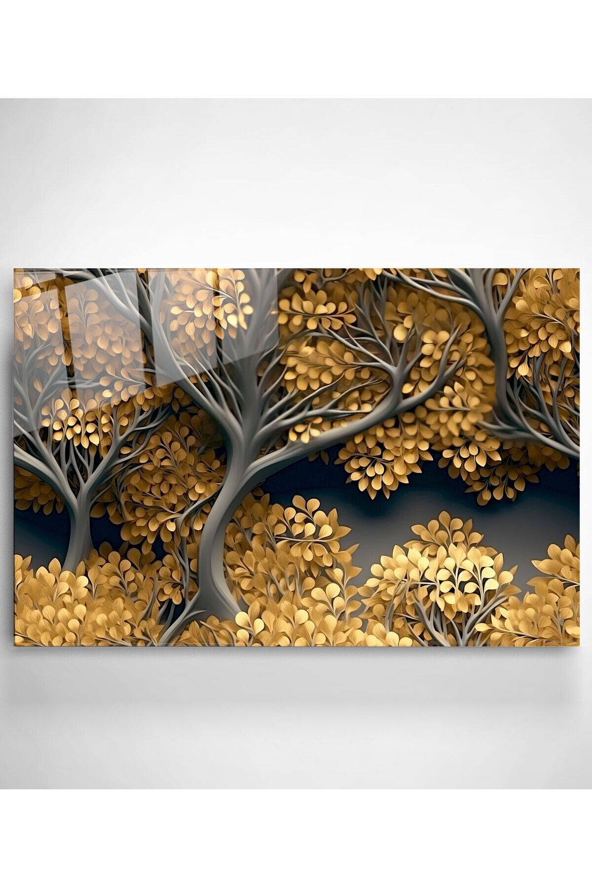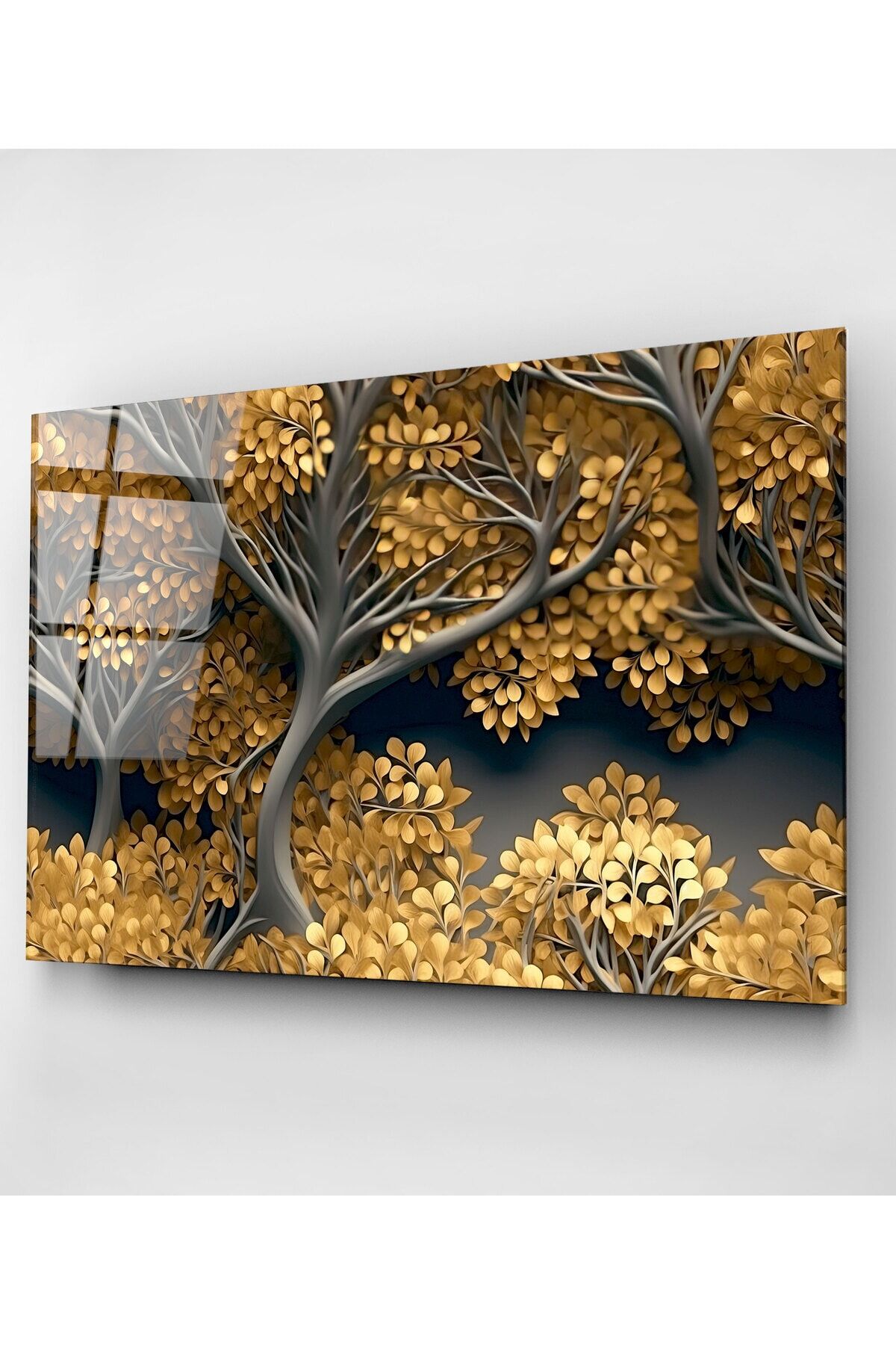Sarı Yapraklı Ağaç Cam Tablo, Dekoratif Cam Tablo