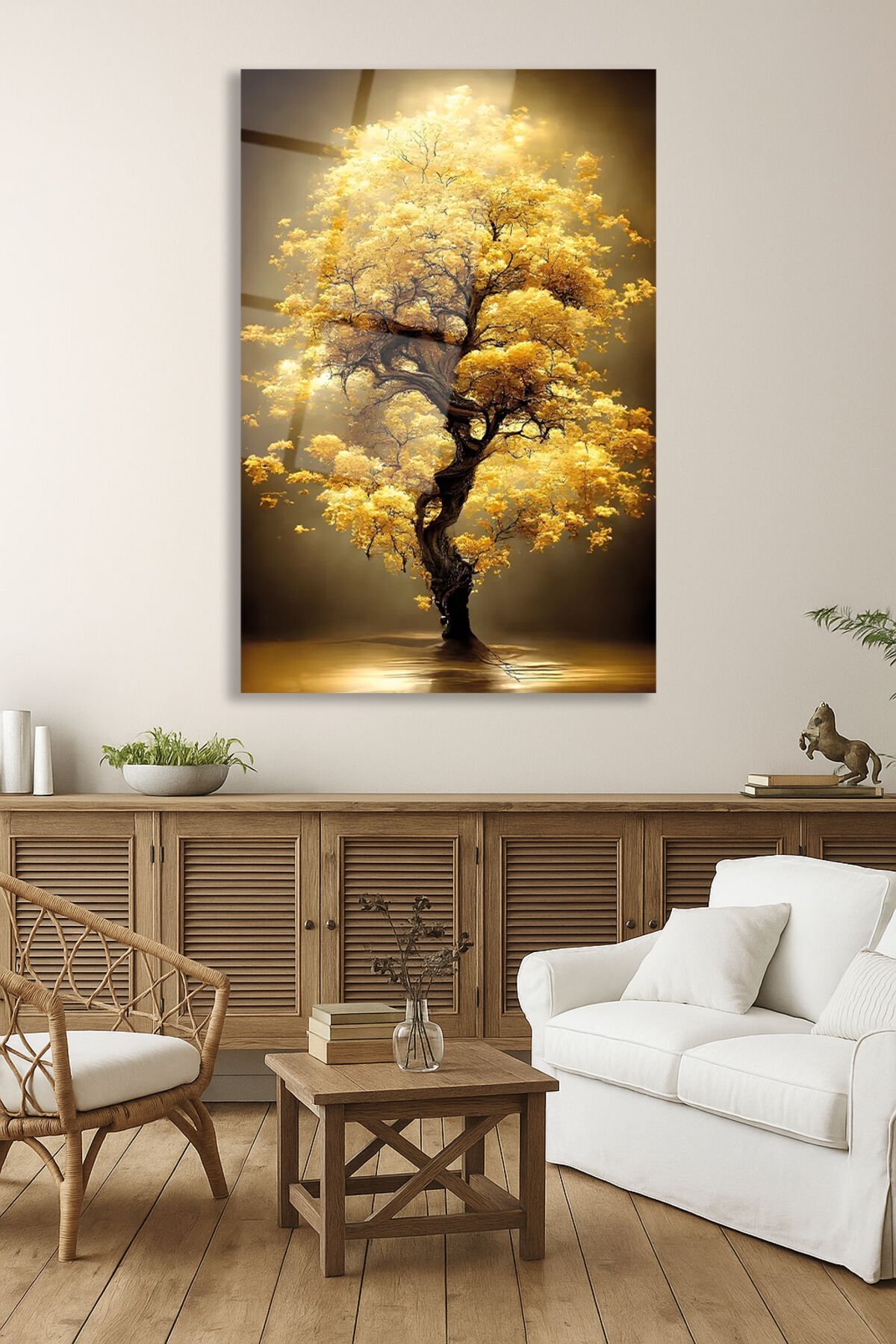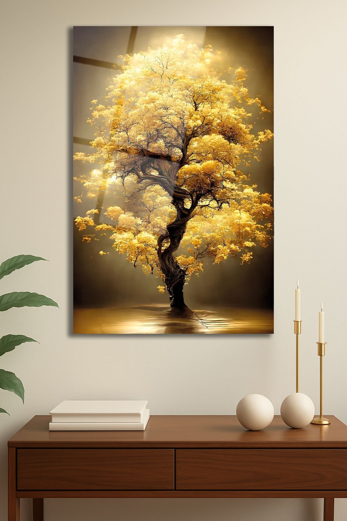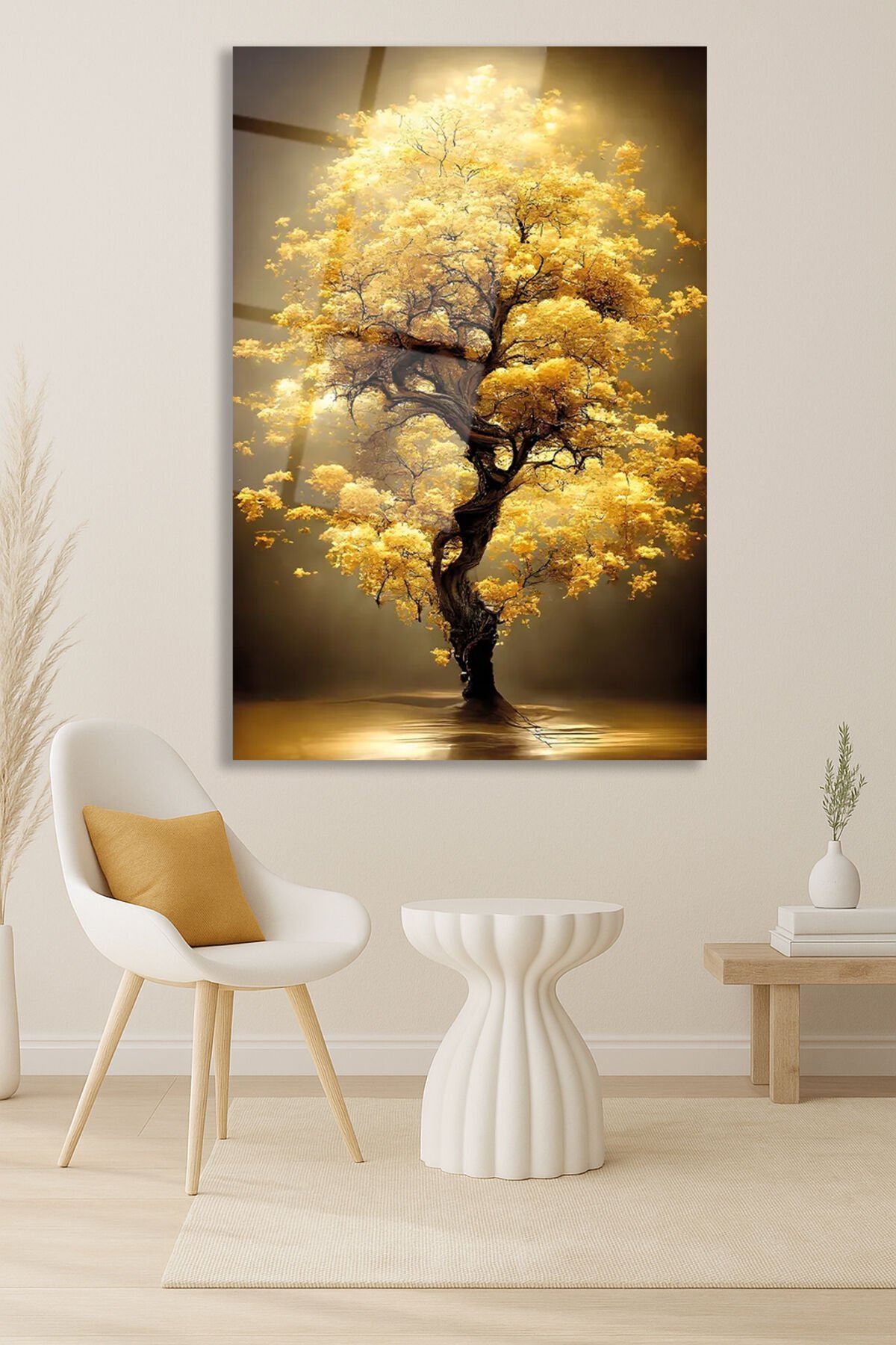 Sarı Yapraklı Ağaç Manzara Cam Tablo, Modern Ev Ofis Salon Duvar Dekoru Hediyelik Büyük Tablo Dekor Sarı Kahverengi