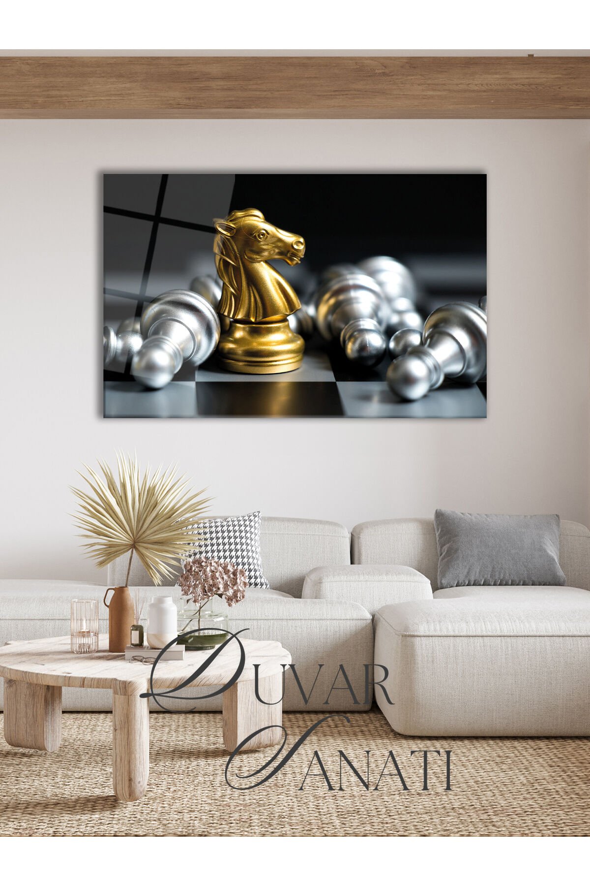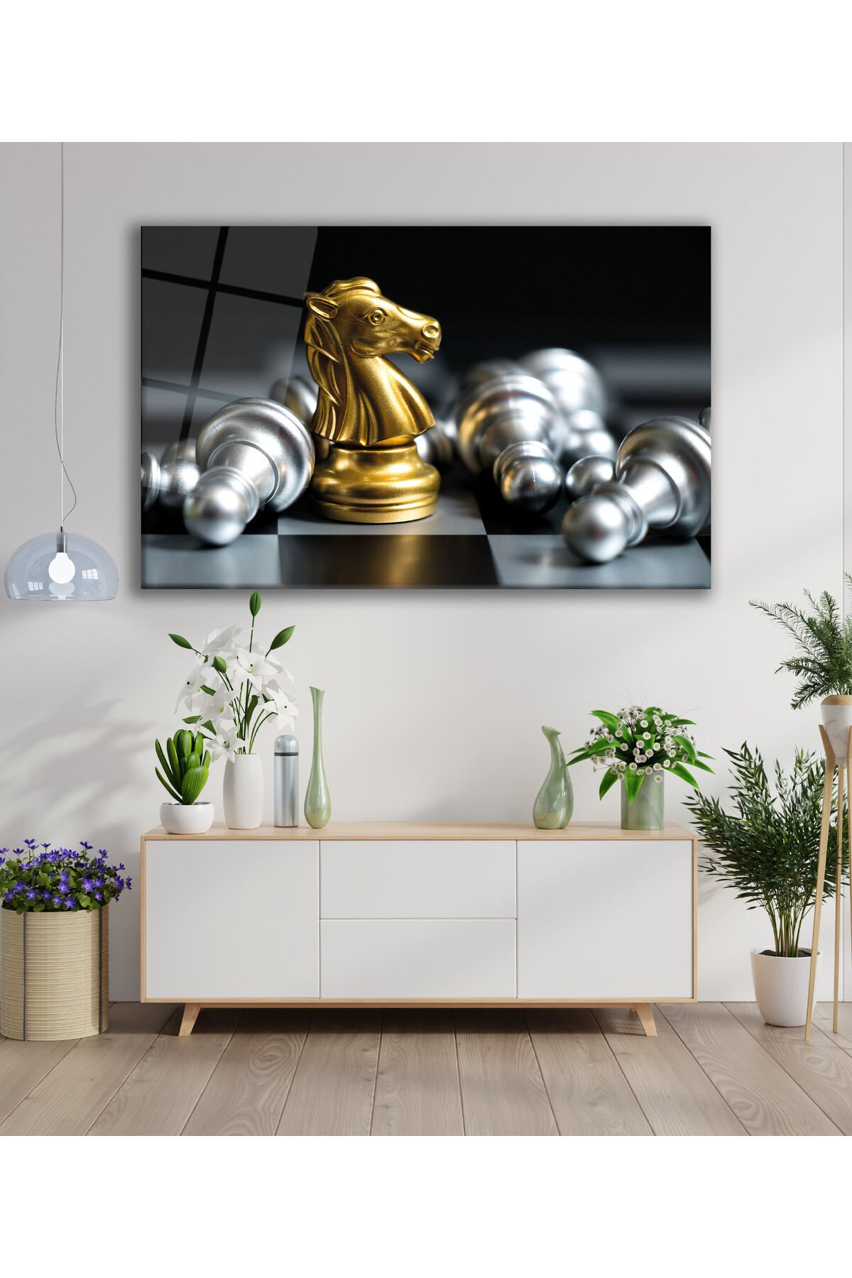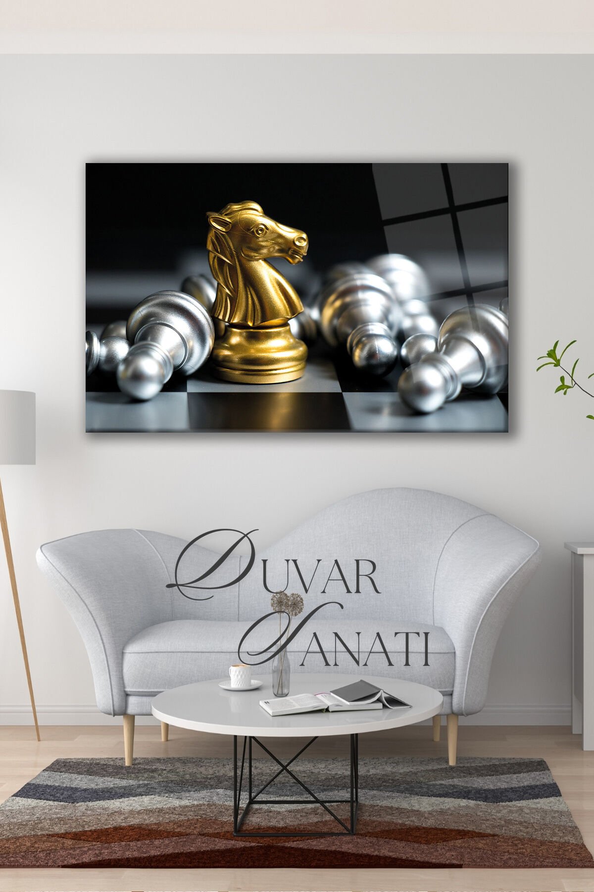 Satranç At'ın Savaşı Yatay Cam Tablo, Modern Ev Salon Ofis Dekorasyonu Hediyelik Büyük Duvar Dekoru Gold Gümüş
