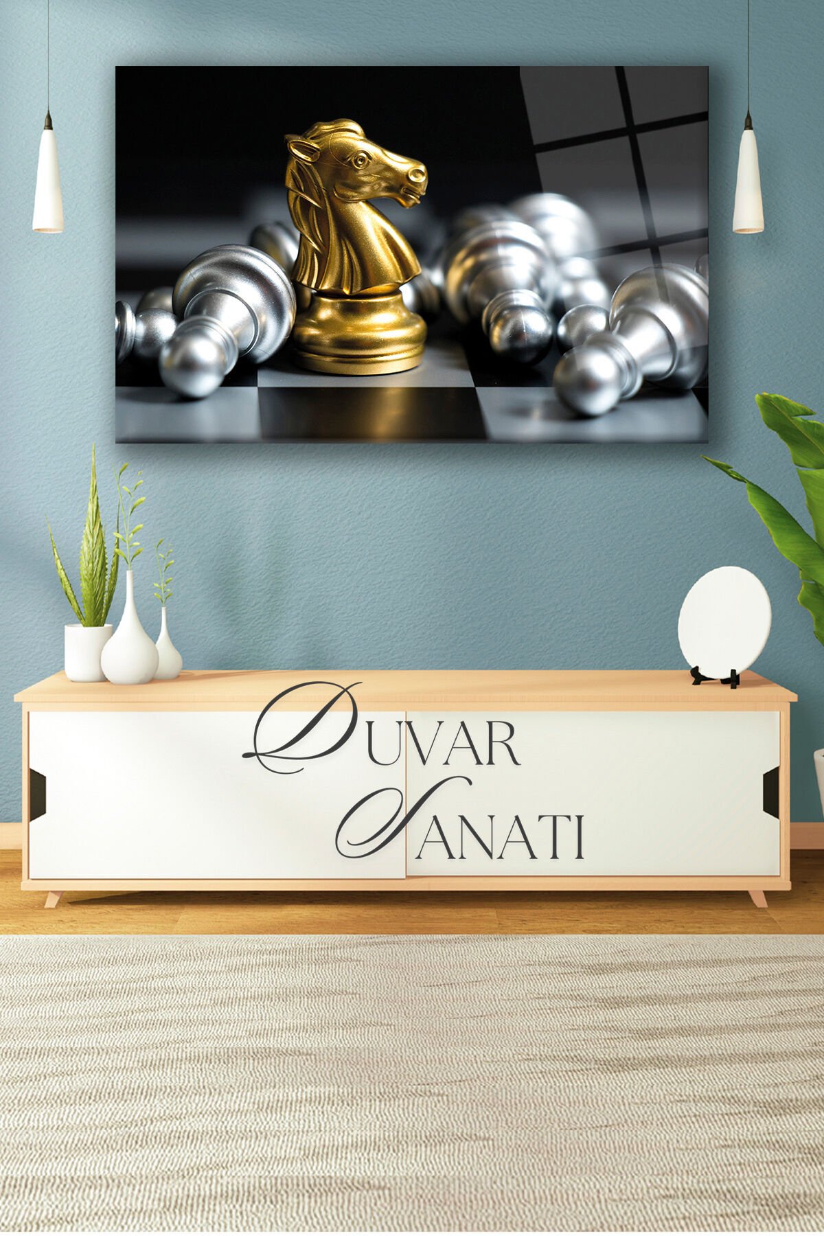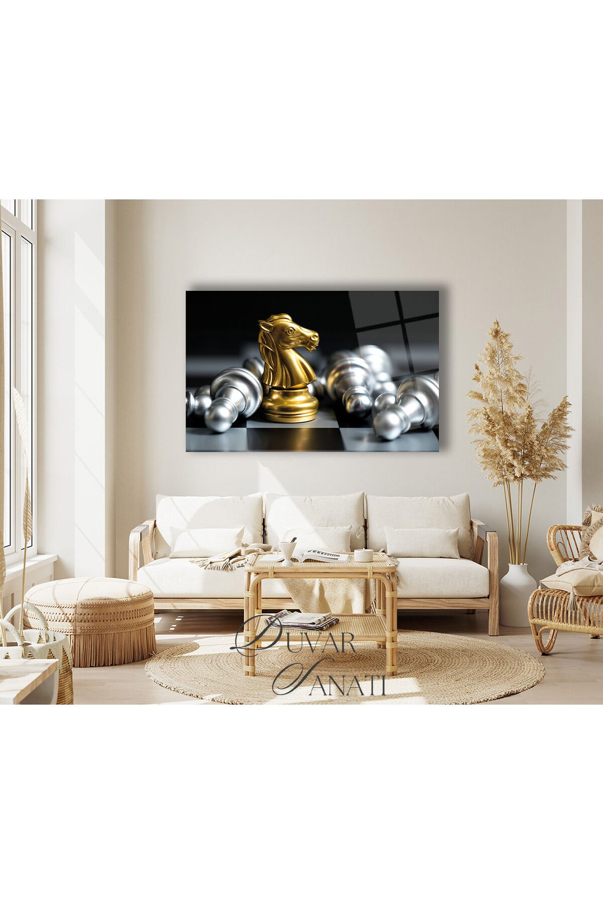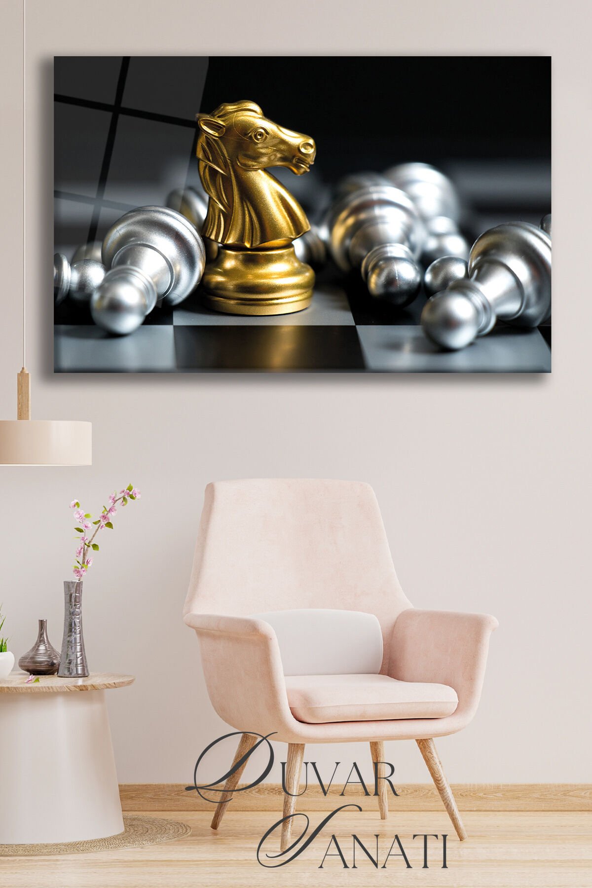 Satranç At'ın Savaşı Yatay Cam Tablo, Modern Ev Salon Ofis Dekorasyonu Hediyelik Büyük Duvar Dekoru Gold Gümüş