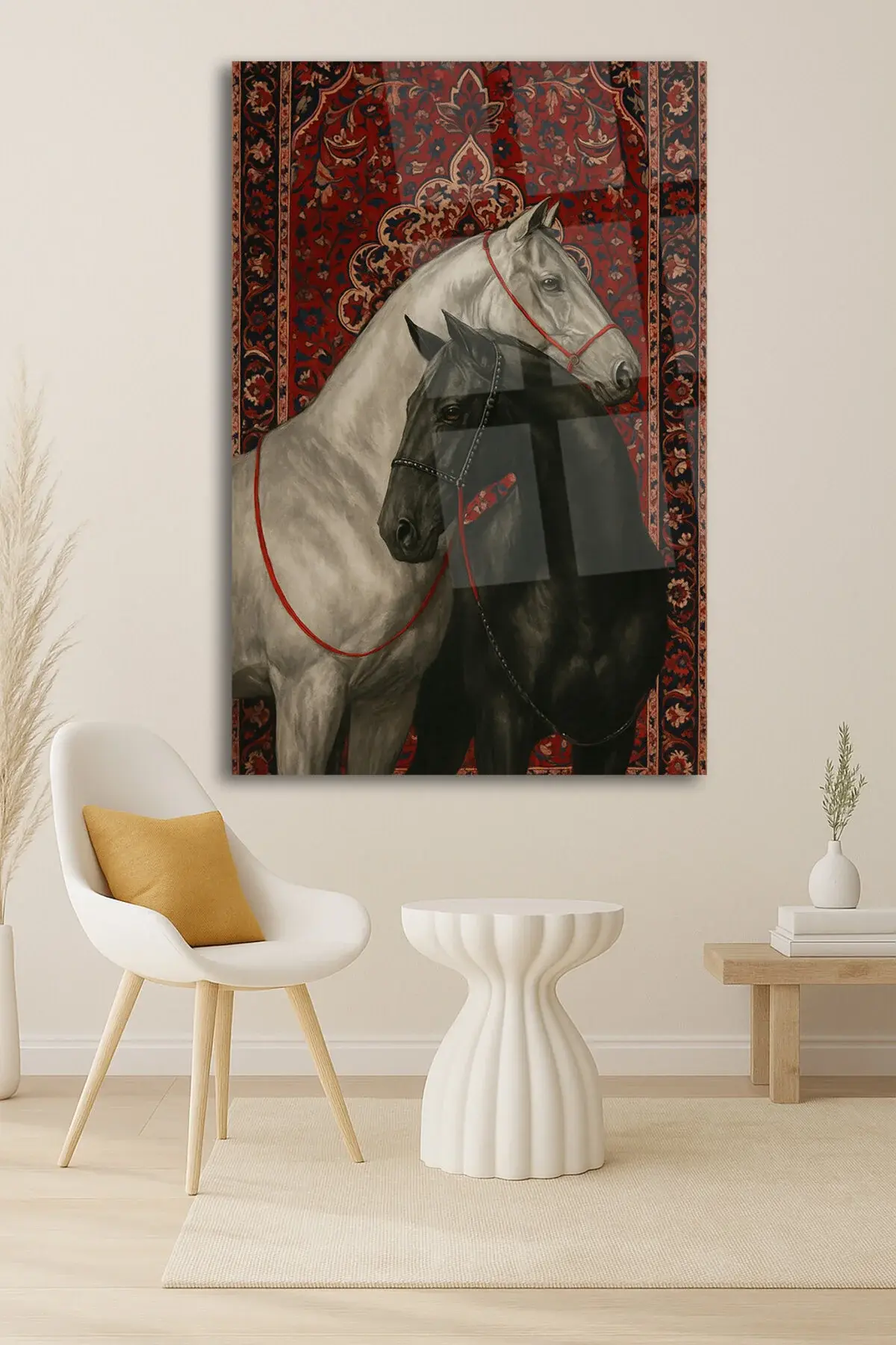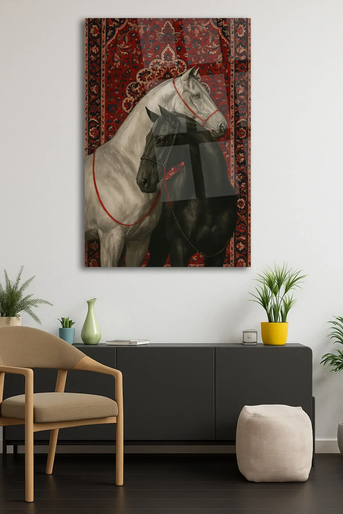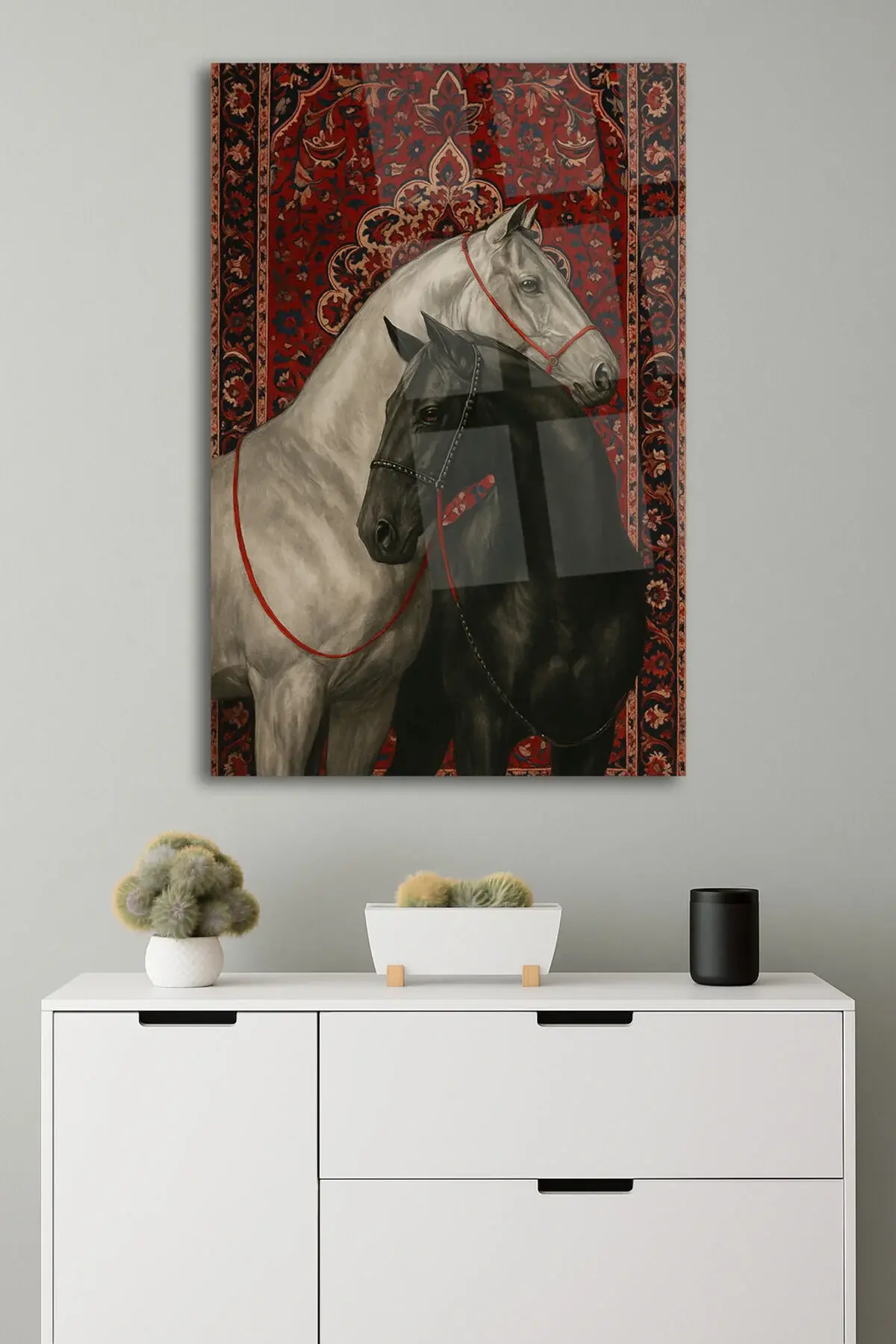SEVGİLİ ATLAR AŞK TEMALI KIRILMAZ LÜKS CAM TABLO AT TABLOSU İRAN HALISI DETAYLI LÜKS HEDİYE Kırmızı
