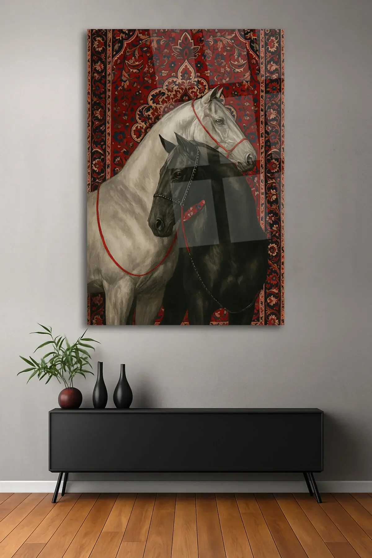 - Modern tasarımıyla dikkat çeken bu cam tablo, sevgili atların temalı görüntüsüyle evinizin dekorasyonuna şıklık katıyor.; - İran halısı detaylarıyla zenginleştirilmiş tasarımı, geleneksel motifleri modern çizgilerle buluşturarak otantik bir atmosfer yaratıyor.; - Çerçevesiz yapısı sayesinde duvarınıza kolayca uyum sağlayacak ve mekanınızın havasını anında değiştirecek.; - Lüks cam malzemesiyle uzun ömürlü kullanım sunarken, herhangi bir darbede bile kırılmayan dayanıklılığıyla ön plana çıkıyor.